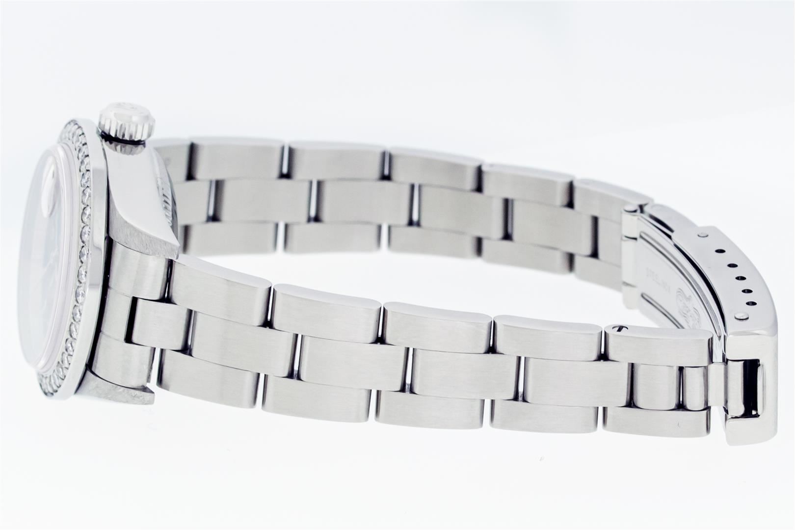 One Ladies Pre Owned Quickset Stainless Steel Rolex Datejust Polished Bright with Satin Finish, Serviced & Electronically Tested, Stainless Steel Case: 26mm, Rolex Stainless Steel Crown, Custom Bezel: New Stainless Steel Bead Set Diamond Bezel, Diamond Count: 40 Diamonds, Clarity: SI-VS, Color: G to H. Custom Crystal: New Sapphire With Magnified Date Window. Custom Hands: New Luminescent Hands. Rolex Movement: Automatic Winding Movement 2235. Rolex Dial: Black With Index Hour Markers & Dash Track. Date Window: 3 O'Clock Position Date Display, Model: Quickset Datejust. Condition: G-6 Extra Fine. Rolex Bracelet: Stainless Steel Oyster Band. Bright Polish & Satin Finish. 6.0 Inch Length, Adjustable. Standard Clasp, With Rolex Logo. This Watch Has Been Serviced Time Tested And Is In Excellent Condition It Is Free Of All Scratches And Dents.