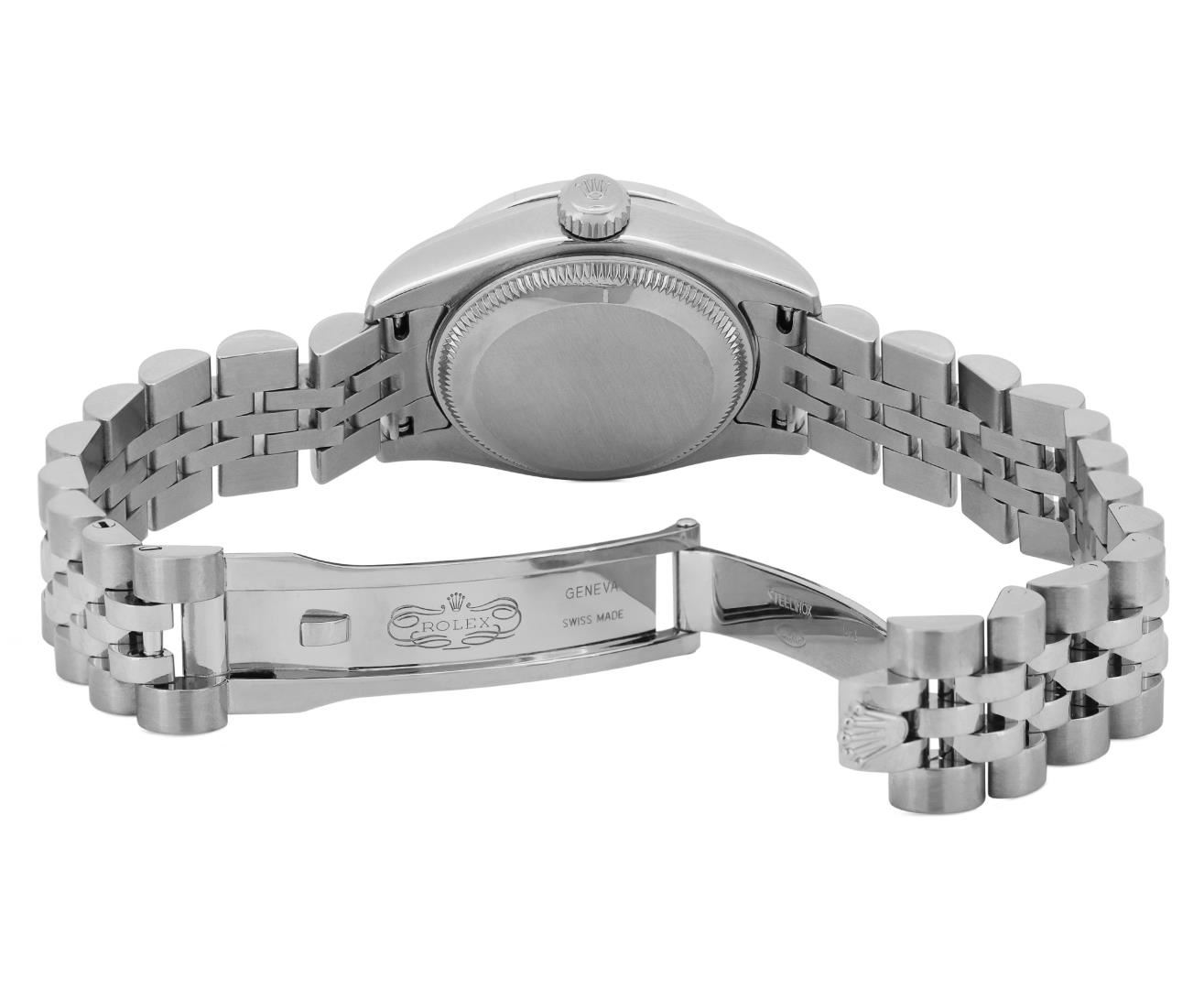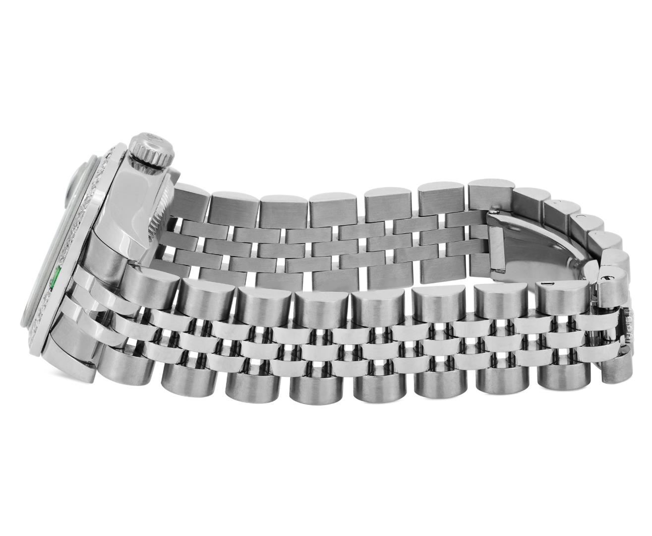 One Rolex Ladies Pre Owned Quickset Stainless Steel Date Wristwatch Polished Bright with Satin Finish, Serviced And Electronically Tested, Stainless Steel Case: 26mm, Stainless Steel Crown, Custom Bezel: New 18K White Gold Emerald Beadset Diamond Bezel, Diamond + Gem Count: 36 Diamonds + 4 Emeralds. Crystal: Sapphire With Magnified Date Window. Hands: Luminescent Hands. Rolex Movement: 2235 Automatic Winding Movement. Rolex Dial: Factory Black With Index Hour Markers And Dash Tracks. Date Window: 3 O'Clock Position Date Display, Model: Sapphire Quickset Date. Condition: G-6 Extra Fine. Rolex Bracelet: Stainless Steel Jubilee Band. Bright Polish & Satin Finish. 6.0 Inch Length, Adjustable. Hidden Clasp, With Rolex Logo. This Watch Has Been Serviced And Time Tested. It Is In Excellent Condition, Free Of All Scratches And Dents. This Watch Comes With A Rolex Box.