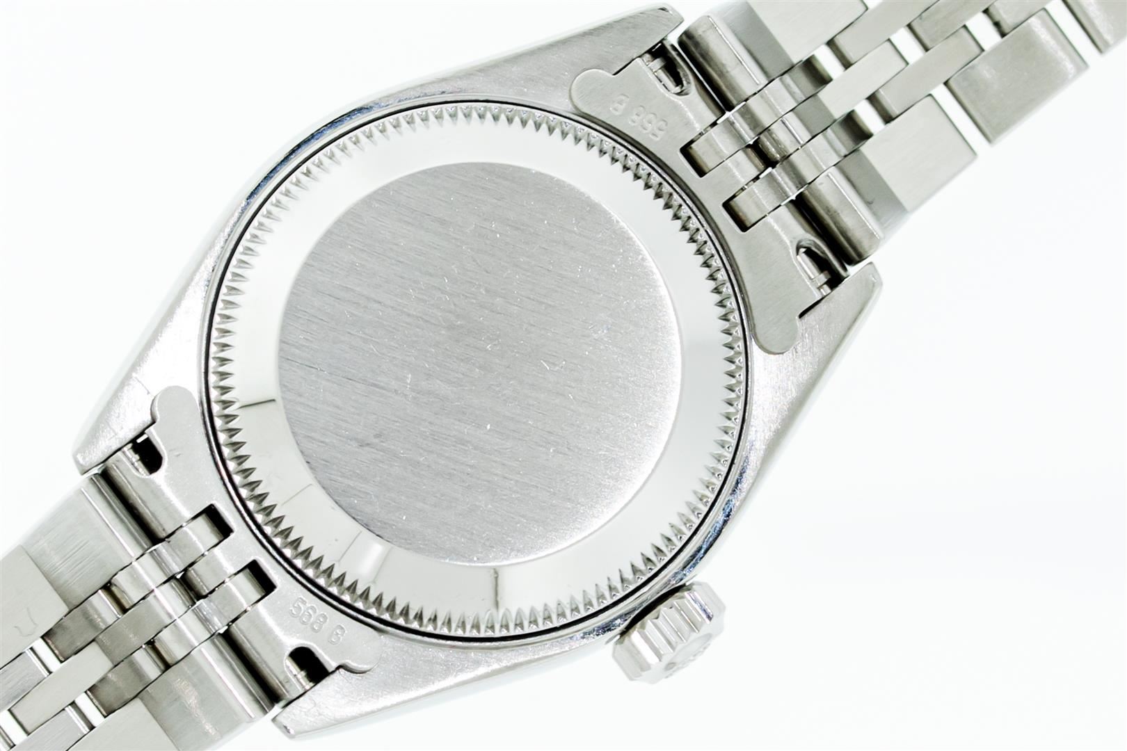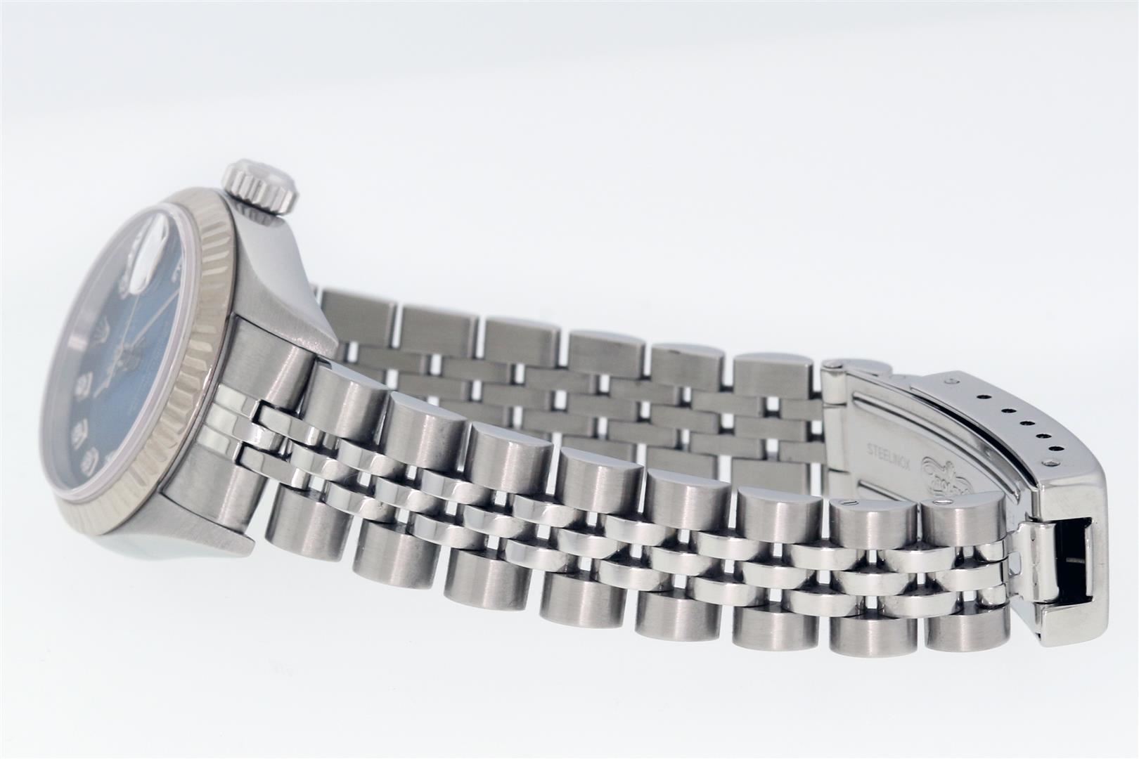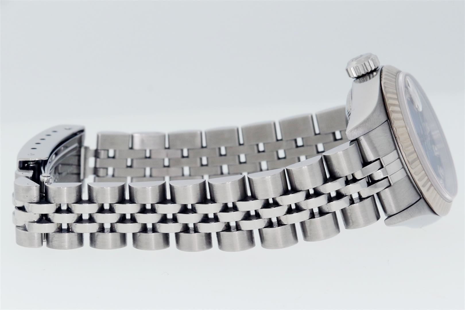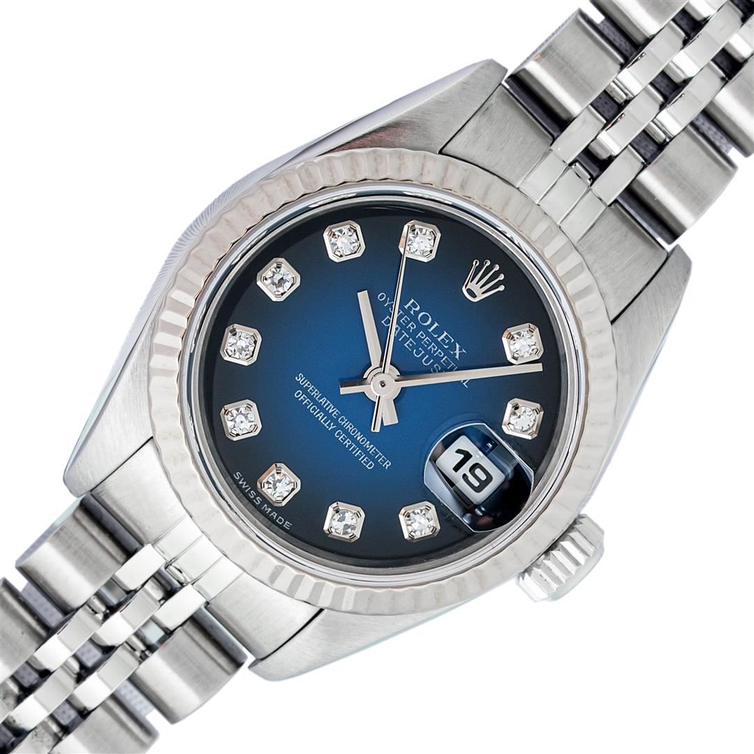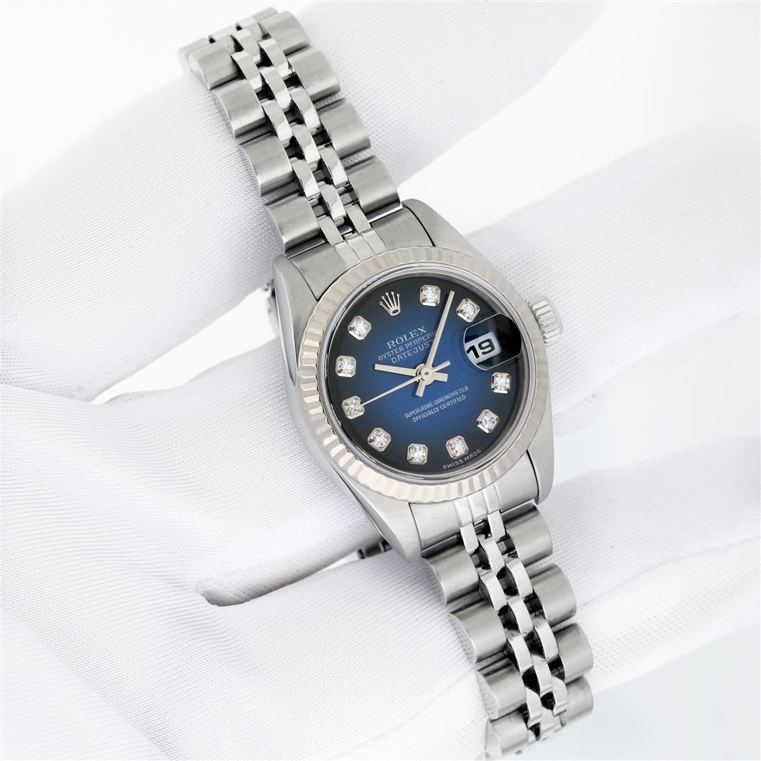 One Ladies Pre Owned Quickset Stainless Steel Rolex Datejust Polished Bright with Satin Finish, Serviced & Electronically Tested, Stainless Steel Case: 26mm, Rolex Stainless Steel Crown, Rolex Bezel: 18K White Gold Fluted Bezel. Custom Crystal: New Sapphire With Magnified Date Window. Custom Hands: New Hands. Rolex Movement: Automatic Winding Movement 2235. Custom Dial: Refinished To Blue Vignette With Custom Added Diamond Hour Markers, Diamond Count: 10 Diamonds On Dial. Date Window: 3 O'Clock Position Date Display, Model: Quickset Datejust. Condition: G-6 Extra Fine. Rolex Bracelet: Stainless Steel Jubilee Band. Bright Polish & Satin Finish. 6.0 Inch Length, Adjustable. Standard Clasp, With Rolex Logo. This Watch Has Been Serviced Time Tested And Is In Excellent Condition It Is Free Of All Scratches And Dents.