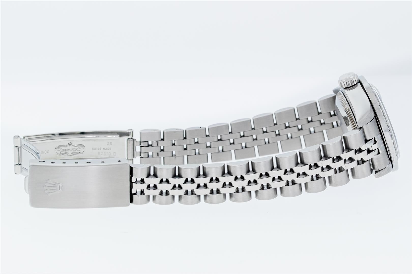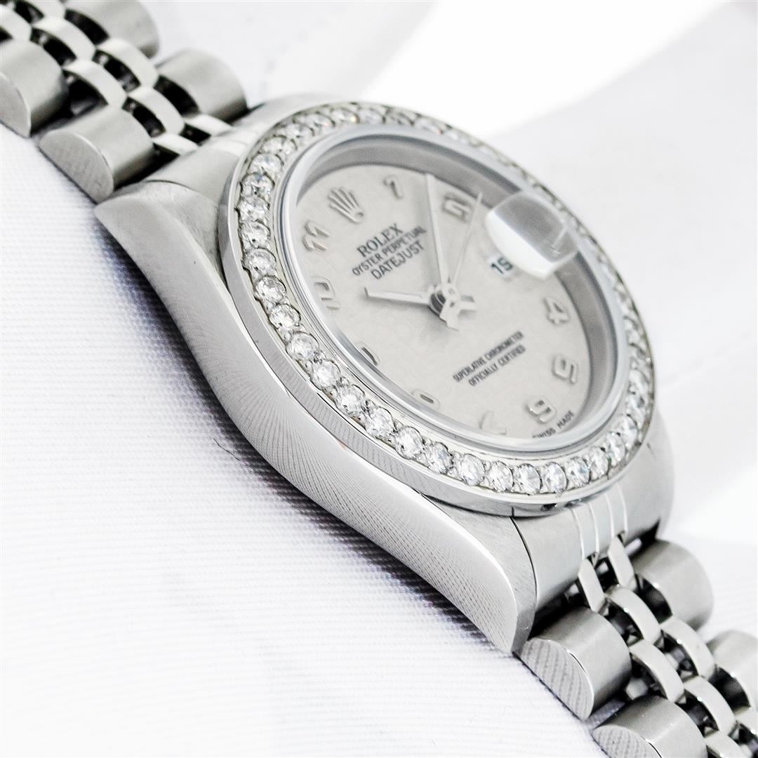 One Ladies Pre Owned Quickset Stainless Steel Rolex Datejust Polished Bright with Satin Finish, Serviced & Electronically Tested, Stainless Steel Case: 26mm, Rolex Stainless Steel Crown, Custom Bezel: New Stainless Steel Bead Set Diamond Bezel, Diamond Count: 40 Diamonds, Clarity: SI-VS, Color: G to H. Custom Crystal: New Sapphire With Magnified Date Window. Custom Hands: New Luminescent Hands. Rolex Movement: Automatic Winding Movement 2235. Rolex Dial: Cream Jubilee With Arabic Hour Markers. Date Window: 3 O'Clock Position Date Display, Model: Datejust. Condition: G-6 Extra Fine. Rolex Bracelet: Stainless Steel Jubilee Band. Bright Polish & Satin Finish. 6.0 Inch Length, Adjustable. Standard Clasp, With Rolex Logo. This Watch Has Been Serviced Time Tested And Is In Excellent Condition It Is Free Of All Scratches And Dents.