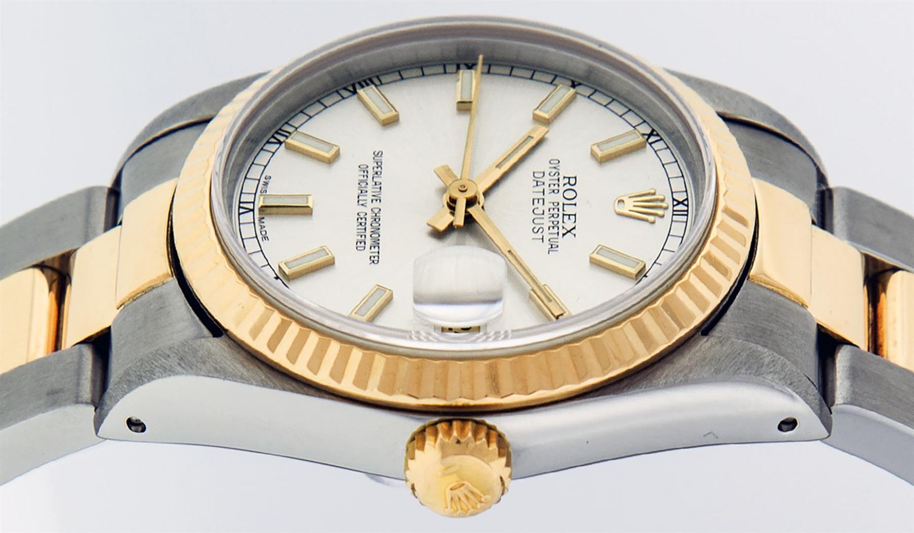 One Women's Rolex Midsize 18K Yellow Gold And Stainless Steel Datejust Polished, Serviced & Electronically Tested, Rolex Yellow Gold And Stainless Steel Case Case: 31mm, Rolex Stainless Steel Crown, Rolex Bezel: 18K Rolex Yellow Gold Fluted Bezel, Color: G To H, Clarity: VS2-SI1. Custom Crystal: New Sapphire With Magnified Date Window. Custom Hands: New Luminescent Hands. Rolex Movement: Automatic Winding Movement Caliber 2135. Rolex Dial: Silver Index Dial With Roman Track. Date Window: 3 O'Clock Position Date Display, Quickset, Model: Midsize Quickset Datejust. Condition: G-6 Extra Fine. Rolex Bracelet: 18K Yellow Gold And Stainless Steel Oyster Band. Bright Polish. 6.0 Inch Length, Adjustable. Standard Clasp, With Rolex Logo. This Pre Owned Watch Has Been Serviced Time Tested And Is In Excellent Condition It Is Free Of All Scratches And Dents.