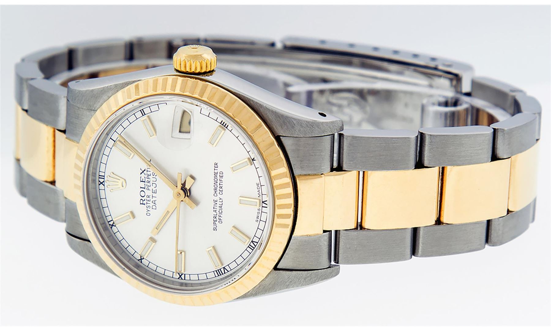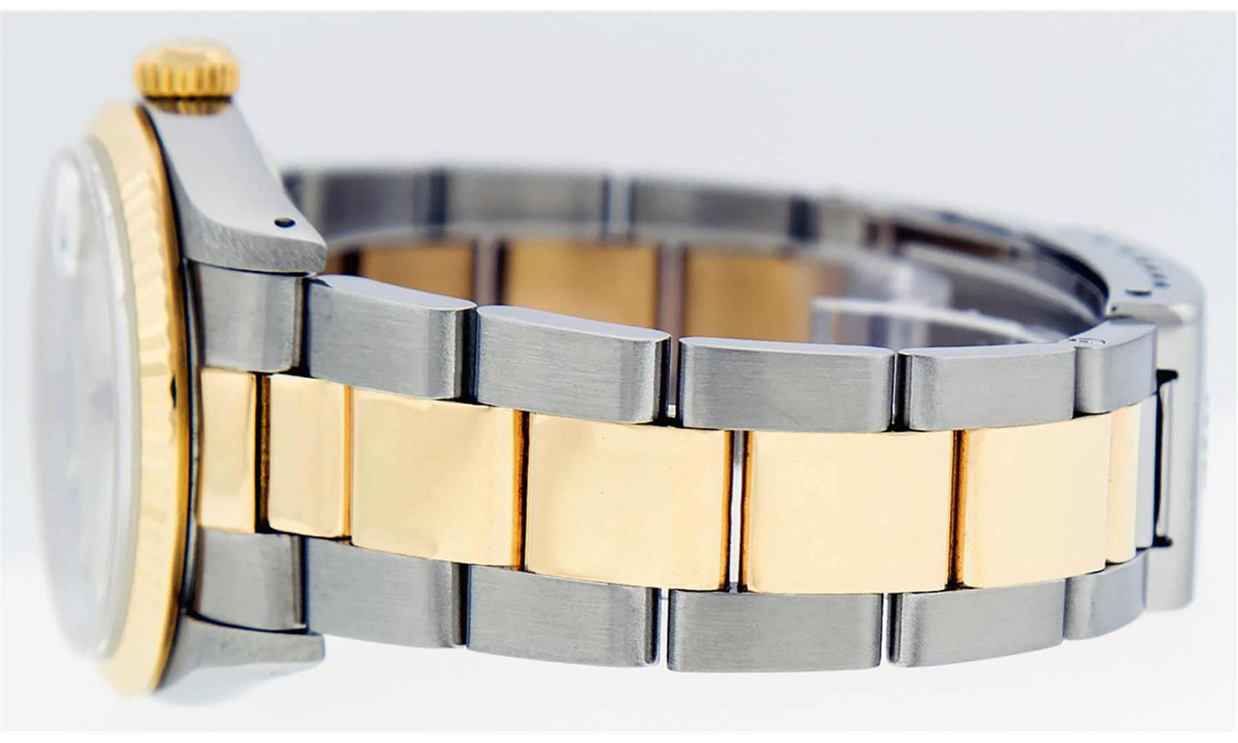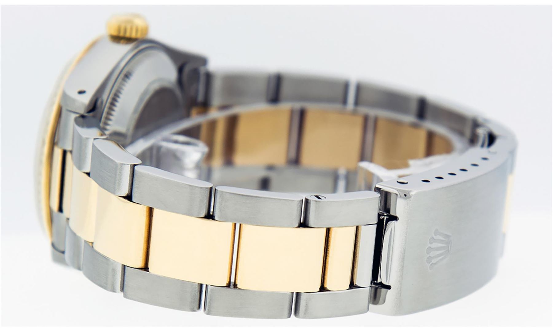 One Women's Rolex Midsize 18K Yellow Gold And Stainless Steel Datejust Polished, Serviced & Electronically Tested, Rolex Yellow Gold And Stainless Steel Case Case: 31mm, Rolex Stainless Steel Crown, Rolex Bezel: 18K Rolex Yellow Gold Fluted Bezel, Color: G To H, Clarity: VS2-SI1. Custom Crystal: New Sapphire With Magnified Date Window. Custom Hands: New Luminescent Hands. Rolex Movement: Automatic Winding Movement Caliber 2135. Rolex Dial: Silver Index Dial With Roman Track. Date Window: 3 O'Clock Position Date Display, Quickset, Model: Midsize Quickset Datejust. Condition: G-6 Extra Fine. Rolex Bracelet: 18K Yellow Gold And Stainless Steel Oyster Band. Bright Polish. 6.0 Inch Length, Adjustable. Standard Clasp, With Rolex Logo. This Pre Owned Watch Has Been Serviced Time Tested And Is In Excellent Condition It Is Free Of All Scratches And Dents.