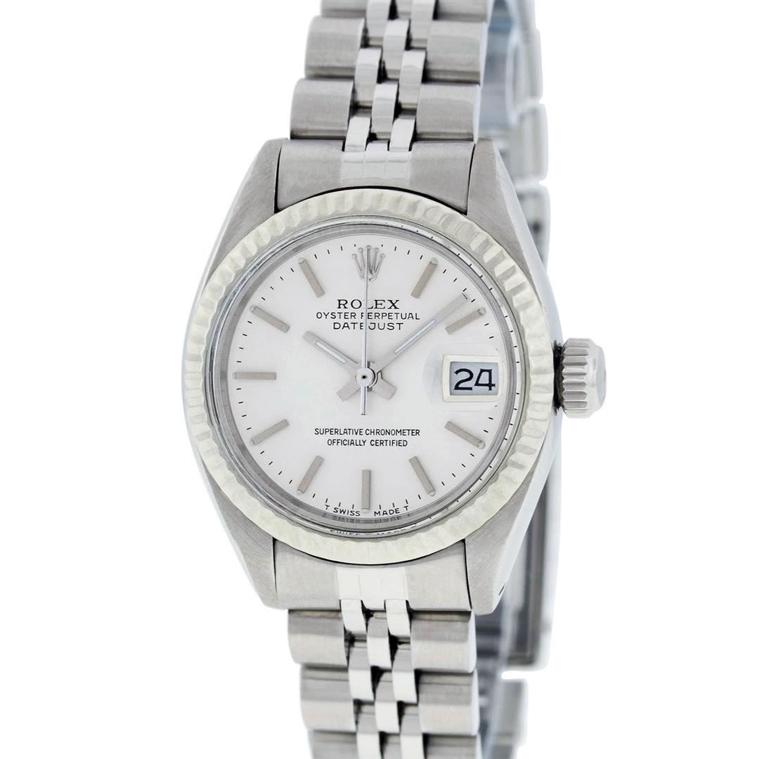 One Ladies Rolex Quickset Datejust Polished Bright with Satin Finish, Serviced & Electronically Tested, Stainless Steel Case:26mm, Stainless Steel Crown, Bezel: 18K White Gold Fluted Bezel. Custom Crystal: Acrylic Cyclops Lens. Movement: Automatic Winding Movement Caliber 2135. Dial: Silver Index Dial With Lumi Dot & Dash Track. Date Window: 3 O'Clock Position Date Display, Model: 69174 Quickset Datejust. Condition: G-6 Extra Fine. Bracelet: Stainless Steel Jubilee Band. Bright Polish & Satin Finish. 6.0 Inch Length, Adjustable. Standard Clasp, With Rolex Logo.
