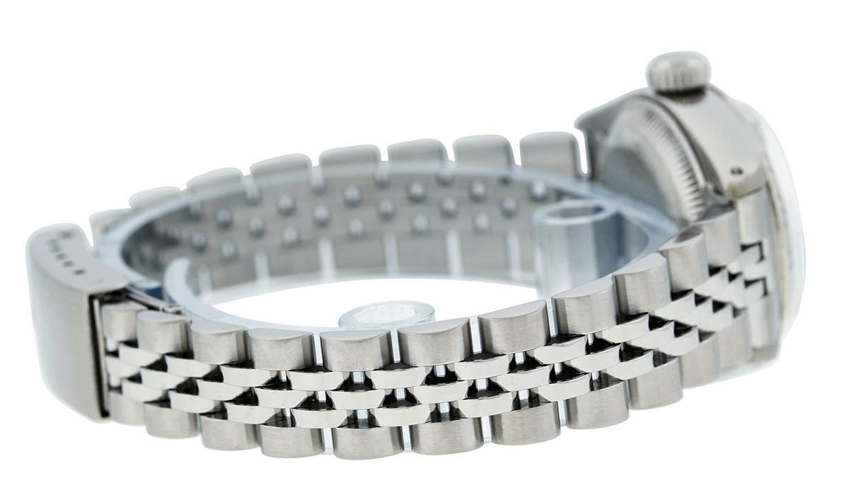 One Ladies Rolex Quickset Datejust Polished Bright with Satin Finish, Serviced & Electronically Tested, Stainless Steel Case:26mm, Stainless Steel Crown, Bezel: 18K White Gold Fluted Bezel. Custom Crystal: Acrylic Cyclops Lens. Movement: Automatic Winding Movement Caliber 2135. Dial: Silver Index Dial With Lumi Dot & Dash Track. Date Window: 3 O'Clock Position Date Display, Model: 69174 Quickset Datejust. Condition: G-6 Extra Fine. Bracelet: Stainless Steel Jubilee Band. Bright Polish & Satin Finish. 6.0 Inch Length, Adjustable. Standard Clasp, With Rolex Logo.
