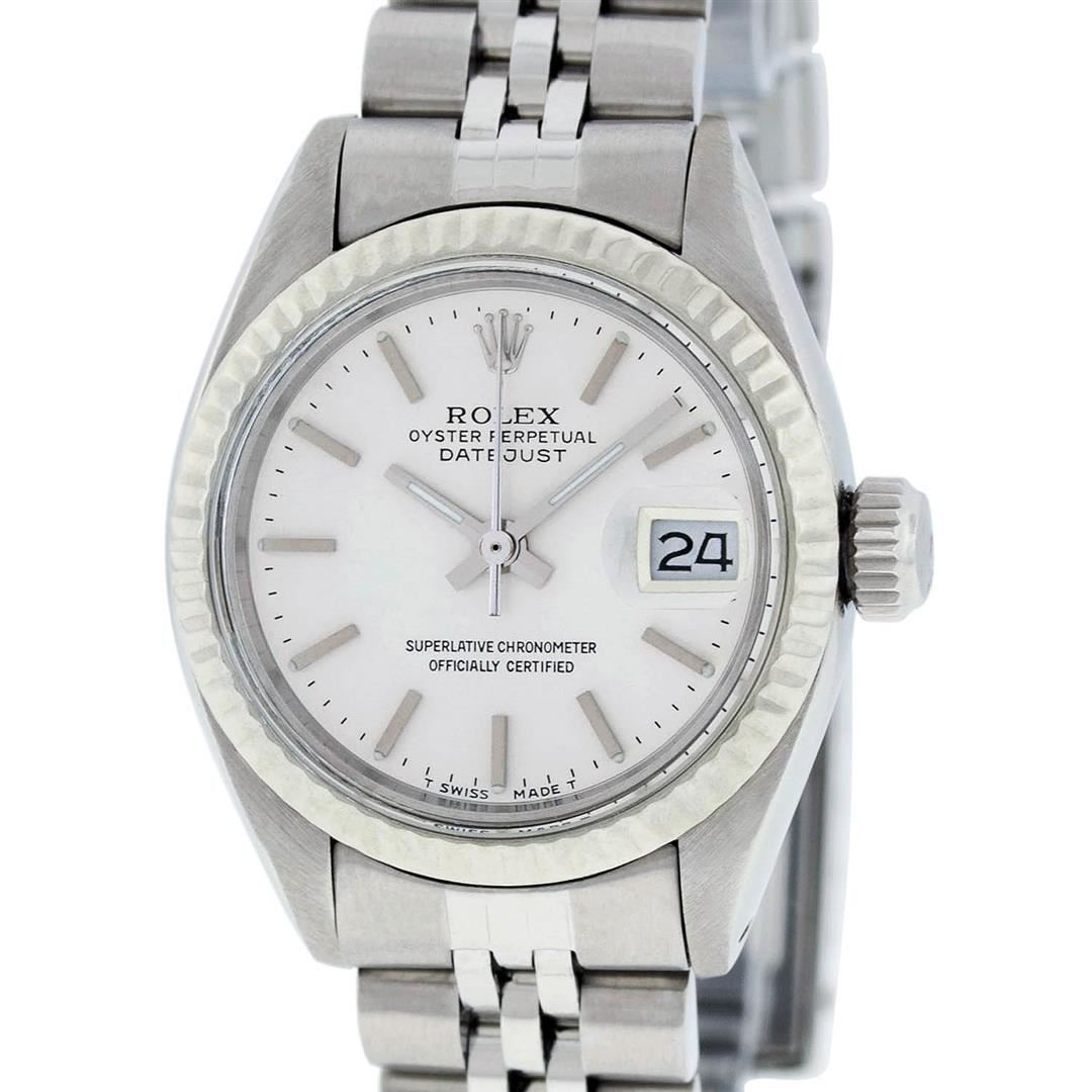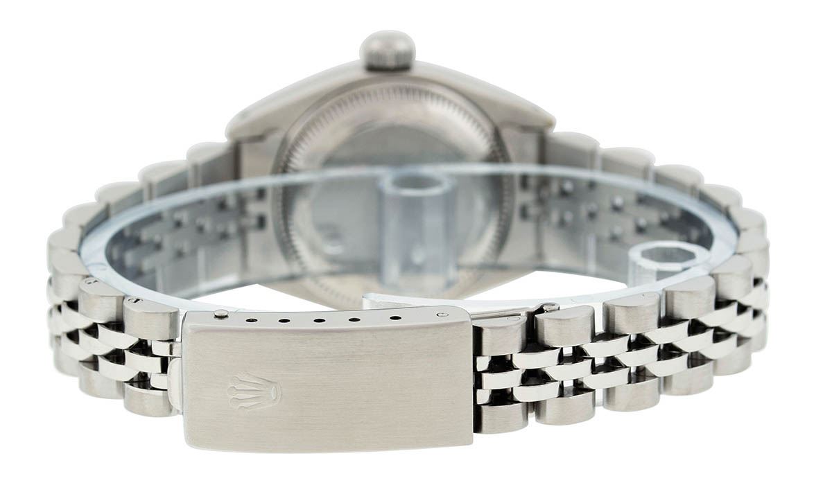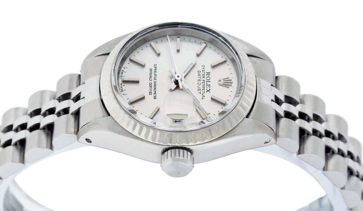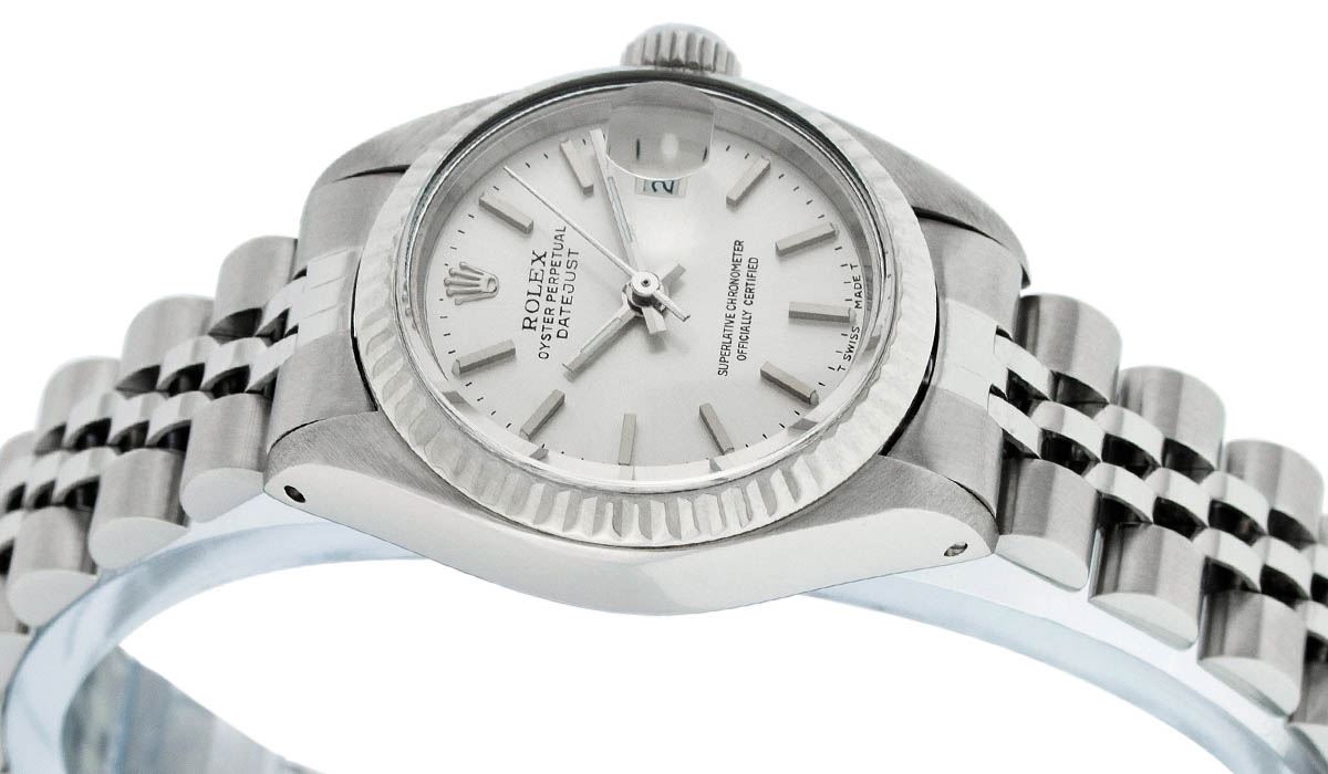 One Ladies Rolex Quickset Datejust Polished Bright with Satin Finish, Serviced & Electronically Tested, Stainless Steel Case:26mm, Stainless Steel Crown, Bezel: 18K White Gold Fluted Bezel. Custom Crystal: Acrylic Cyclops Lens. Movement: Automatic Winding Movement Caliber 2135. Dial: Silver Index Dial With Lumi Dot & Dash Track. Date Window: 3 O'Clock Position Date Display, Model: 69174 Quickset Datejust. Condition: G-6 Extra Fine. Bracelet: Stainless Steel Jubilee Band. Bright Polish & Satin Finish. 6.0 Inch Length, Adjustable. Standard Clasp, With Rolex Logo.