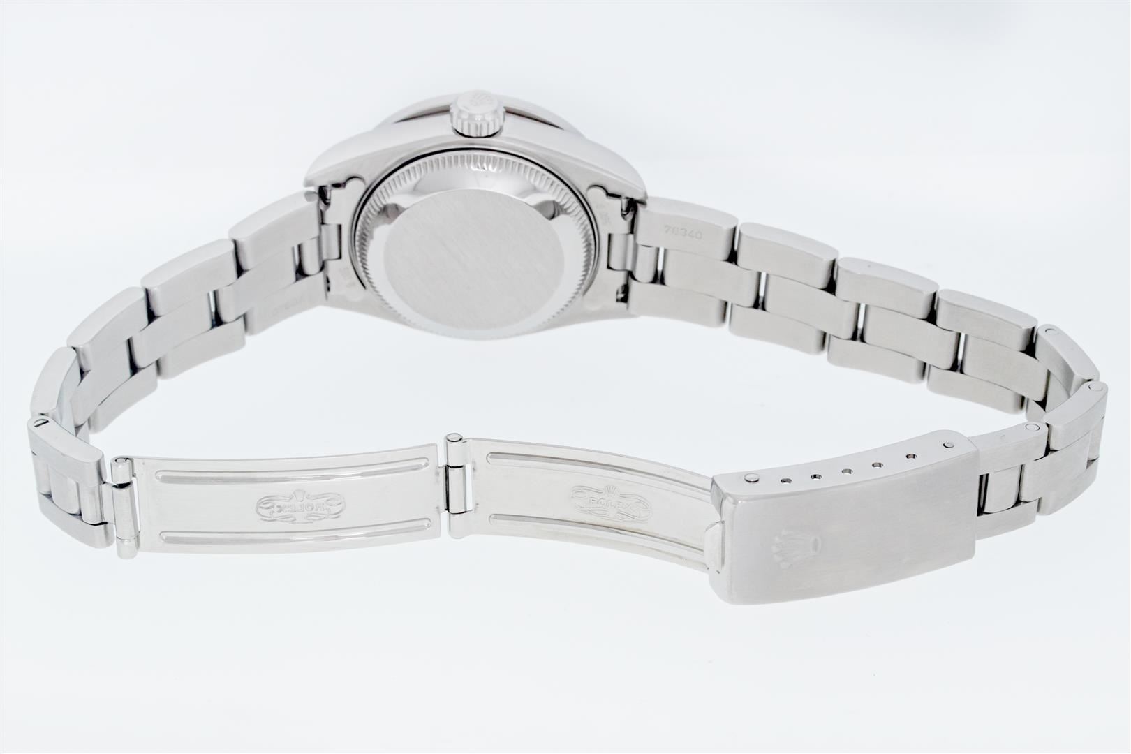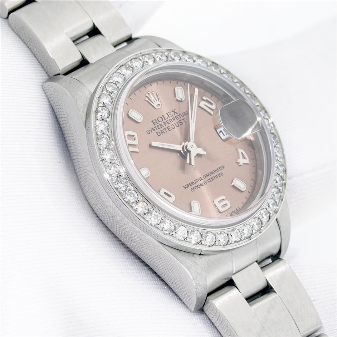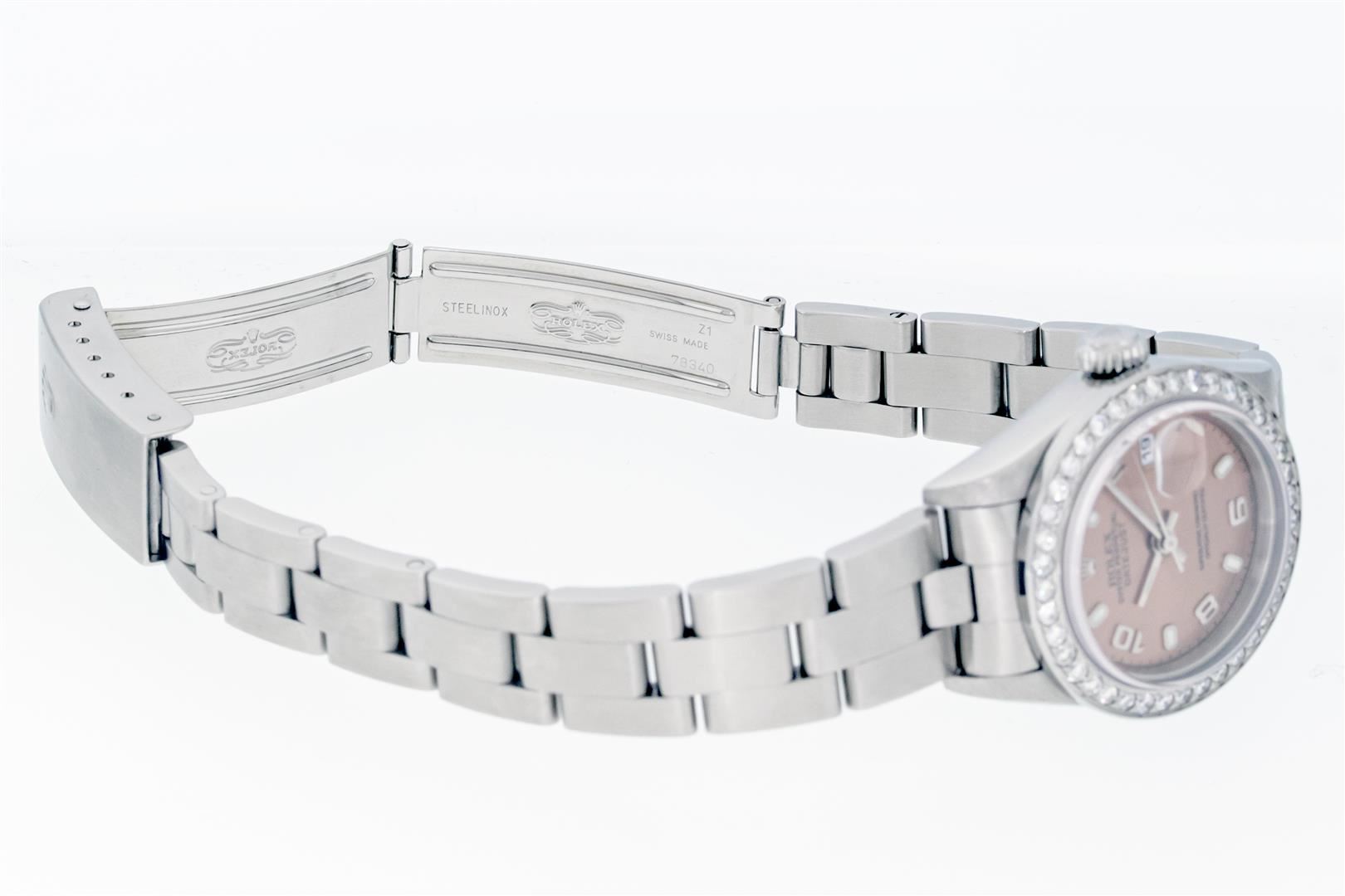 One Ladies Pre Owned Quickset Stainless Steel Rolex Datejust Polished Bright with Satin Finish, Serviced & Electronically Tested, Stainless Steel Case: 26mm, Rolex Stainless Steel Crown, Custom Bezel: New Stainless Steel Bead Set Diamond Bezel, Diamond Count: 40 Diamonds, Clarity: SI-VS, Color: G to H. Custom Crystal: New Sapphire With Magnified Date Window. Custom Hands: New Luminescent Hands. Rolex Movement: Automatic Winding Movement 2235. Rolex Dial: Salmon With Arabic Hour Markers & Dash Track. Date Window: 3 O'Clock Position Date Display, Model: Datejust. Condition: G-6 Extra Fine. Rolex Bracelet: Stainless Steel Oyster Band. Bright Polish & Satin Finish. 6.0 Inch Length, Adjustable. Standard Clasp, With Rolex Logo. This Watch Has Been Serviced Time Tested And Is In Excellent Condition It Is Free Of All Scratches And Dents.