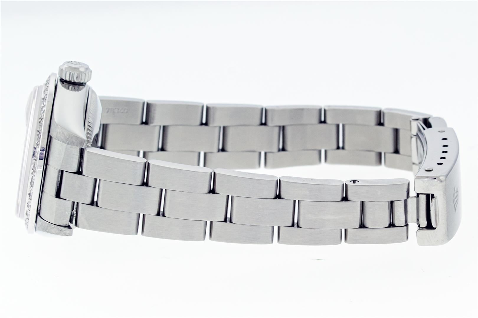 One Ladies Pre Owned Quickset Stainless Steel Rolex Datejust Polished Bright with Satin Finish, Serviced & Electronically Tested, Stainless Steel Case: 26mm, Rolex Stainless Steel Crown, Custom Bezel: New 18K White Gold Bead Set Diamond Bezel, Diamond Count: 32 Diamonds, Clarity: SI-VS, Color: G to H. Custom Crystal: New Sapphire With Magnified Date Window. Custom Hands: New Luminescent Hands. Rolex Movement: Automatic Winding Movement 2235. Rolex Dial: Salmon With Arabic Hour Markers & Dash Track. Date Window: 3 O'Clock Position Date Display, Model: Datejust. Condition: G-6 Extra Fine. Rolex Bracelet: Stainless Steel Oyster Band. Bright Polish & Satin Finish. 6.0 Inch Length, Adjustable. Standard Clasp, With Rolex Logo. This Watch Has Been Serviced Time Tested And Is In Excellent Condition It Is Free Of All Scratches And Dents.
