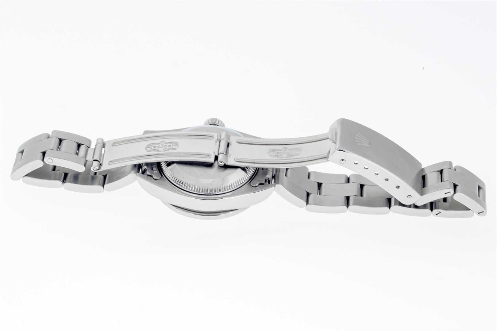 One Ladies Pre Owned Quickset Stainless Steel Rolex Datejust Polished Bright with Satin Finish, Serviced & Electronically Tested, Stainless Steel Case: 26mm, Rolex Stainless Steel Crown, Custom Bezel: New Stainless Steel Bead Set Diamond Bezel, Diamond Count: 40 Diamonds, Clarity: SI-VS, Color: G to H. Custom Crystal: New Sapphire With Magnified Date Window. Custom Hands: New Luminescent Hands. Rolex Movement: Automatic Winding Movement 2235. Rolex Dial: Salmon With Arabic Hour Markers & Dash Track. Date Window: 3 O'Clock Position Date Display, Model: Datejust. Condition: G-6 Extra Fine. Rolex Bracelet: Stainless Steel Oyster Band. Bright Polish & Satin Finish. 6.0 Inch Length, Adjustable. Standard Clasp, With Rolex Logo. This Watch Has Been Serviced Time Tested And Is In Excellent Condition It Is Free Of All Scratches And Dents.