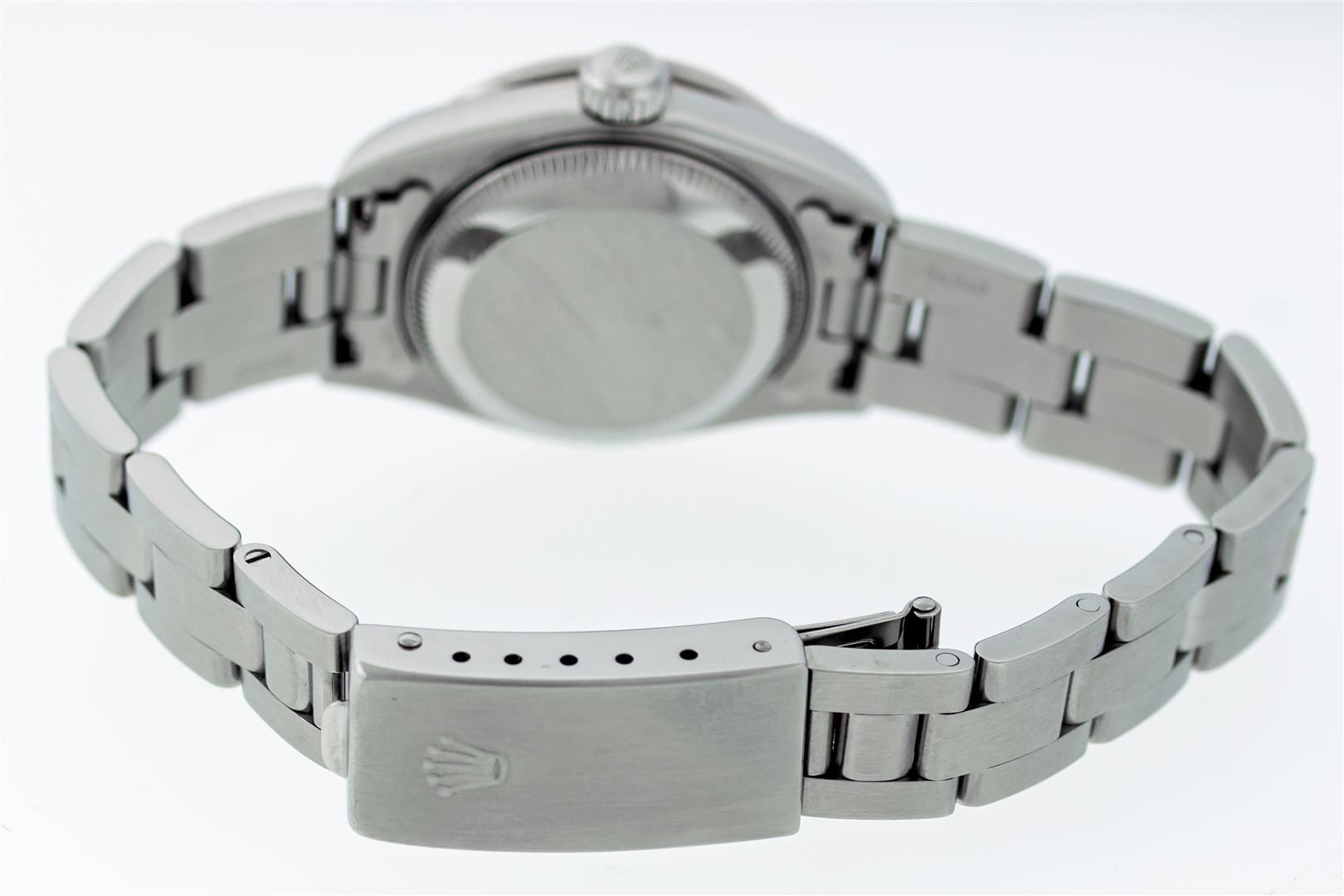 One Ladies Pre Owned Stainless Steel Rolex Datejust Polished Bright with Satin Finish, Serviced & Electronically Tested, Stainless Steel Case: 26mm, Rolex Stainless Steel Crown, Custom Bezel: New 18K White Gold Emerald Bead Set Diamond Bezel, Diamond + Gem Count: 28 Diamonds + 4 Emeralds, Clarity: SI-VS, Color: G to H. Custom Crystal: New Sapphire With Magnified Date Window. Custom Hands: New Luminescent Hands. Rolex Movement: Automatic Winding Movement 2235. Rolex Dial: Salmon With Arabic Hour Markers & Dash Track. Date Window: 3 O'Clock Position Date Display, Model: Quickset Datejust. Condition: G-6 Extra Fine. Rolex Bracelet: Stainless Steel Oyster Band. Bright Polish & Satin Finish. 6.0 Inch Length, Adjustable. Standard Clasp, With Rolex Logo. This Watch Has Been Serviced Time Tested And Is In Excellent Condition It Is Free Of All Scratches And Dents.