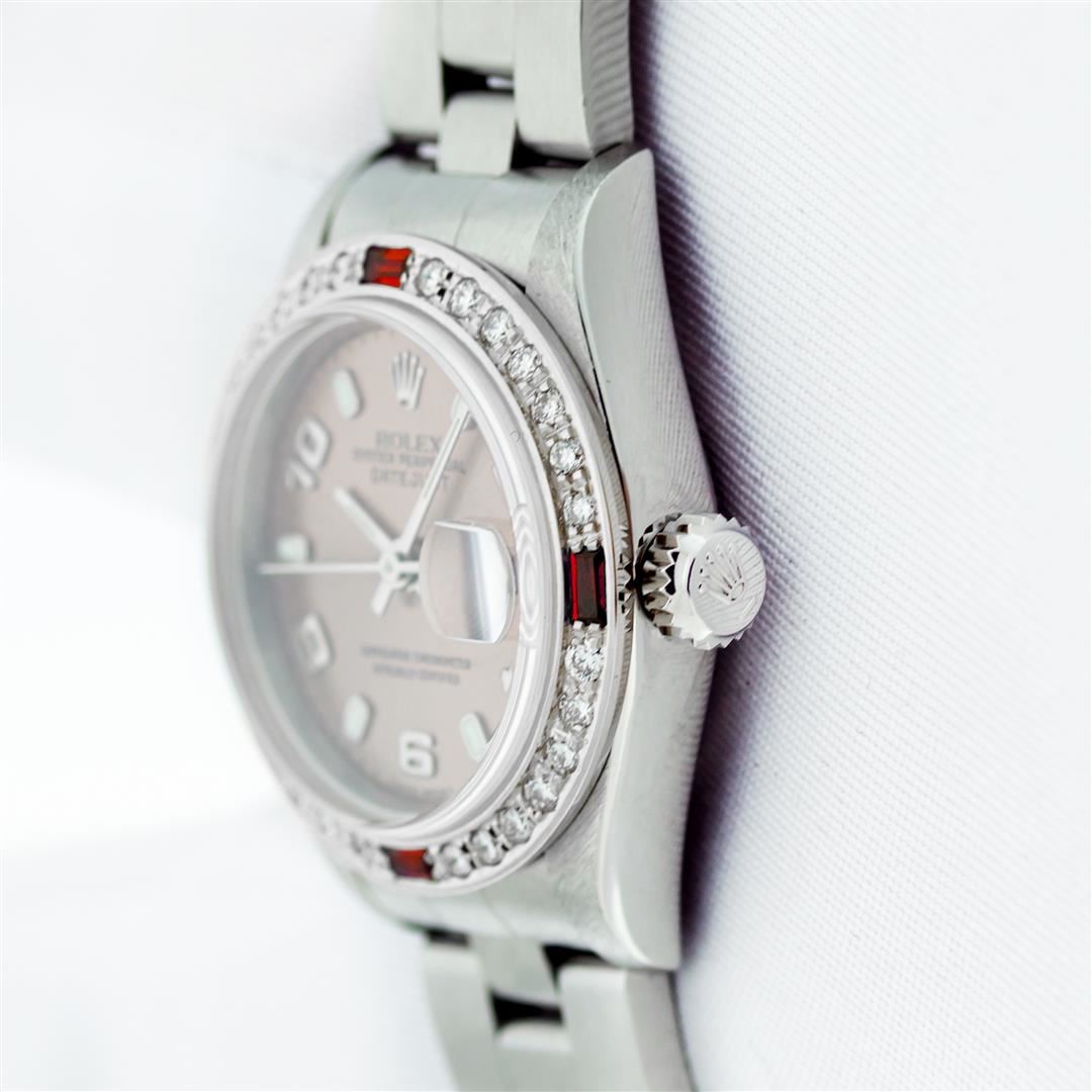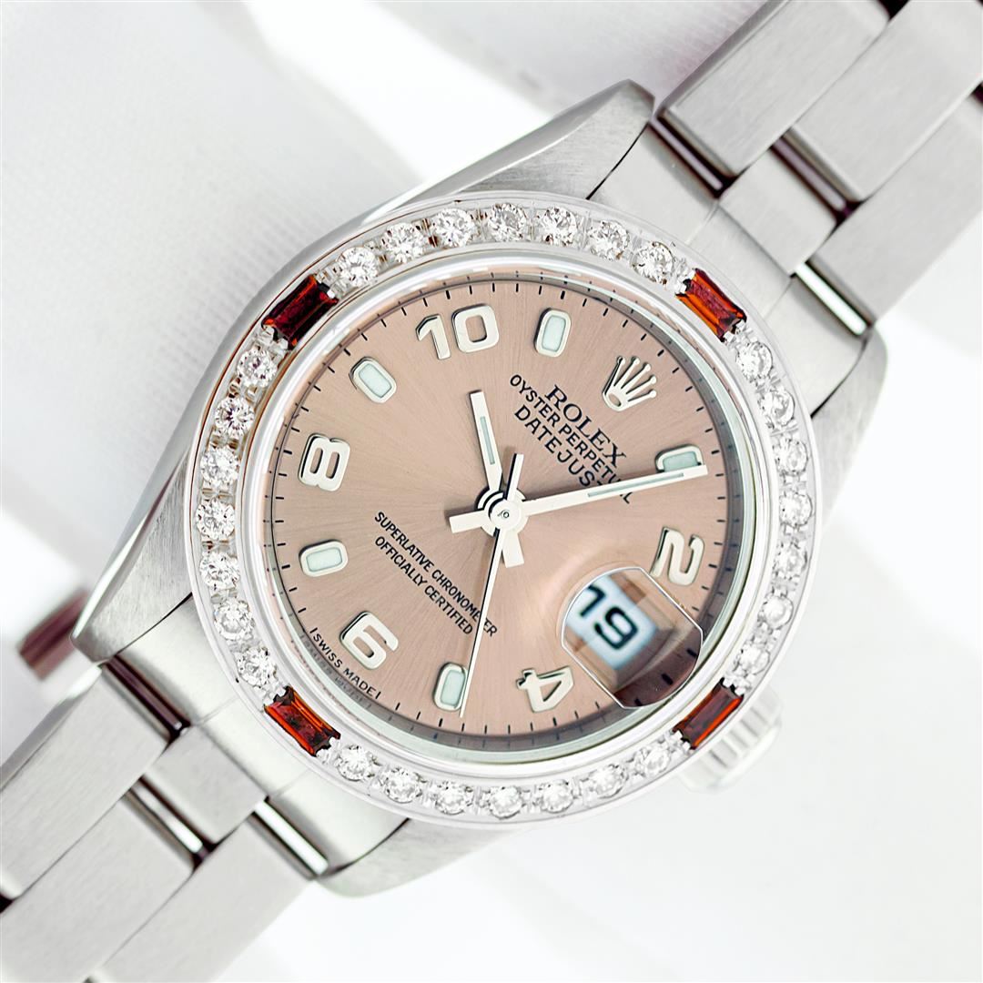 One Ladies Pre Owned Stainless Steel Rolex Datejust Polished Bright with Satin Finish, Serviced & Electronically Tested, Stainless Steel Case: 26mm, Rolex Stainless Steel Crown, Custom Bezel: New 18K White Gold Ruby Bead Set Diamond Bezel, Diamond + Gem Count: 28 Diamonds + 4 Rubies, Clarity: SI-VS, Color: G to H. Custom Crystal: New Sapphire With Magnified Date Window. Custom Hands: New Luminescent Hands. Rolex Movement: Automatic Winding Movement 2235. Rolex Dial: Salmon With Arabic Hour Markers & Dash Track. Date Window: 3 O'Clock Position Date Display, Model: Quickset Datejust. Condition: G-6 Extra Fine. Rolex Bracelet: Stainless Steel Oyster Band. Bright Polish & Satin Finish. 6.0 Inch Length, Adjustable. Standard Clasp, With Rolex Logo. This Watch Has Been Serviced Time Tested And Is In Excellent Condition It Is Free Of All Scratches And Dents.