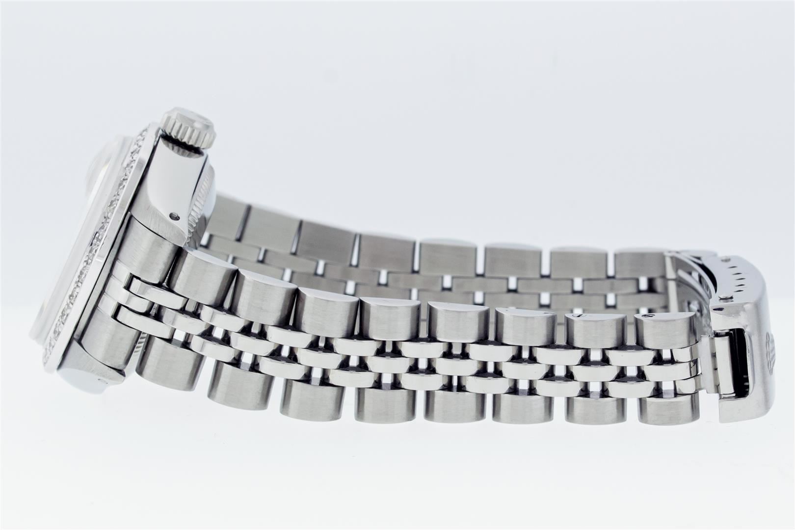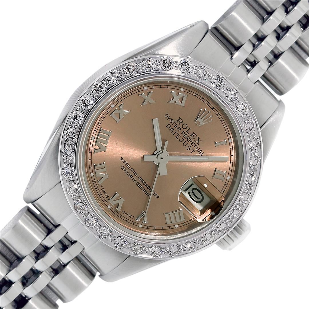 One Ladies Pre Owned Quickset Stainless Steel Rolex Datejust Polished Bright with Satin Finish Serviced & Electronically Tested, Rolex Stainless Steel Case: 26mm, Rolex Stainless Steel Crown, Custom Bezel: New 18K White Gold Beadset Diamond Bezel, Diamond Count: 32 Diamonds On Bezel Dial, Clarity: SI-VS, Color: G to H. Custom Crystal: New Sapphire With Magnified Date Window. Custom Hands: New Luminescent Hands. Rolex Movement: Automatic Winding Movement. Rolex Dial: Salmon Roman Dial With Square Track. Date Window: 3 O'Clock Position Date Display, Model: Datejust. Condition: G-6 Extra Fine. Rolex Bracelet: Stainless Steel Jubilee Band With Rolex Crown On Buckle. Bright Polish & Satin Finish. Band Length: 6.0 Inch Length, Adjustable. Standard Clasp, With Rolex Logo. This Watch Has Been Serviced Time Tested And Is In Excellent Condition It Is Free Of All Scratches And Dents. This Watch Comes With A Rolex Box.