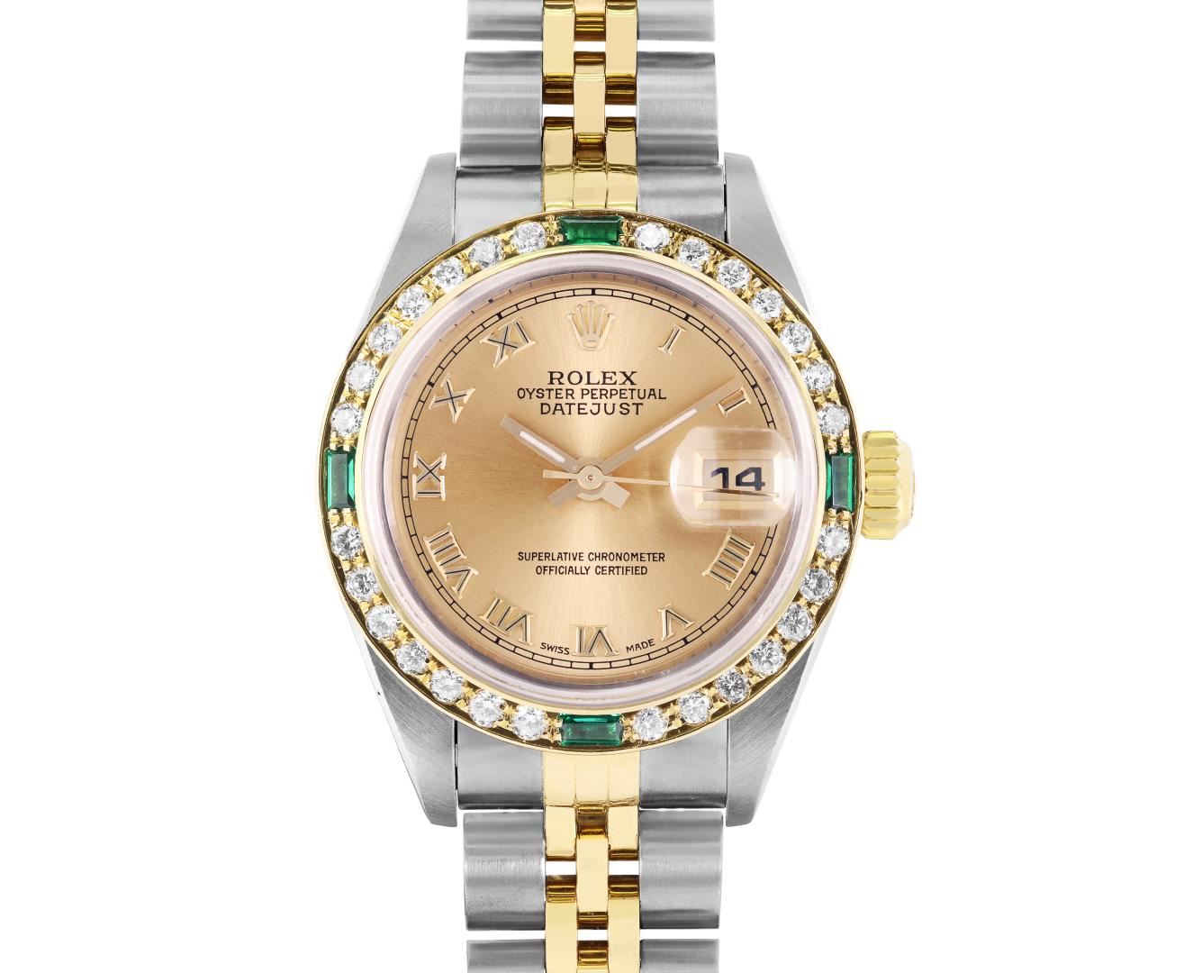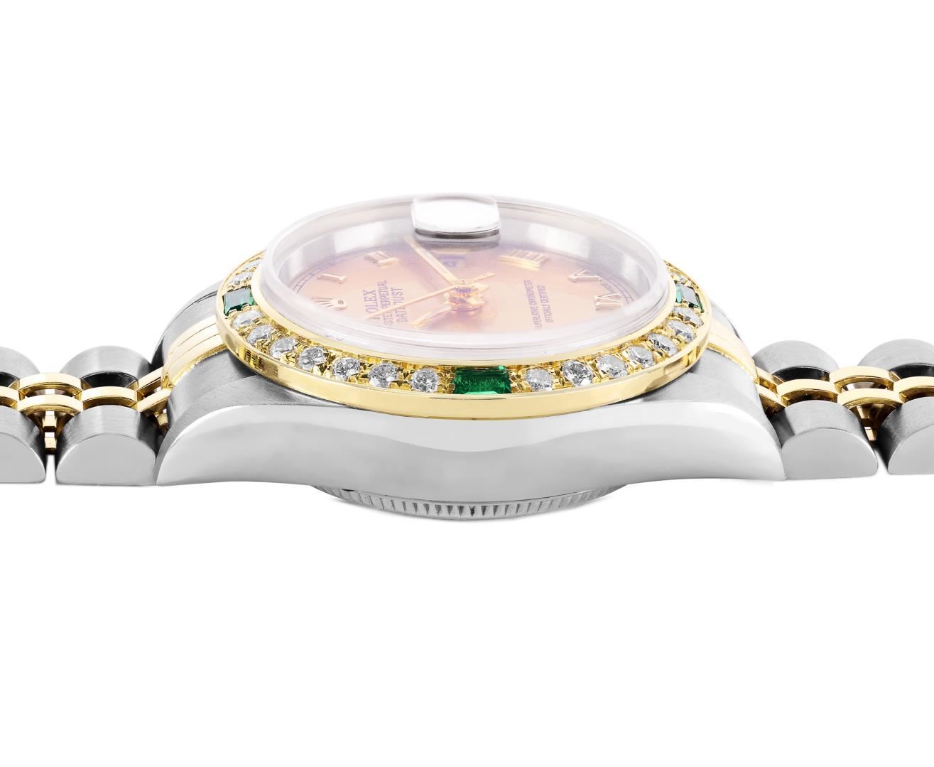 One Ladies Pre Owned Quickset Stainless Steel Rolex Datejust Polished Bright with Satin Finish, Serviced & Electronically Tested, Rolex Stainless Steel Case: 26mm, Rolex Yellow Gold Crown, Custom Bezel: New 18K Yellow Gold Diamond & Emerald Bezel, Stone Count: 28 Diamonds + 4 Emeralds On Bezel. Crystal: Sapphire With Magnified Date Window. Hands: Luminescent Hands. Rolex Movement: Automatic Winding Movement. Rolex Dial: Champagne with Roman Hour Markers and Square Track. Date Window: 3 O'Clock Position Date Display, Model: Quickset Datejust. Condition: G-6 Extra Fine. Rolex Bracelet: 18K Yellow Gold And Stainless Steel Jubilee Band. Bright Polish & Satin Finish. 6.0 Inch Length, Adjustable. Standard Clap, With Rolex Logo. This Watch Has Been Serviced Time Tested And Is In Excellent Condition It Is Free Of All Scratches And Dents.
