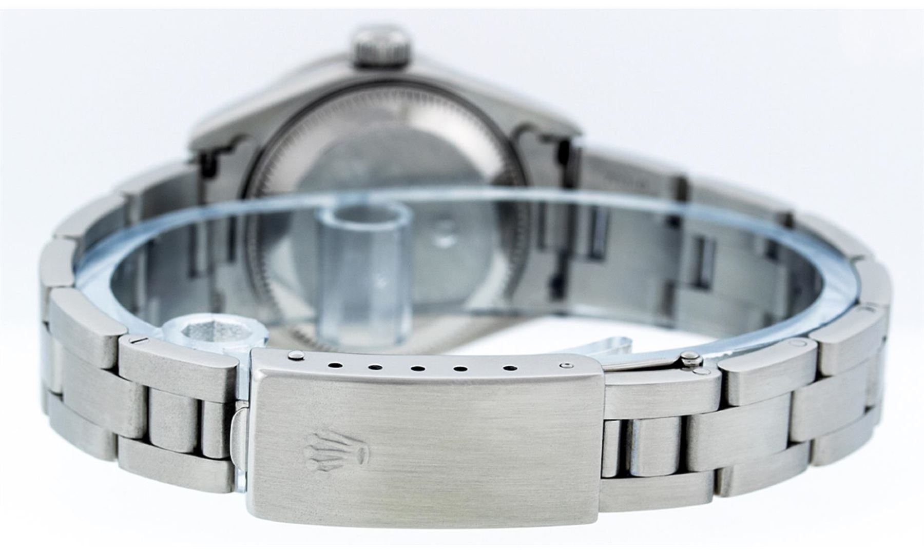 One Ladies Pre Owned Quickset Sapphire Stainless Steel Rolex Datejust Polished Bright with Satin Finish, Serviced And Electronically Tested, Stainless Steel Case: 26mm, Stainless Steel Crown, Custom Diamond Lugs: 24 Added Diamonds On Lugs. Custom Bezel: New 18K White Gold Beadset Diamond Bezel, Diamond Count: 32 Diamonds. Custom Crystal: New Sapphire With Date Window. Custom Hands: New Luminescent Hands. Rolex Movement: Automatic Quickset Winding Movement 2235. Custom Dial: Custom Black Dial With Added Diamonds, 43 Diamonds On Dial. Date Window: 3 O'Clock Position Date Display, Model: Quickset Datejust. Condition: G-6 Extra Fine. Rolex Bracelet: Stainless Steel Oyster Band. Bright Polish And Satin Finish. 6.0 Inch Length, Adjustable. Standard Clasp, With Rolex Logo. This Watch Has Been Serviced Time Tested And Is In Excellent Condition It Is Free Of All Scratches And Dents.