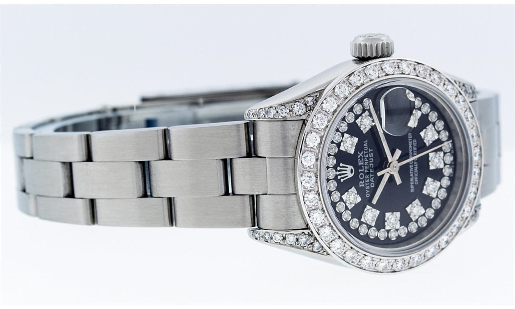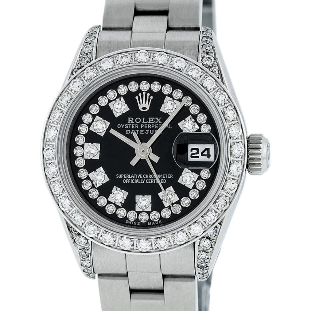 One Ladies Pre Owned Quickset Sapphire Stainless Steel Rolex Datejust Polished Bright with Satin Finish, Serviced And Electronically Tested, Stainless Steel Case: 26mm, Stainless Steel Crown, Custom Diamond Lugs: 24 Added Diamonds On Lugs. Custom Bezel: New 18K White Gold Beadset Diamond Bezel, Diamond Count: 32 Diamonds. Custom Crystal: New Sapphire With Date Window. Custom Hands: New Luminescent Hands. Rolex Movement: Automatic Quickset Winding Movement 2235. Custom Dial: Custom Black Dial With Added Diamonds, 43 Diamonds On Dial. Date Window: 3 O'Clock Position Date Display, Model: Quickset Datejust. Condition: G-6 Extra Fine. Rolex Bracelet: Stainless Steel Oyster Band. Bright Polish And Satin Finish. 6.0 Inch Length, Adjustable. Standard Clasp, With Rolex Logo. This Watch Has Been Serviced Time Tested And Is In Excellent Condition It Is Free Of All Scratches And Dents.