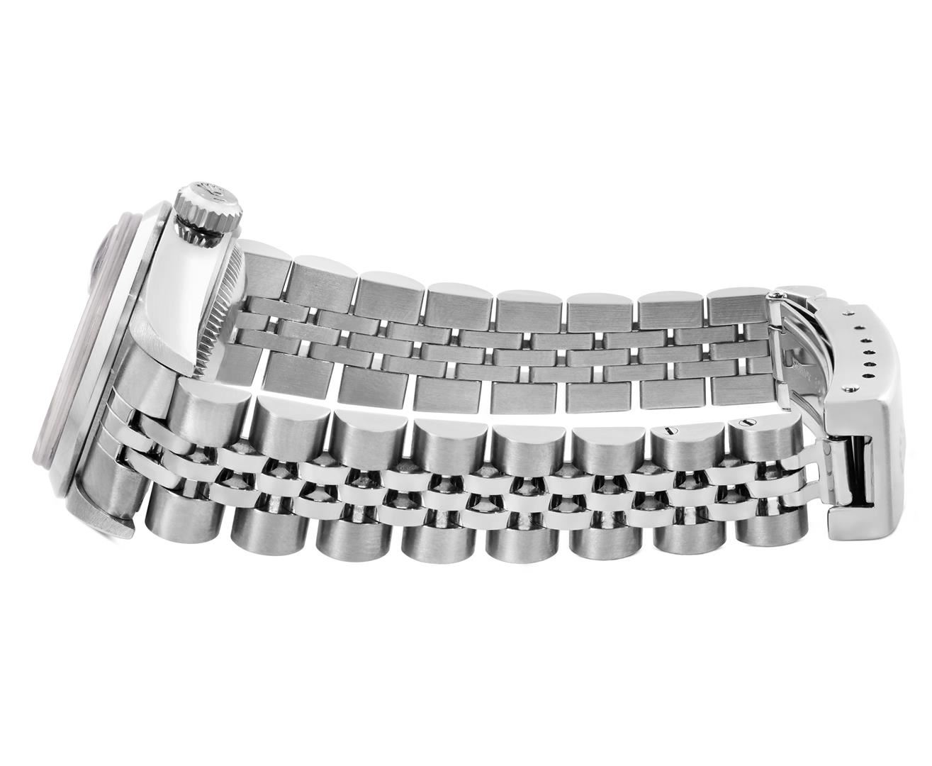 One Rolex Ladies Pre Owned Stainless Steel Date Wristwatch Polished Bright with Satin Finish, Serviced & Electronically Tested, Stainless Steel Case: 26mm, Stainless Steel Crown, Rolex Stainless Steel Smooth bezel. Crystal: Sapphire With Magnified Date Wi