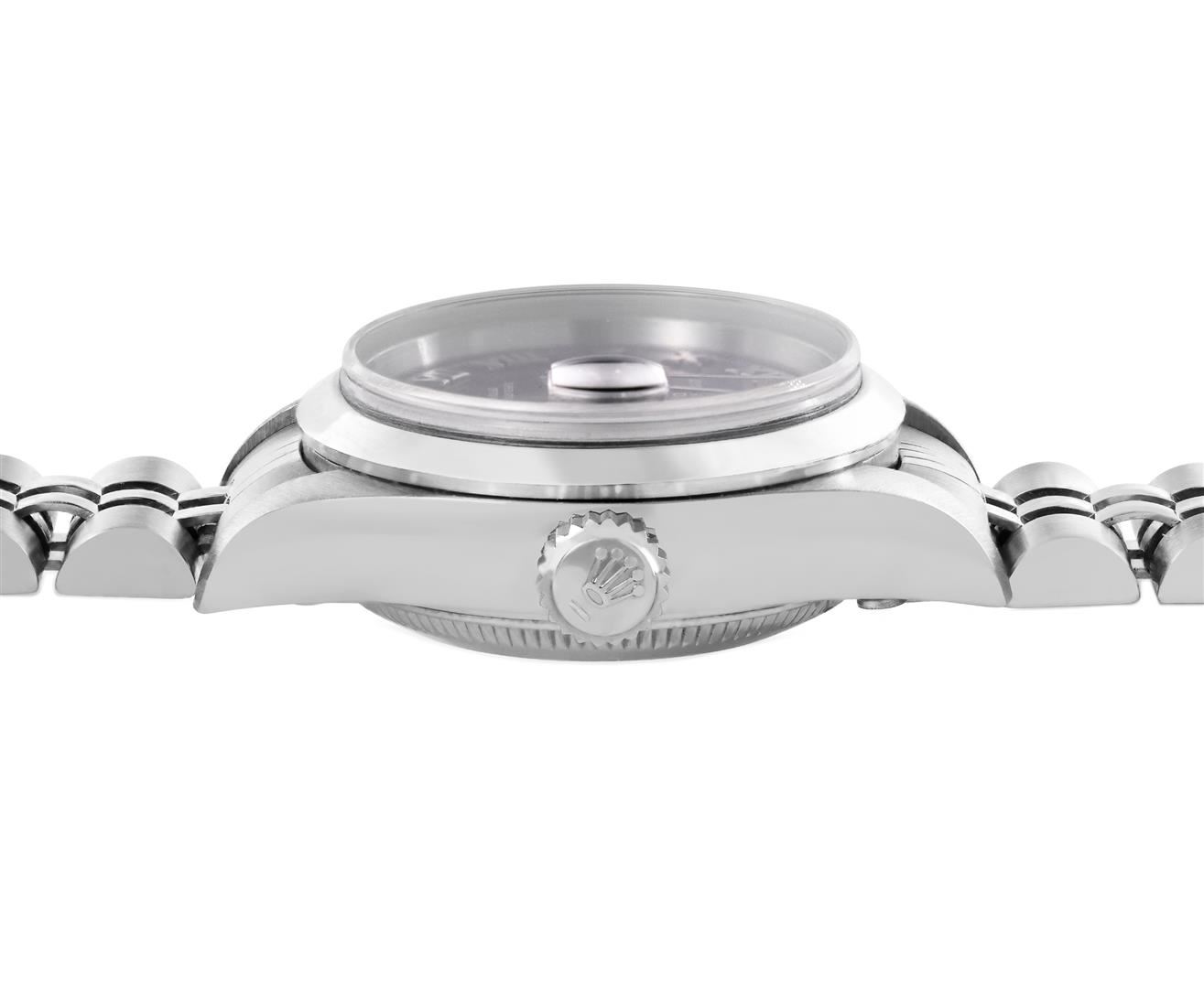 One Rolex Ladies Pre Owned Stainless Steel Date Wristwatch Polished Bright with Satin Finish, Serviced & Electronically Tested, Stainless Steel Case: 26mm, Stainless Steel Crown, Rolex Stainless Steel Smooth bezel. Crystal: Sapphire With Magnified Date Window. Custom Hands: New Solid Hands. Rolex Movement: 2235 Automatic Winding Movement. Rolex Dial: Factory Blue Dial With Roman Hour Markers, Square Track. Date Window: 3 O'Clock Position Date Display, Model: Quickset Sapphire Date. Condition: G-6 Extra Fine. Rolex Bracelet: Stainless Steel Jubilee Band. Bright Polish & Satin Finish. 6.0 Inch Length, Adjustable. Standard Clasp, With Rolex Logo. This Watch Has Been Serviced And Time Tested. It Is In Excellent Condition, Free Of All Scratches And Dents.