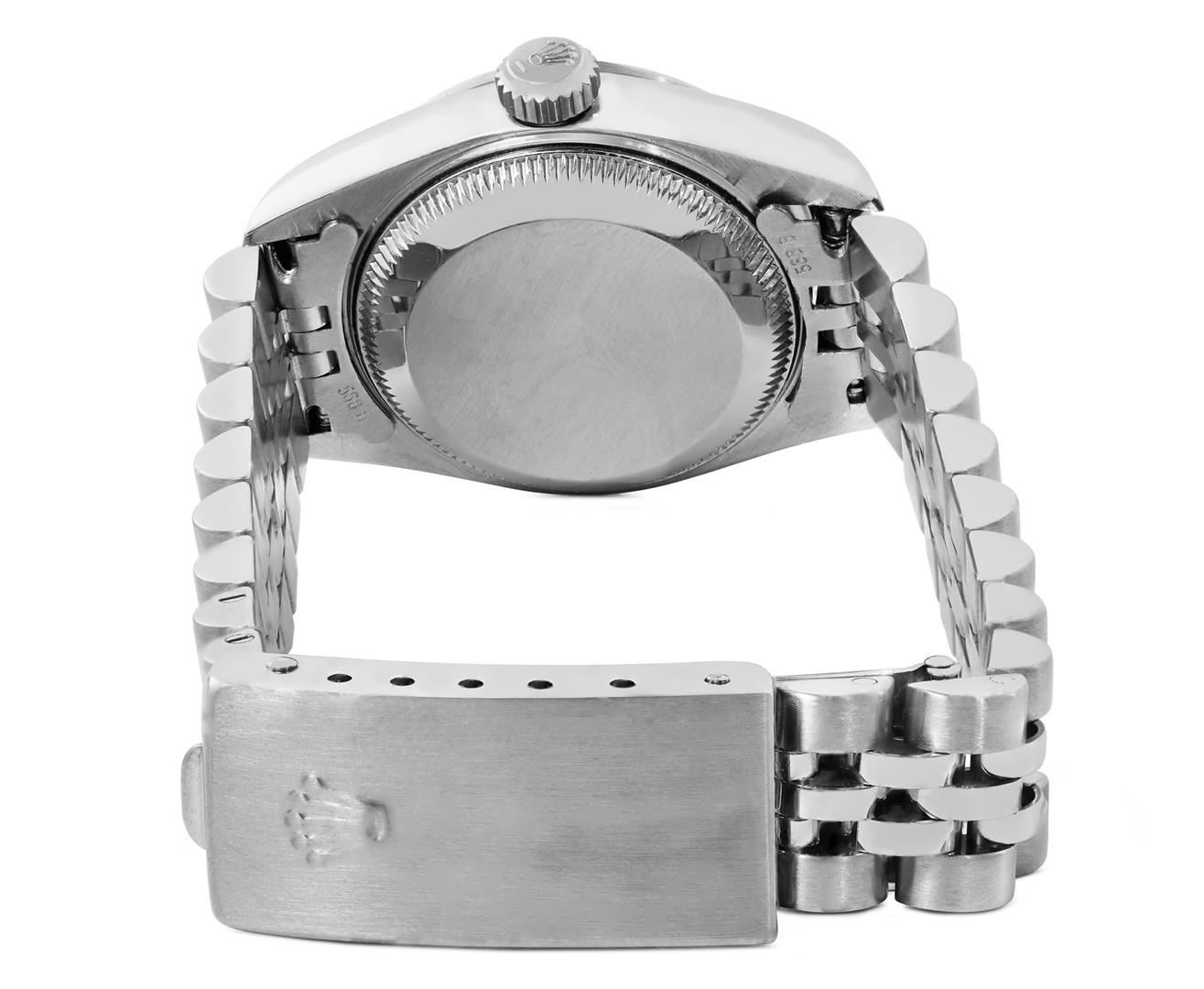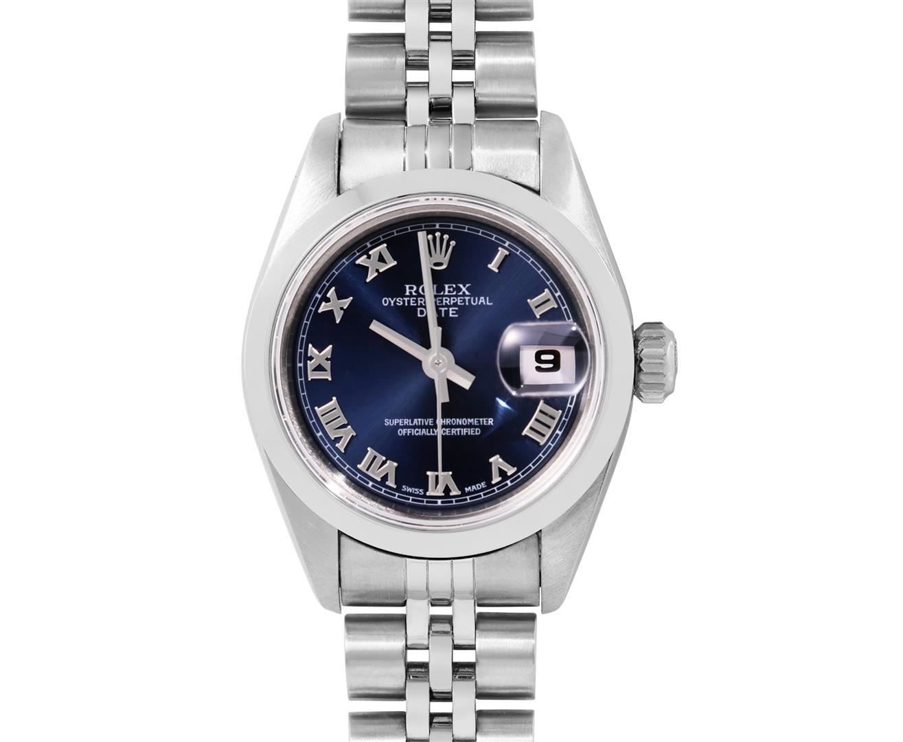 One Rolex Ladies Pre Owned Stainless Steel Date Wristwatch Polished Bright with Satin Finish, Serviced & Electronically Tested, Stainless Steel Case: 26mm, Stainless Steel Crown, Rolex Stainless Steel Smooth bezel. Crystal: Sapphire With Magnified Date Window. Custom Hands: New Solid Hands. Rolex Movement: 2235 Automatic Winding Movement. Rolex Dial: Factory Blue Dial With Roman Hour Markers, Square Track. Date Window: 3 O'Clock Position Date Display, Model: Quickset Sapphire Date. Condition: G-6 Extra Fine. Rolex Bracelet: Stainless Steel Jubilee Band. Bright Polish & Satin Finish. 6.0 Inch Length, Adjustable. Standard Clasp, With Rolex Logo. This Watch Has Been Serviced And Time Tested. It Is In Excellent Condition, Free Of All Scratches And Dents.