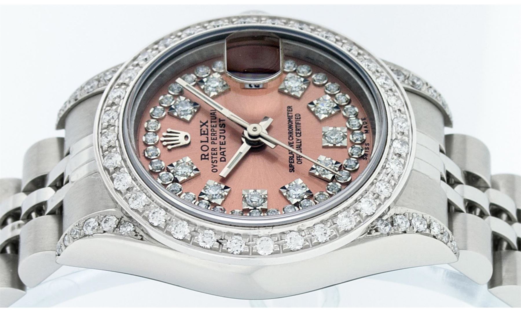 One Ladies Pre Owned Quickset Sapphire Stainless Steel Rolex Datejust Polished Bright with Satin Finish, Serviced And Electronically Tested, Stainless Steel Case: 26mm, Stainless Steel Crown, Custom Diamond Lugs: 24 Added Diamonds On Lugs. Custom Bezel: New 18K White Gold Beadset Diamond Bezel, Diamond Count: 32 Diamonds. Custom Crystal: New Sapphire With Date Window. Custom Hands: New Luminescent Hands. Rolex Movement: Automatic Quickset Winding Movement 2235. Custom Dial: Custom Salmon Dial With Added Diamonds, 43 Diamonds On Dial. Date Window: 3 O'Clock Position Date Display, Model: Quickset Datejust. Condition: G-6 Extra Fine. Rolex Bracelet: Stainless Steel Jubilee Band. Bright Polish And Satin Finish. 6.0 Inch Length, Adjustable. Standard Clasp, With Rolex Logo. This Watch Has Been Serviced Time Tested And Is In Excellent Condition It Is Free Of All Scratches And Dents.