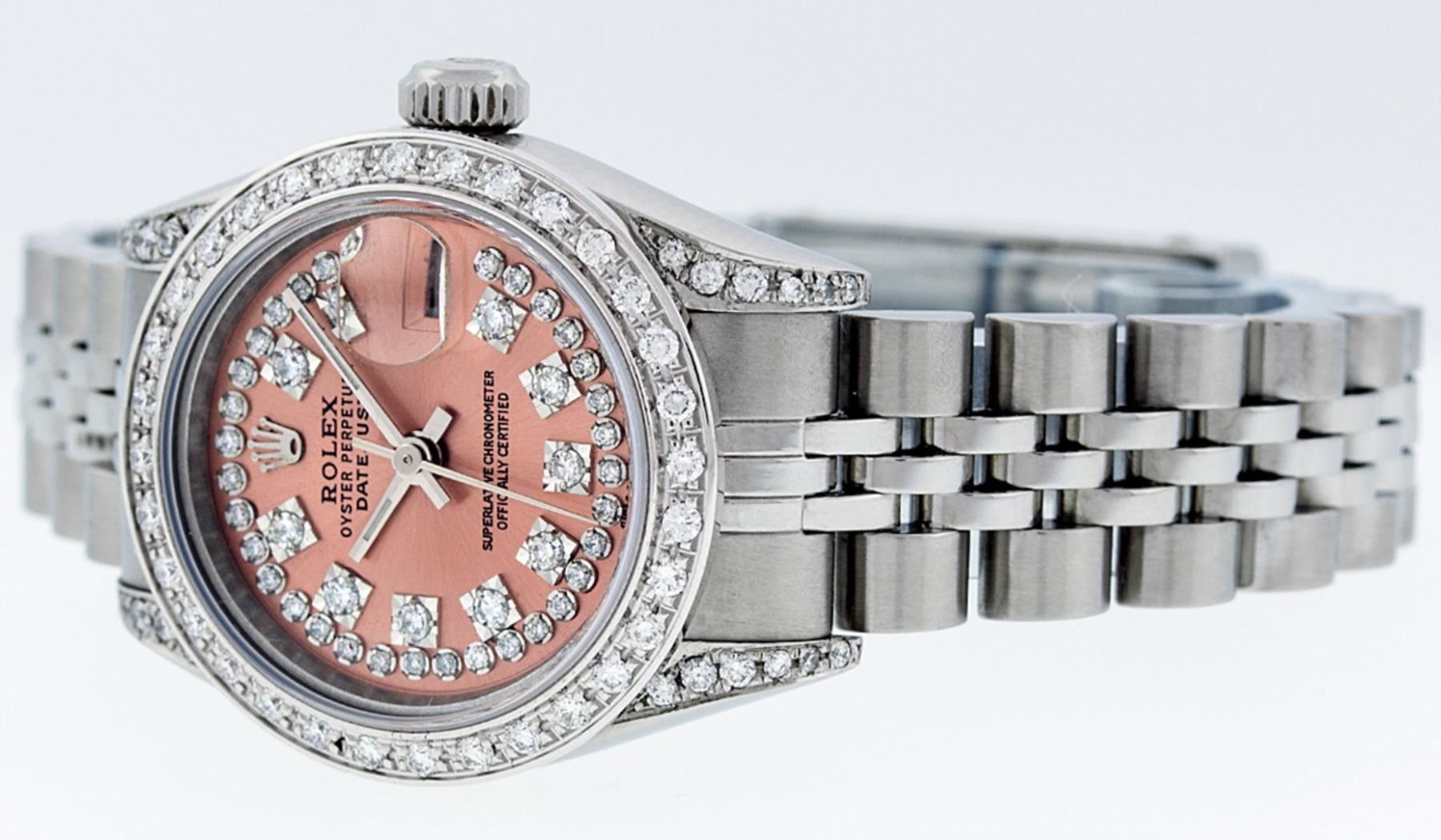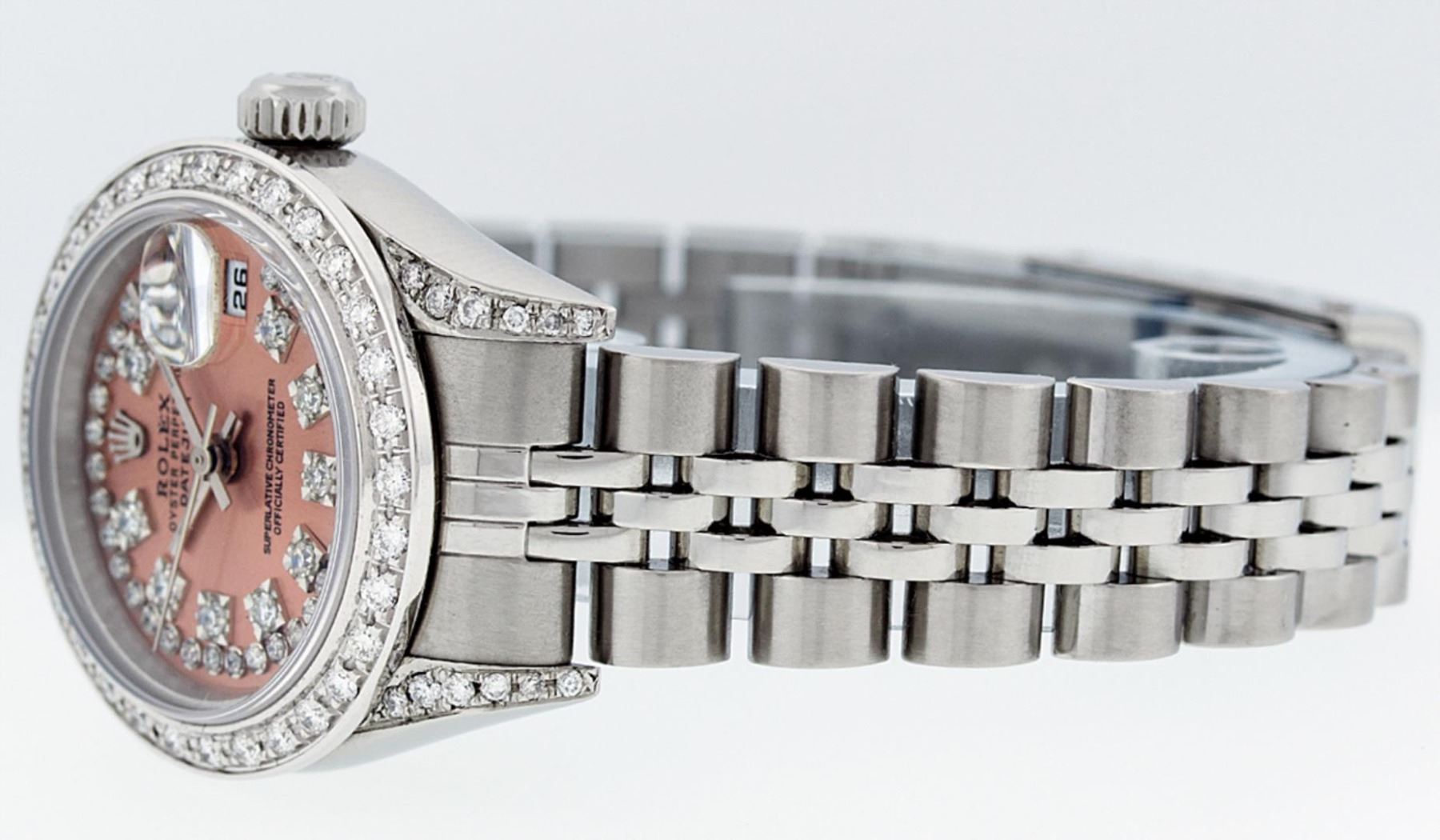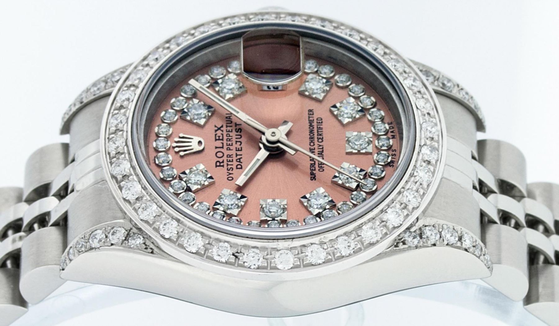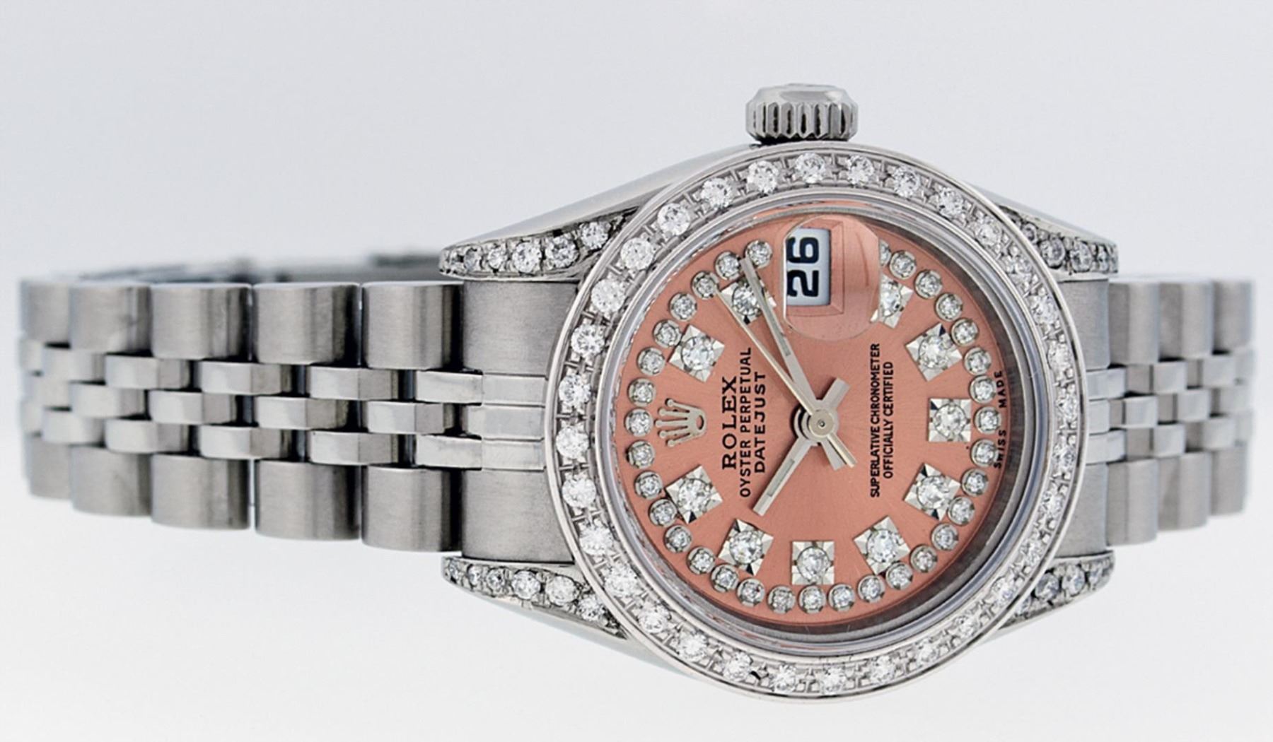 One Ladies Pre Owned Quickset Sapphire Stainless Steel Rolex Datejust Polished Bright with Satin Finish, Serviced And Electronically Tested, Stainless Steel Case: 26mm, Stainless Steel Crown, Custom Diamond Lugs: 24 Added Diamonds On Lugs. Custom Bezel: New 18K White Gold Beadset Diamond Bezel, Diamond Count: 32 Diamonds. Custom Crystal: New Sapphire With Date Window. Custom Hands: New Luminescent Hands. Rolex Movement: Automatic Quickset Winding Movement 2235. Custom Dial: Custom Salmon Dial With Added Diamonds, 43 Diamonds On Dial. Date Window: 3 O'Clock Position Date Display, Model: Quickset Datejust. Condition: G-6 Extra Fine. Rolex Bracelet: Stainless Steel Jubilee Band. Bright Polish And Satin Finish. 6.0 Inch Length, Adjustable. Standard Clasp, With Rolex Logo. This Watch Has Been Serviced Time Tested And Is In Excellent Condition It Is Free Of All Scratches And Dents.