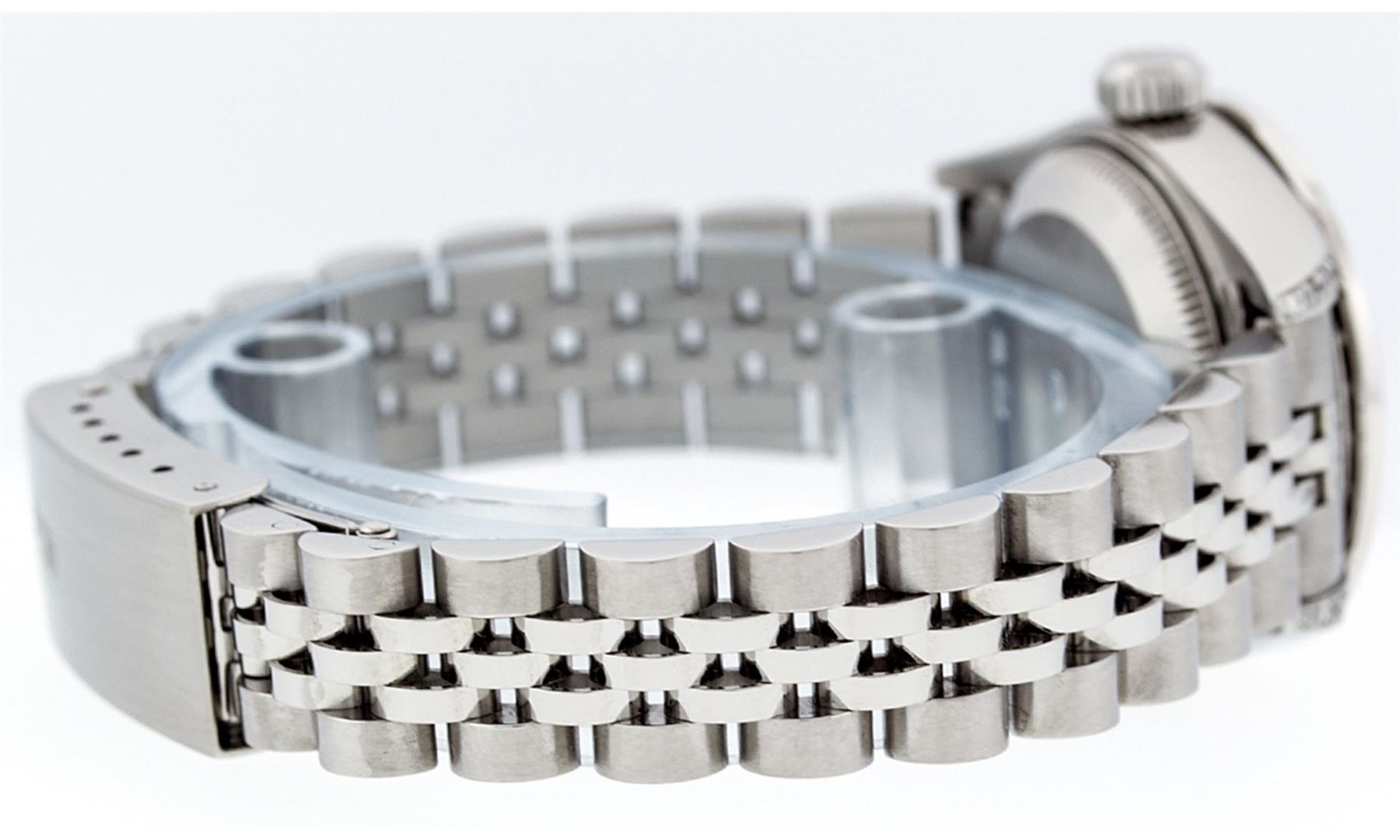One Ladies Pre Owned Quickset Sapphire Stainless Steel Rolex Datejust Polished Bright with Satin Finish, Serviced And Electronically Tested, Stainless Steel Case: 26mm, Stainless Steel Crown, Custom Diamond Lugs: 24 Added Diamonds On Lugs. Custom Bezel: New 18K White Gold Beadset Diamond Bezel, Diamond Count: 32 Diamonds. Custom Crystal: New Sapphire With Date Window. Custom Hands: New Luminescent Hands. Rolex Movement: Automatic Quickset Winding Movement 2235. Custom Dial: Custom Salmon Dial With Added Diamonds, 43 Diamonds On Dial. Date Window: 3 O'Clock Position Date Display, Model: Quickset Datejust. Condition: G-6 Extra Fine. Rolex Bracelet: Stainless Steel Jubilee Band. Bright Polish And Satin Finish. 6.0 Inch Length, Adjustable. Standard Clasp, With Rolex Logo. This Watch Has Been Serviced Time Tested And Is In Excellent Condition It Is Free Of All Scratches And Dents.