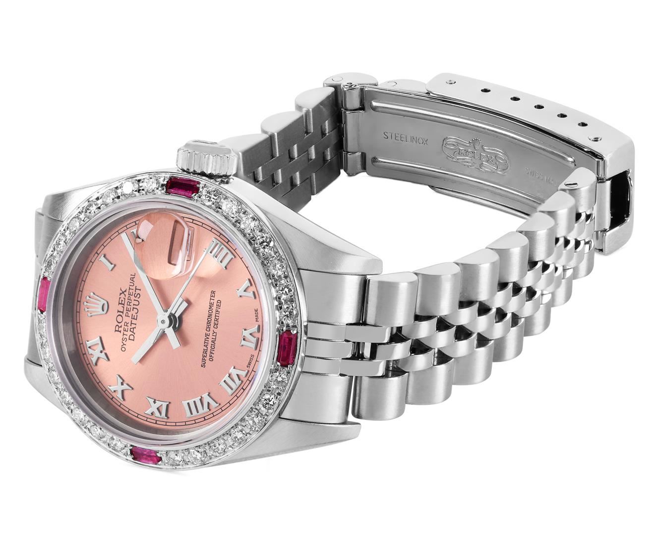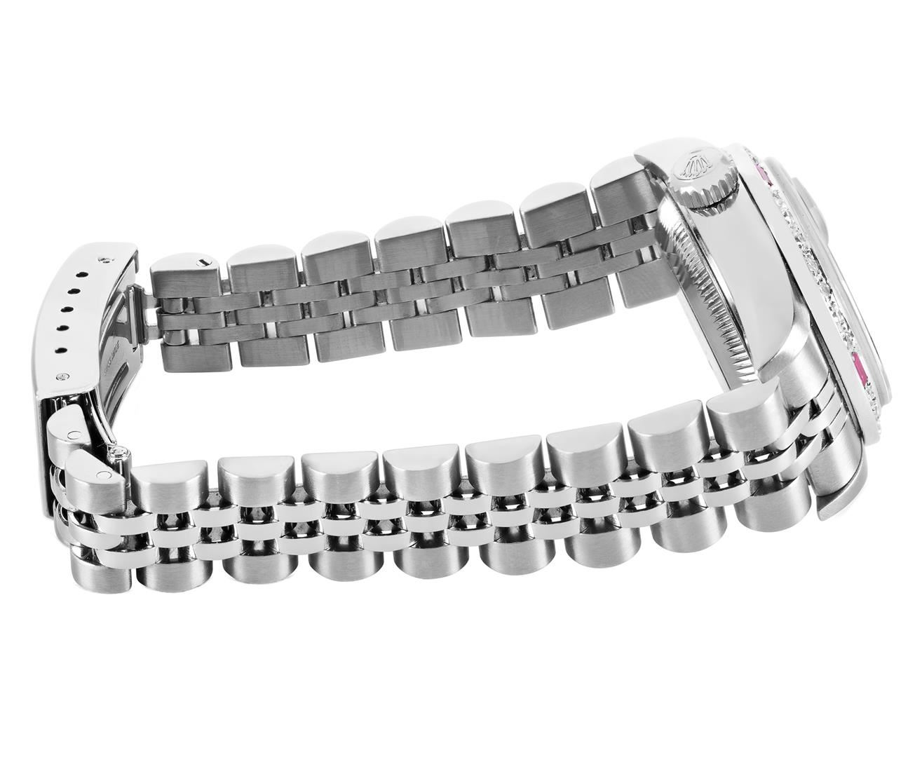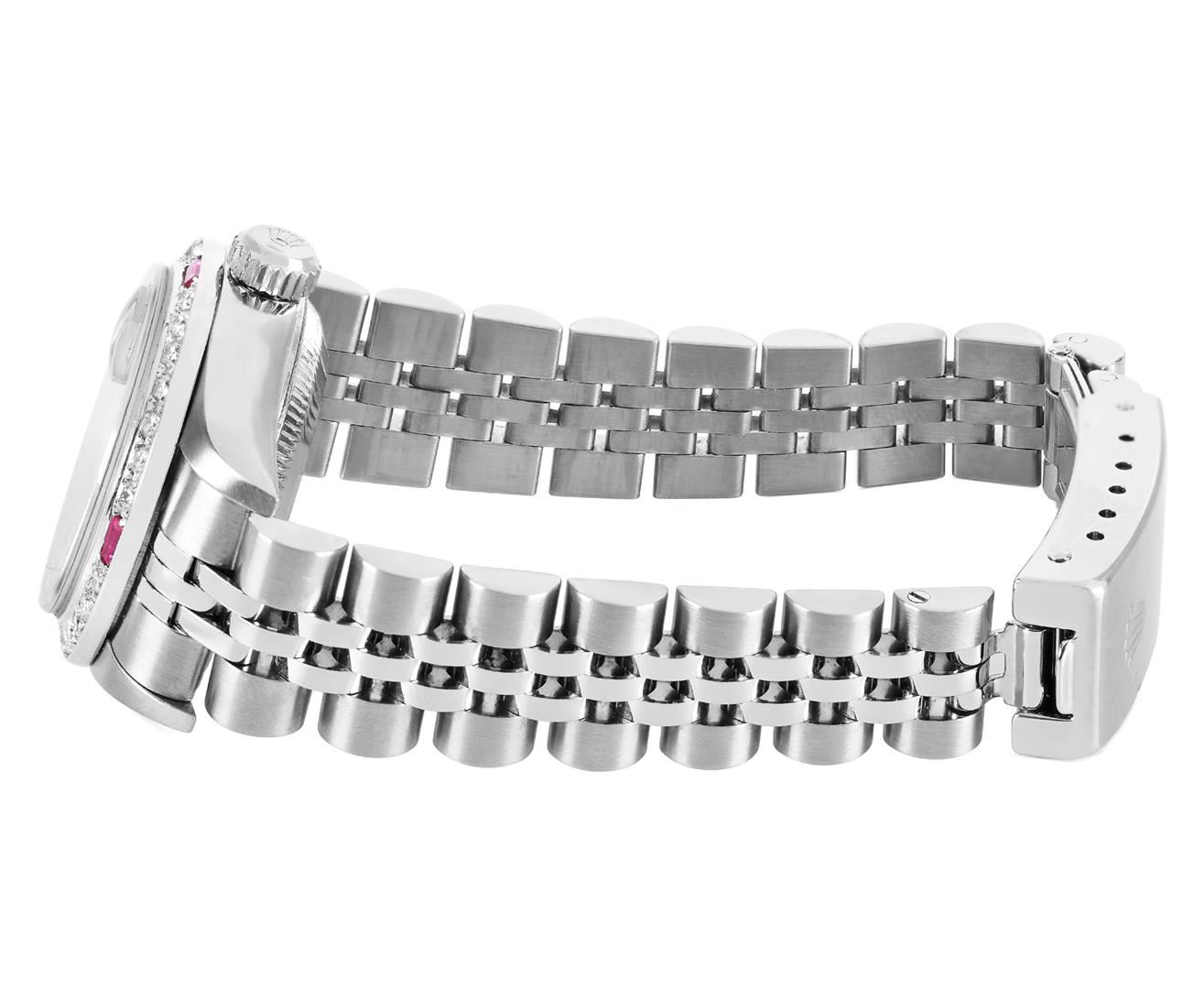 One Rolex Ladies Quickset Pre Owned Stainless Steel Datejust Wristwatch Polished Bright with Satin Finish, Serviced & Electronically Tested, Stainless Steel Case: 26mm, Stainless Steel Crown, Custom Bezel: New 18K White Gold Ruby Beadset Diamond Bezel, Di