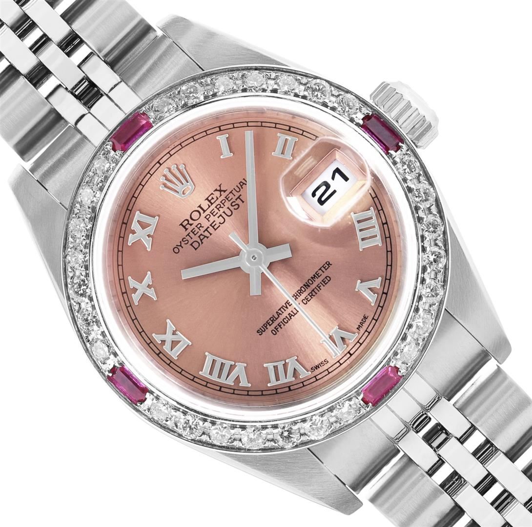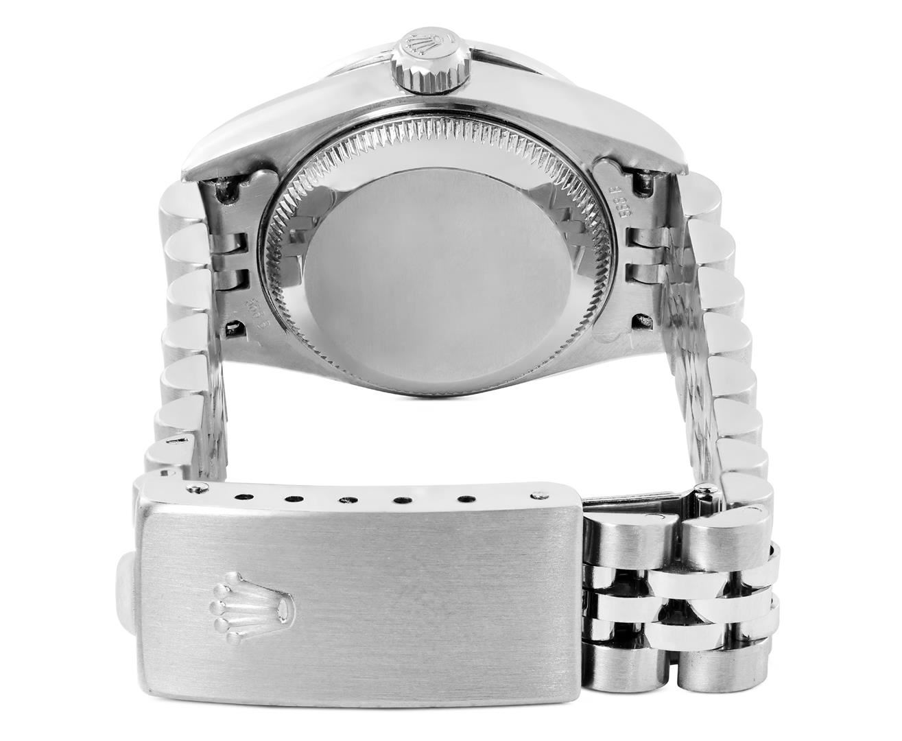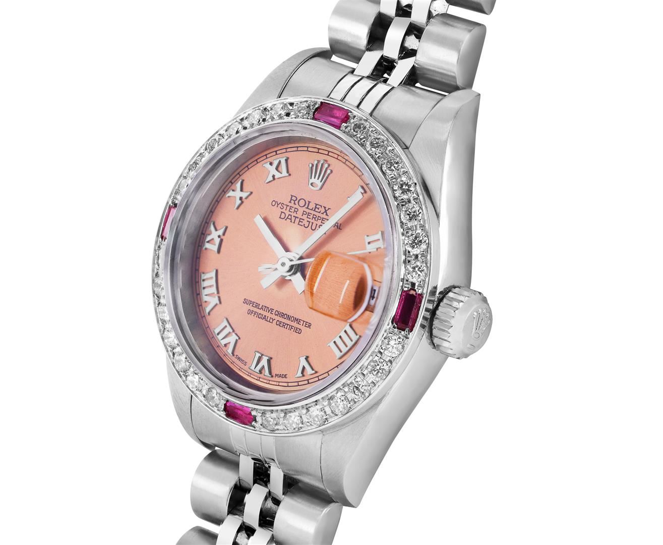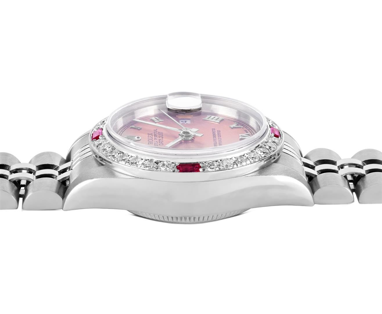 One Rolex Ladies Quickset Pre Owned Stainless Steel Datejust Wristwatch Polished Bright with Satin Finish, Serviced & Electronically Tested, Stainless Steel Case: 26mm, Stainless Steel Crown, Custom Bezel: New 18K White Gold Ruby Beadset Diamond Bezel, Di