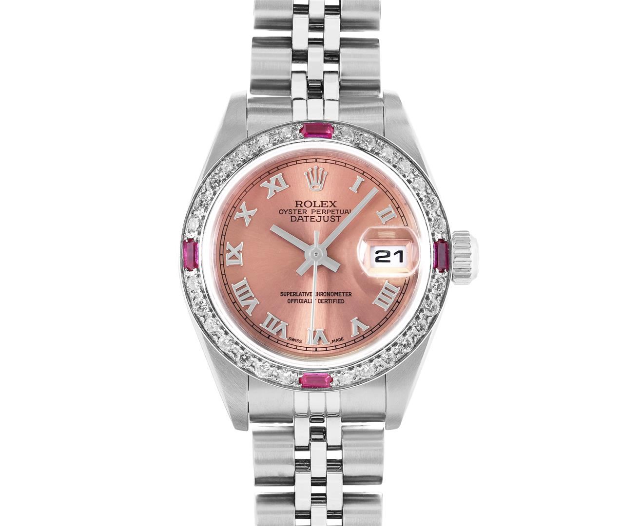 One Rolex Ladies Quickset Pre Owned Stainless Steel Datejust Wristwatch Polished Bright with Satin Finish, Serviced & Electronically Tested, Stainless Steel Case: 26mm, Stainless Steel Crown, Custom Bezel: New 18K White Gold Ruby Beadset Diamond Bezel, Di