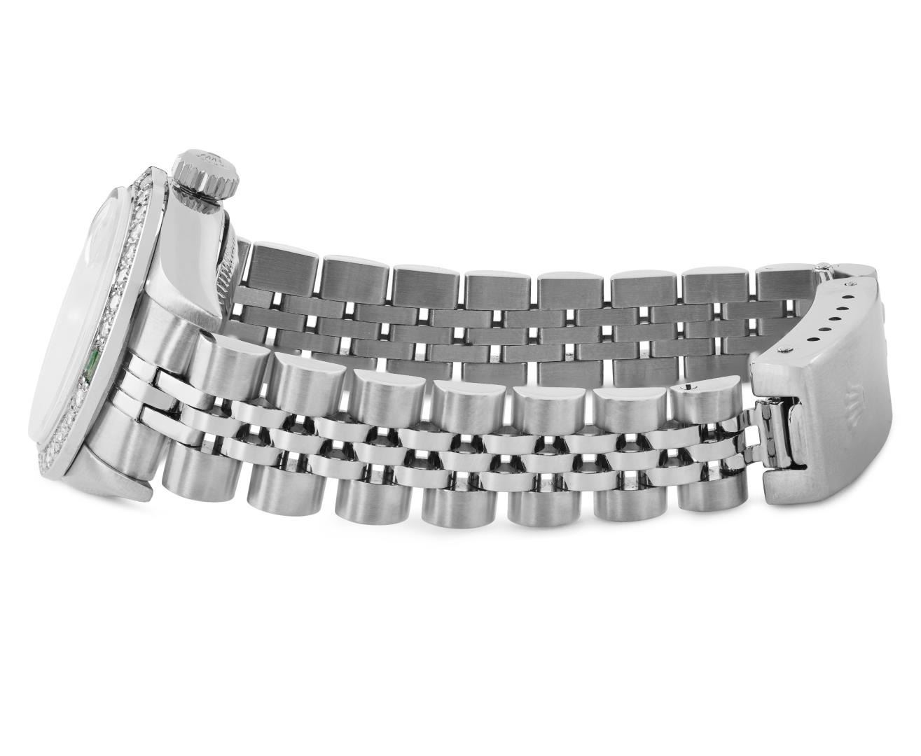 One Rolex Ladies Pre Owned Quickset Stainless Steel Datejust Wristwatch Polished Bright with Satin Finish, Serviced And Electronically Tested, Stainless Steel Case: 26mm, Stainless Steel Crown, Custom Bezel: New 18K White Gold Emerald Beadset Diamond Bezel, Diamond + Gem Count: 36 Diamonds + 4 Emeralds. Custom Crystal: New Sapphire With Magnified Date Window. Custom Hands: New Luminescent Hands. Rolex Movement: 2235 Automatic Winding Movement. Rolex Dial: Factory Silver Dial With Index Hour Markers, and Dash Track. Date Window: 3 O'Clock Position Date Display, Model: Quickset Datejust. Condition: G-6 Extra Fine. Rolex Bracelet: Stainless Steel Jubilee Band. Bright Polish And Satin Finish. 6.0 Inch Length, Adjustable. Standard Clasp, With Rolex Logo. This Watch Has Been Serviced Time Tested And Is In Excellent Condition. It Is Free Of All Scratches And Dents. This Watch Comes With A Rolex Box.