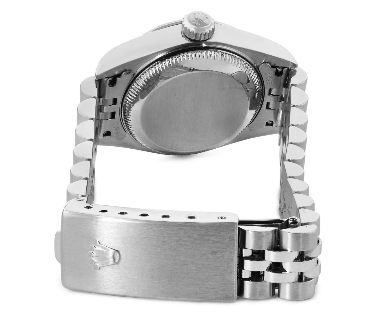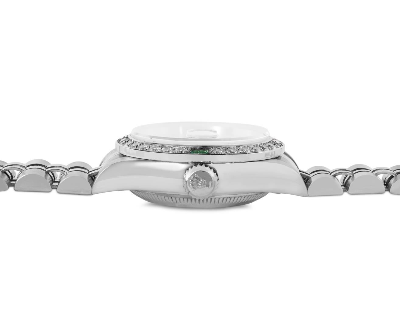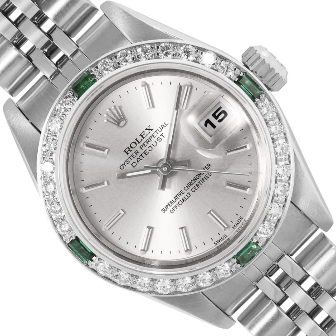 One Rolex Ladies Pre Owned Quickset Stainless Steel Datejust Wristwatch Polished Bright with Satin Finish, Serviced And Electronically Tested, Stainless Steel Case: 26mm, Stainless Steel Crown, Custom Bezel: New 18K White Gold Emerald Beadset Diamond Bezel, Diamond + Gem Count: 36 Diamonds + 4 Emeralds. Custom Crystal: New Sapphire With Magnified Date Window. Custom Hands: New Luminescent Hands. Rolex Movement: 2235 Automatic Winding Movement. Rolex Dial: Factory Silver Dial With Index Hour Markers, and Dash Track. Date Window: 3 O'Clock Position Date Display, Model: Quickset Datejust. Condition: G-6 Extra Fine. Rolex Bracelet: Stainless Steel Jubilee Band. Bright Polish And Satin Finish. 6.0 Inch Length, Adjustable. Standard Clasp, With Rolex Logo. This Watch Has Been Serviced Time Tested And Is In Excellent Condition. It Is Free Of All Scratches And Dents. This Watch Comes With A Rolex Box.