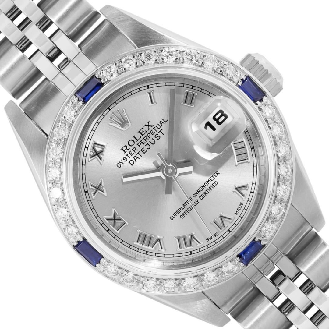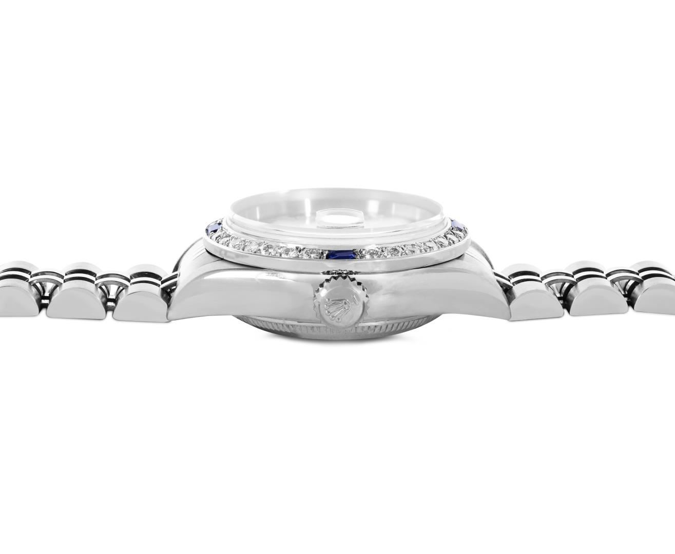 One Rolex Ladies Pre Owned Quickset Stainless Steel Datejust Wristwatch Polished Bright with Satin Finish, Serviced And Electronically Tested, Stainless Steel Case: 26mm, Stainless Steel Crown, Custom Bezel: New 18K White Gold Sapphire Beadset Diamond Bezel, Diamond + Gem Count: 36 Diamonds + 4 Sapphires. Custom Crystal: New Sapphire With Magnified Date Window. Custom Hands: New Solid Hands. Rolex Movement: 2235 Automatic Winding Movement. Rolex Dial: Factory Silver Dial With Roman Hour Markers, and Square Track. Date Window: 3 O'Clock Position Date Display, Model: Quickset Datejust. Condition: G-6 Extra Fine. Rolex Bracelet: Stainless Steel Jubilee Band. Bright Polish And Satin Finish. 6.0 Inch Length, Adjustable. Standard Clasp, With Rolex Logo. This Watch Has Been Serviced Time Tested And Is In Excellent Condition. It Is Free Of All Scratches And Dents.