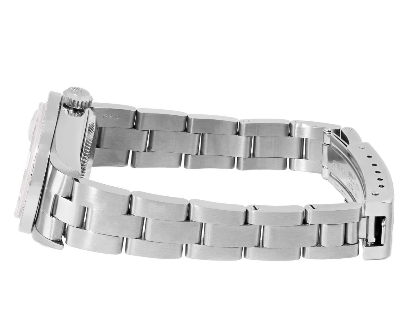 One Rolex Ladies Quickset Pre Owned Stainless Steel Date Wristwatch Polished Bright with Satin Finish, Serviced & Electronically Tested, Stainless Steel Case: 26mm, Stainless Steel Crown, Custom Bezel: New Stainless Steel Beadset Diamond Bezel, Diamond Count: 40 Diamonds On Bezel. Custom Crystal: New Sapphire With Magnified Date Window. Custom Hands: New Solid Hands. Rolex Movement: 2235 Automatic Winding Movement. Rolex Dial: Factory White With Roman Hour Markers, Square Track. Date Window: 3 O'Clock Position Date Display, Model: Quickset Sapphire Date. Condition: G-6 Extra Fine. Rolex Bracelet: Stainless Steel Jubilee Band. Bright Polish & Satin Finish. 6.0 Inch Length, Adjustable. Standard Clasp, With Rolex Logo. This Watch Has Been Serviced And Time Tested. It Is In Excellent Condition, Free Of All Scratches And Dents.