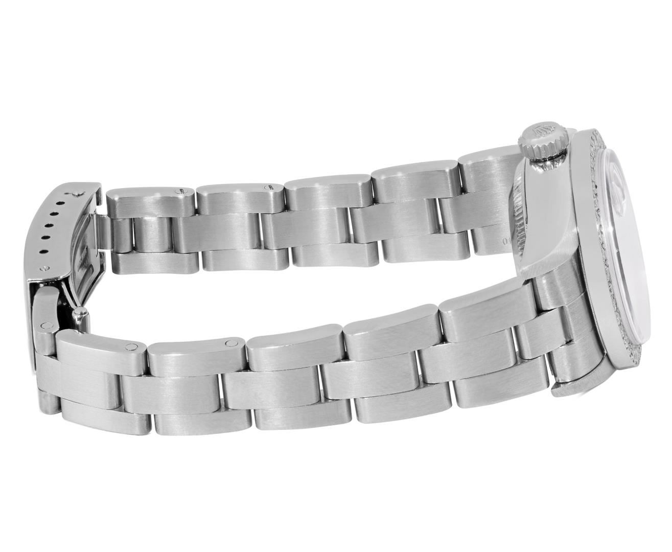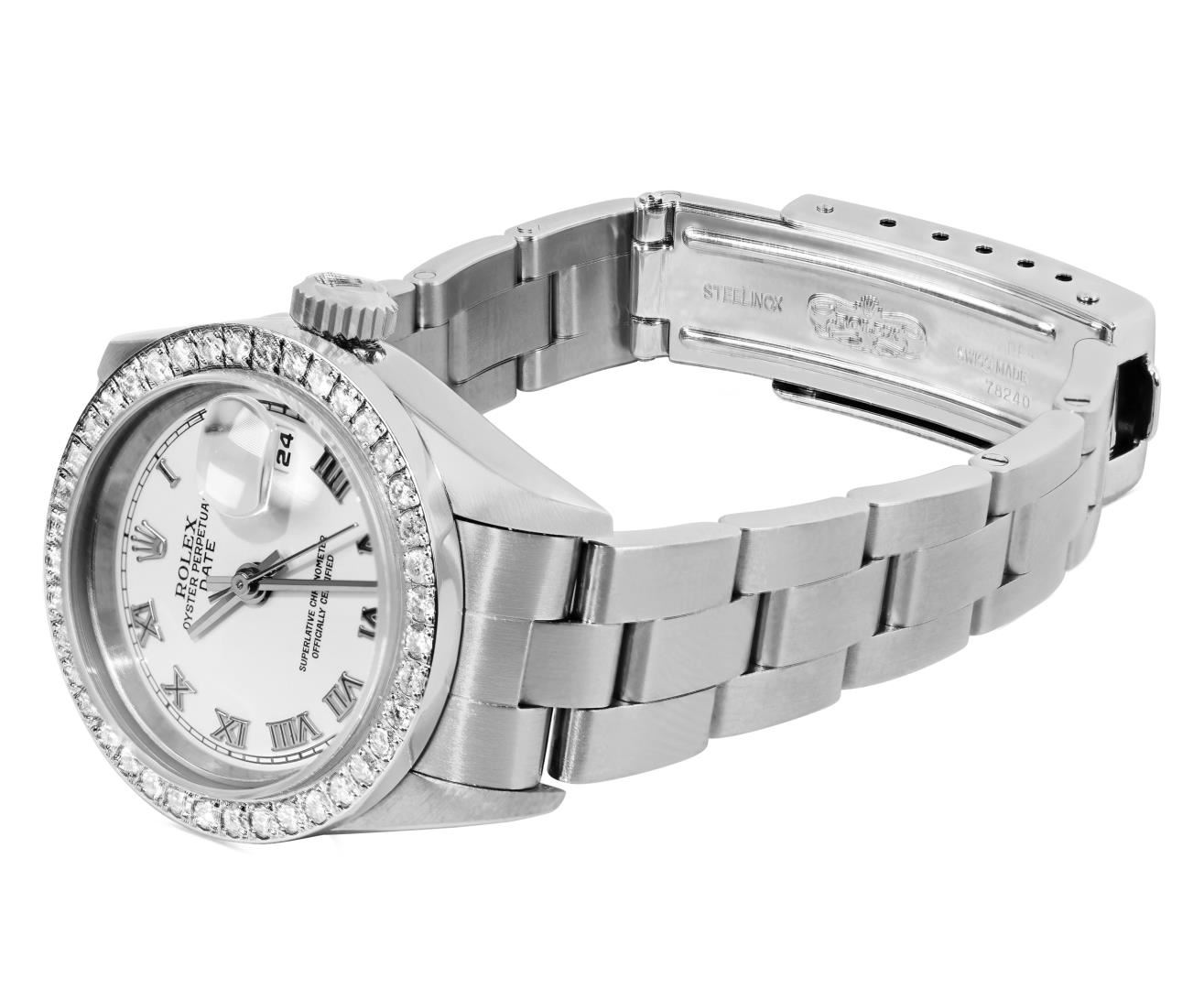 One Rolex Ladies Quickset Pre Owned Stainless Steel Date Wristwatch Polished Bright with Satin Finish, Serviced & Electronically Tested, Stainless Steel Case: 26mm, Stainless Steel Crown, Custom Bezel: New Stainless Steel Beadset Diamond Bezel, Diamond Count: 40 Diamonds On Bezel. Custom Crystal: New Sapphire With Magnified Date Window. Custom Hands: New Solid Hands. Rolex Movement: 2235 Automatic Winding Movement. Rolex Dial: Factory White With Roman Hour Markers, Square Track. Date Window: 3 O'Clock Position Date Display, Model: Quickset Sapphire Date. Condition: G-6 Extra Fine. Rolex Bracelet: Stainless Steel Jubilee Band. Bright Polish & Satin Finish. 6.0 Inch Length, Adjustable. Standard Clasp, With Rolex Logo. This Watch Has Been Serviced And Time Tested. It Is In Excellent Condition, Free Of All Scratches And Dents.
