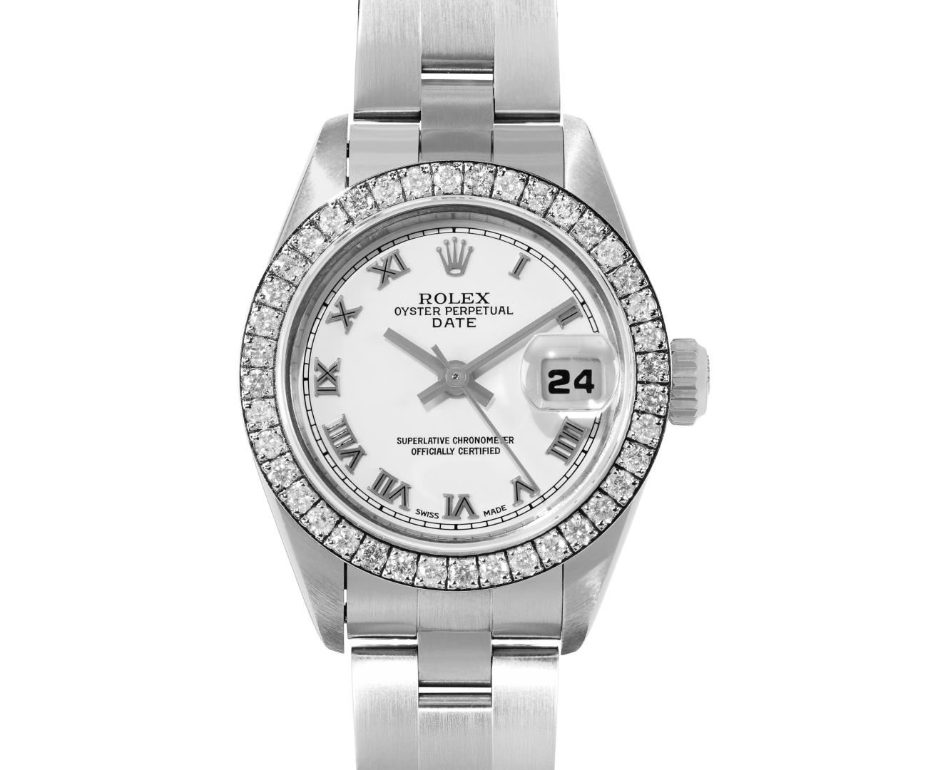 One Rolex Ladies Quickset Pre Owned Stainless Steel Date Wristwatch Polished Bright with Satin Finish, Serviced & Electronically Tested, Stainless Steel Case: 26mm, Stainless Steel Crown, Custom Bezel: New Stainless Steel Beadset Diamond Bezel, Diamond Count: 40 Diamonds On Bezel. Custom Crystal: New Sapphire With Magnified Date Window. Custom Hands: New Solid Hands. Rolex Movement: 2235 Automatic Winding Movement. Rolex Dial: Factory White With Roman Hour Markers, Square Track. Date Window: 3 O'Clock Position Date Display, Model: Quickset Sapphire Date. Condition: G-6 Extra Fine. Rolex Bracelet: Stainless Steel Jubilee Band. Bright Polish & Satin Finish. 6.0 Inch Length, Adjustable. Standard Clasp, With Rolex Logo. This Watch Has Been Serviced And Time Tested. It Is In Excellent Condition, Free Of All Scratches And Dents.