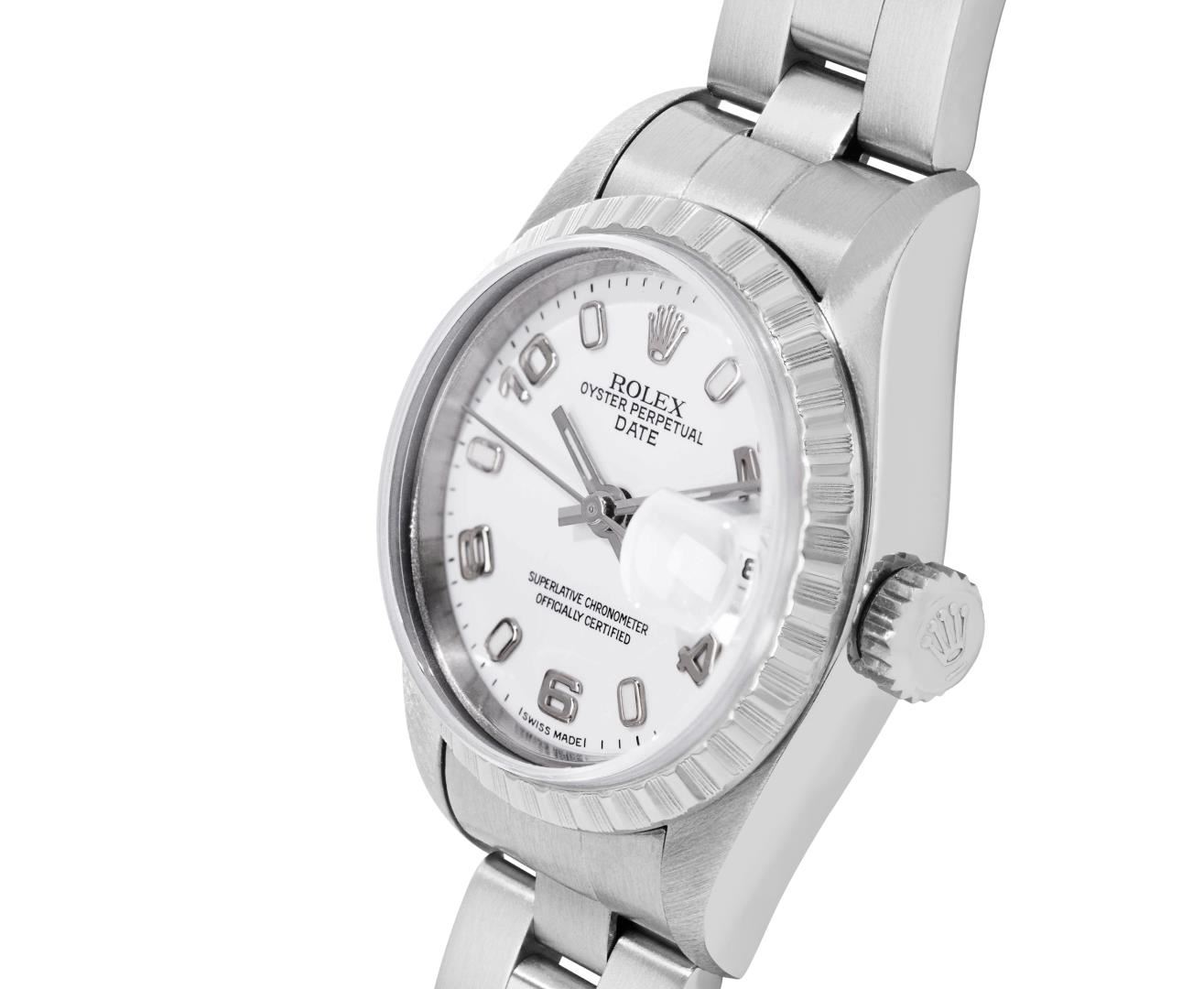 One Rolex Ladies Pre Owned Quickset Sapphire Stainless Steel Date Wristwatch Polished Bright with Satin Finish, Serviced & Electronically Tested, Stainless Steel Case: 26mm, Stainless Steel Crown, Rolex Stainless Steel Engine Turn bezel. Crystal: Sapphire With Magnified Date Window. Custom Hands: New Luminescent Hands. Rolex Movement: 2235 Automatic Winding Movement. Rolex Dial: Rolex White Arabic Dial with Arabic and Luminous Index Hour Markers With Dash Track. Date Window: 3 O'Clock Position Date Display, Model: Quickset Sapphire Date. Condition: G-6 Extra Fine. Rolex Bracelet: Stainless Steel Oyster Band. Bright Polish & Satin Finish. 6.0 Inch Length, Adjustable. Standard Clasp, With Rolex Logo. This Watch Has Been Serviced And Time Tested. It Is In Excellent Condition, Free Of All Scratches And Dents. This Watch Comes With A Rolex Box.