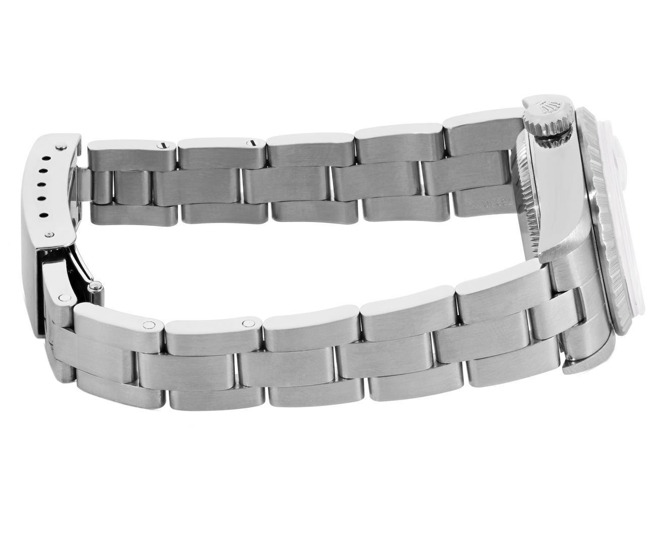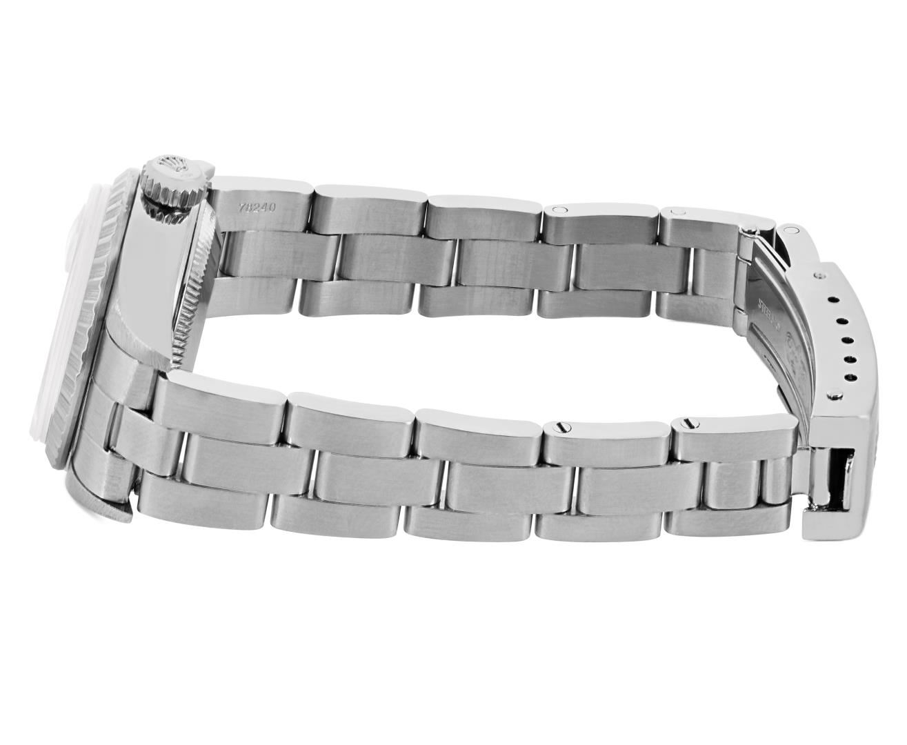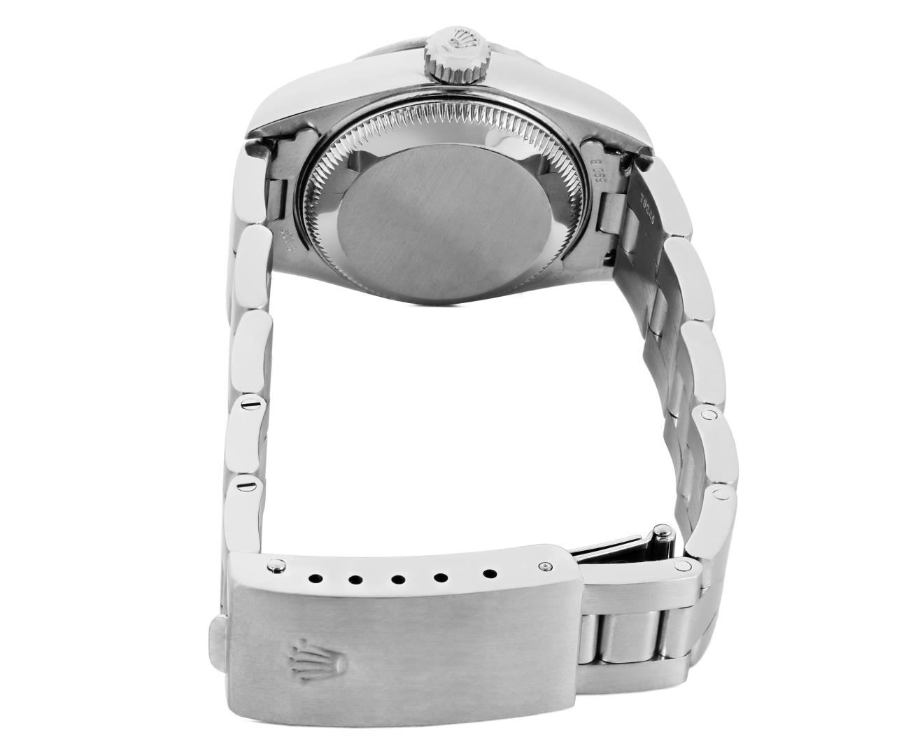 One Rolex Ladies Pre Owned Quickset Sapphire Stainless Steel Date Wristwatch Polished Bright with Satin Finish, Serviced & Electronically Tested, Stainless Steel Case: 26mm, Stainless Steel Crown, Rolex Stainless Steel Engine Turn bezel. Crystal: Sapphire With Magnified Date Window. Custom Hands: New Luminescent Hands. Rolex Movement: 2235 Automatic Winding Movement. Rolex Dial: Rolex White Arabic Dial with Arabic and Luminous Index Hour Markers With Dash Track. Date Window: 3 O'Clock Position Date Display, Model: Quickset Sapphire Date. Condition: G-6 Extra Fine. Rolex Bracelet: Stainless Steel Oyster Band. Bright Polish & Satin Finish. 6.0 Inch Length, Adjustable. Standard Clasp, With Rolex Logo. This Watch Has Been Serviced And Time Tested. It Is In Excellent Condition, Free Of All Scratches And Dents. This Watch Comes With A Rolex Box.