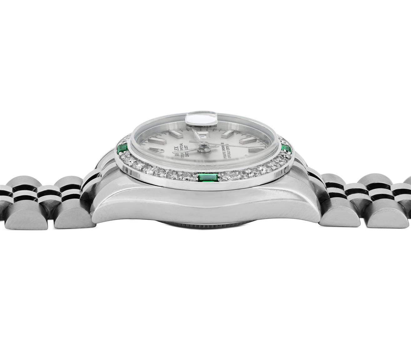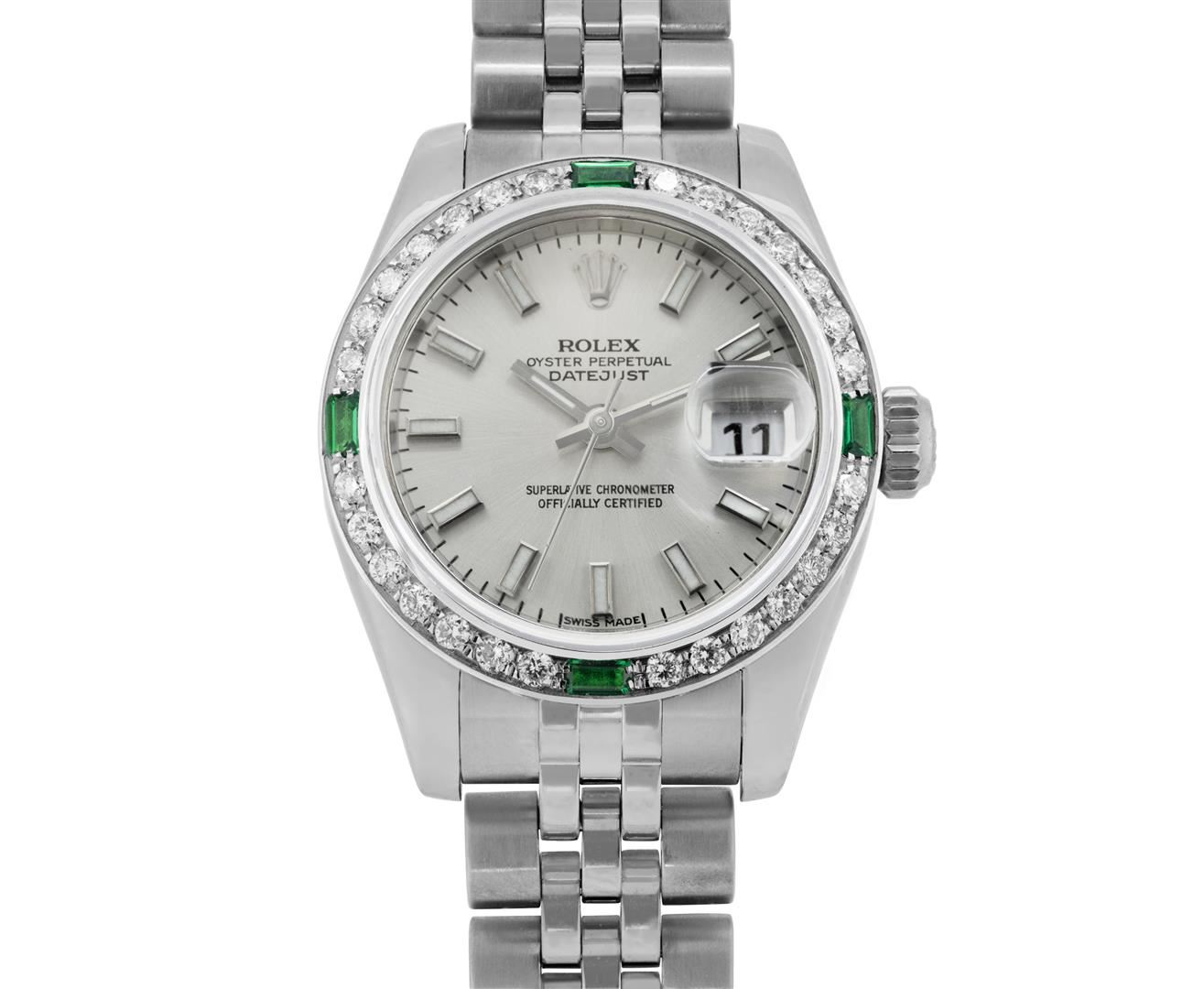 One Rolex Ladies Pre Owned Stainless Steel Datejust Wristwatch Polished Bright with Satin Finish, Serviced & Electronically Tested, Stainless Steel Case: 26mm, Stainless Steel Crown, Custom Bezel: New 18K White Gold Emerald Beadset Diamond Bezel, Diamond + Gem Count: 36 Diamonds + 4 Emeralds, Clarity: SI-VS, Color: G to H. Crystal: Sapphire With Magnified Date Window. Hands: Luminescent Hands. Rolex Movement: 2235 Automatic Winding Movement. Rolex Dial: Factory Silver Dial With Index Hour Markers And Dash Tracks. Date Window: 3 O'Clock Position Date Display, Model: Datejust. Condition: G-6 Extra Fine. Rolex Bracelet: Stainless Steel Jubilee Band With Hidden Clasp. Bright Polish & Satin Finish. 6.0 Inch Length, Adjustable. Hidden Clasp, With Rolex Logo. This Watch Has Been Serviced And Time Tested. It Is In Excellent Condition, Free Of All Scratches And Dents.