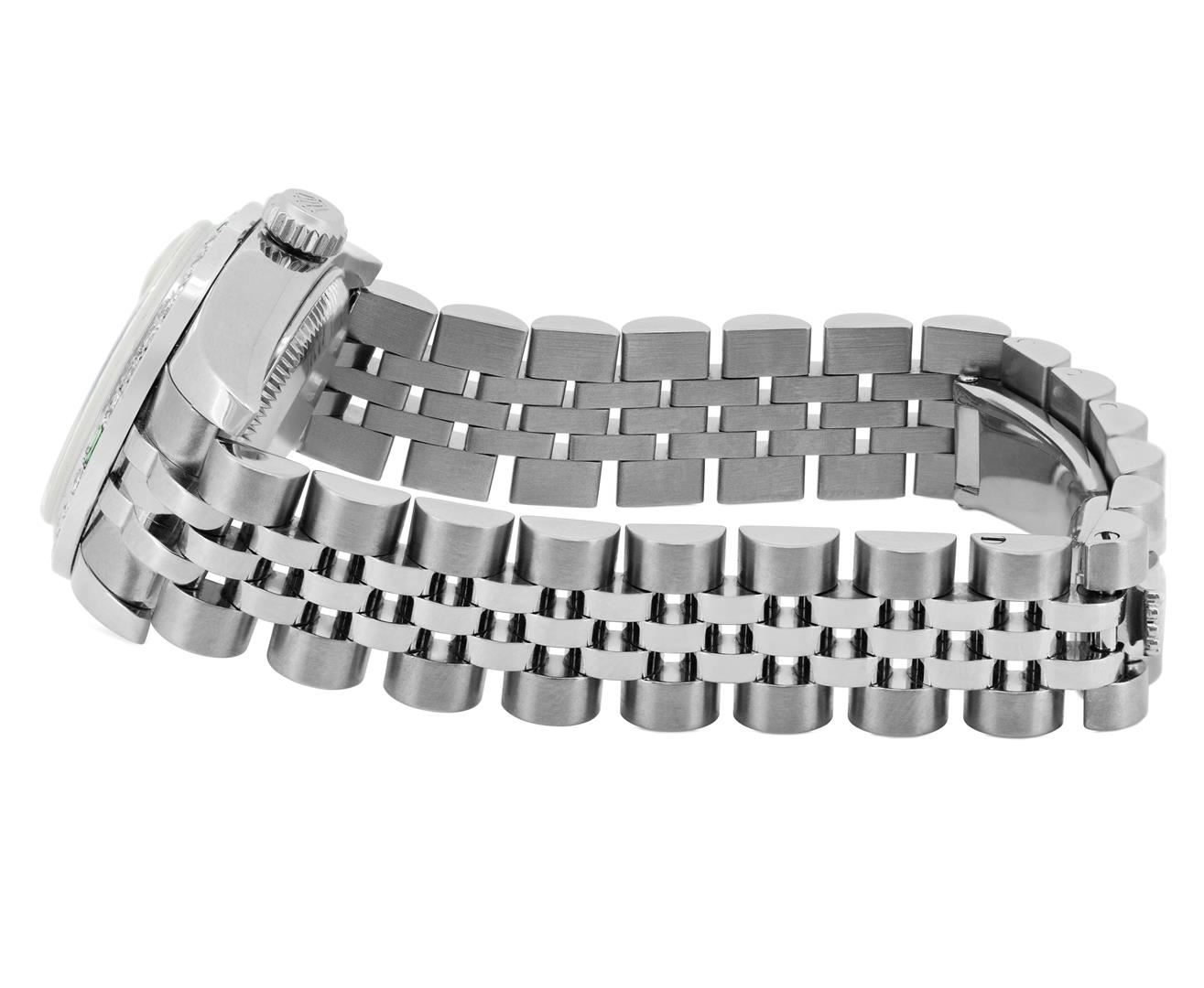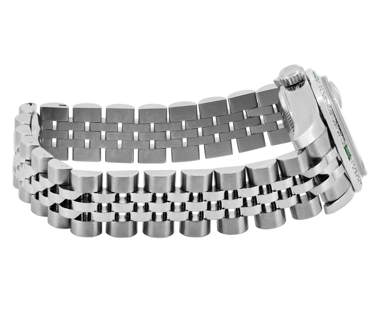 One Rolex Ladies Pre Owned Stainless Steel Datejust Wristwatch Polished Bright with Satin Finish, Serviced & Electronically Tested, Stainless Steel Case: 26mm, Stainless Steel Crown, Custom Bezel: New 18K White Gold Emerald Beadset Diamond Bezel, Diamond + Gem Count: 36 Diamonds + 4 Emeralds, Clarity: SI-VS, Color: G to H. Crystal: Sapphire With Magnified Date Window. Hands: Luminescent Hands. Rolex Movement: 2235 Automatic Winding Movement. Rolex Dial: Factory Silver Dial With Index Hour Markers And Dash Tracks. Date Window: 3 O'Clock Position Date Display, Model: Datejust. Condition: G-6 Extra Fine. Rolex Bracelet: Stainless Steel Jubilee Band With Hidden Clasp. Bright Polish & Satin Finish. 6.0 Inch Length, Adjustable. Hidden Clasp, With Rolex Logo. This Watch Has Been Serviced And Time Tested. It Is In Excellent Condition, Free Of All Scratches And Dents.
