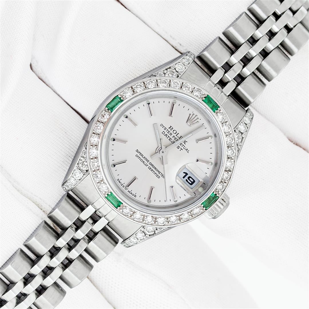 One Ladies Pre Owned Quickset Stainless Steel Rolex Datejust Polished Bright with Satin Finish, Serviced & Electronically Tested, Stainless Steel Case: 26mm, Custom Diamond Lugs: Added Diamonds On Lugs, Diamond Count: 24 Diamonds On Bezel, Color: G To H, Clartity: SI-VS. Rolex Stainless Steel Crown, Custom Bezel: New 18K White Gold Emerald Bead Set Diamond Bezel, Diamond + Gem Count: 28 Diamonds + 4 Emeralds, Clarity: SI-VS, Color: G to H. Custom Crystal: New Sapphire With Magnified Date Window. Custom Hands: New Luminescent Hands. Rolex Movement: Automatic Winding Movement 2235. Rolex Dial: Silver With Index Hour Markers With Dash Track & Lumi Dot. Date Window: 3 O'Clock Position Date Display, Model: Quickset Datejust. Condition: G-6 Extra Fine. Rolex Bracelet: Stainless Steel Jubilee Band. Bright Polish & Satin Finish. 6.0 Inch Length, Adjustable. Standard Clasp, With Rolex Logo. This Watch Has Been Serviced Time Tested And Is In Excellent Condition It Is Free Of All Scratches And Dents.