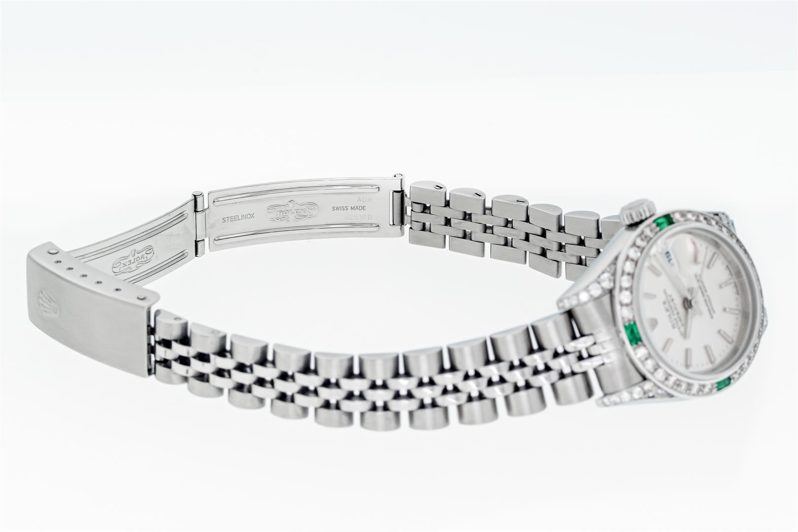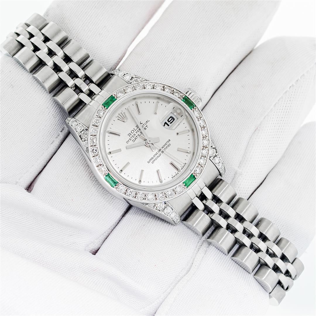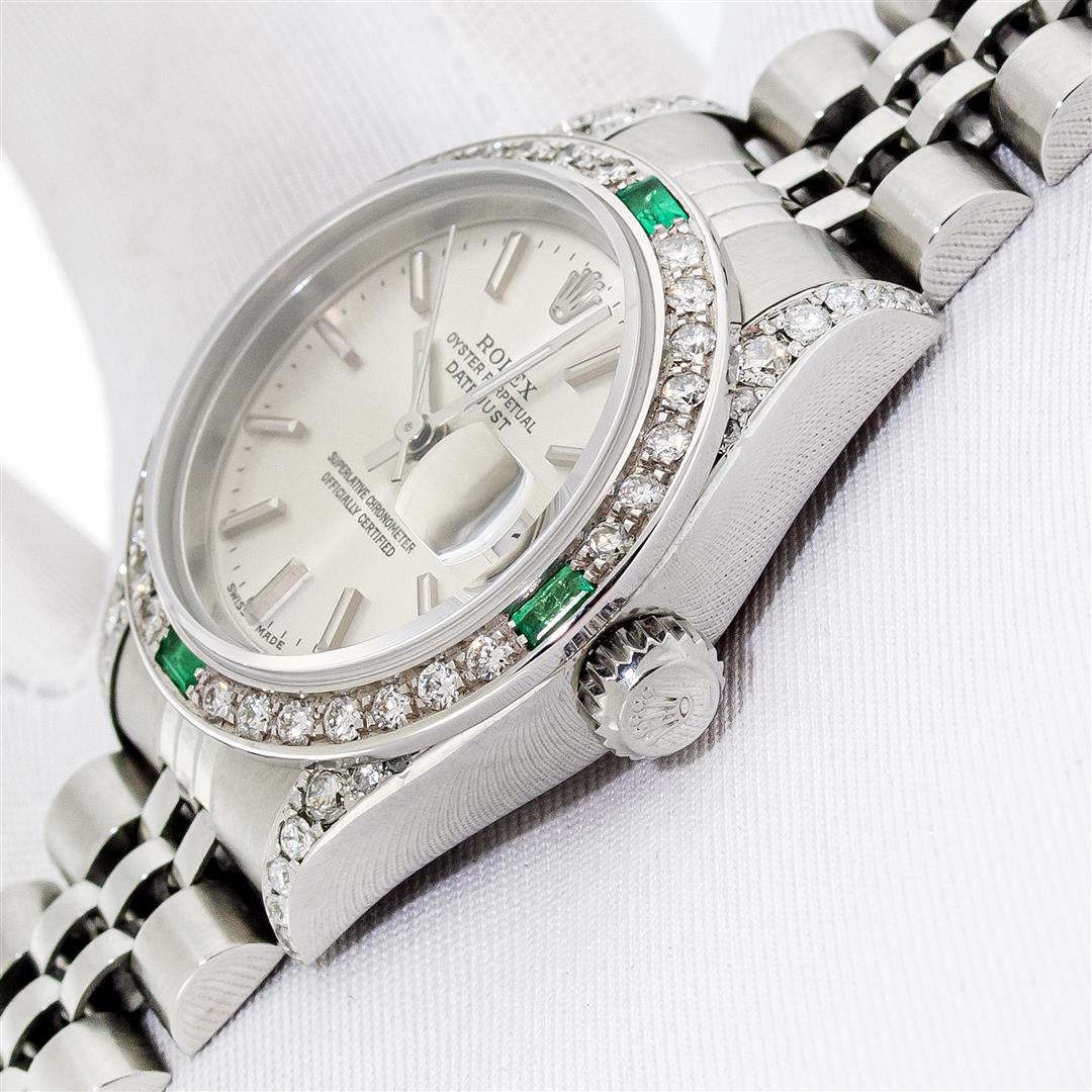 One Ladies Pre Owned Quickset Stainless Steel Rolex Datejust Polished Bright with Satin Finish, Serviced & Electronically Tested, Stainless Steel Case: 26mm, Custom Diamond Lugs: Added Diamonds On Lugs, Diamond Count: 24 Diamonds On Bezel, Color: G To H, Clartity: SI-VS. Rolex Stainless Steel Crown, Custom Bezel: New 18K White Gold Emerald Bead Set Diamond Bezel, Diamond + Gem Count: 28 Diamonds + 4 Emeralds, Clarity: SI-VS, Color: G to H. Custom Crystal: New Sapphire With Magnified Date Window. Custom Hands: New Luminescent Hands. Rolex Movement: Automatic Winding Movement 2235. Rolex Dial: Silver With Index Hour Markers With Dash Track & Lumi Dot. Date Window: 3 O'Clock Position Date Display, Model: Quickset Datejust. Condition: G-6 Extra Fine. Rolex Bracelet: Stainless Steel Jubilee Band. Bright Polish & Satin Finish. 6.0 Inch Length, Adjustable. Standard Clasp, With Rolex Logo. This Watch Has Been Serviced Time Tested And Is In Excellent Condition It Is Free Of All Scratches And Dents.