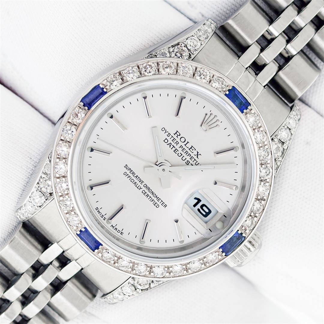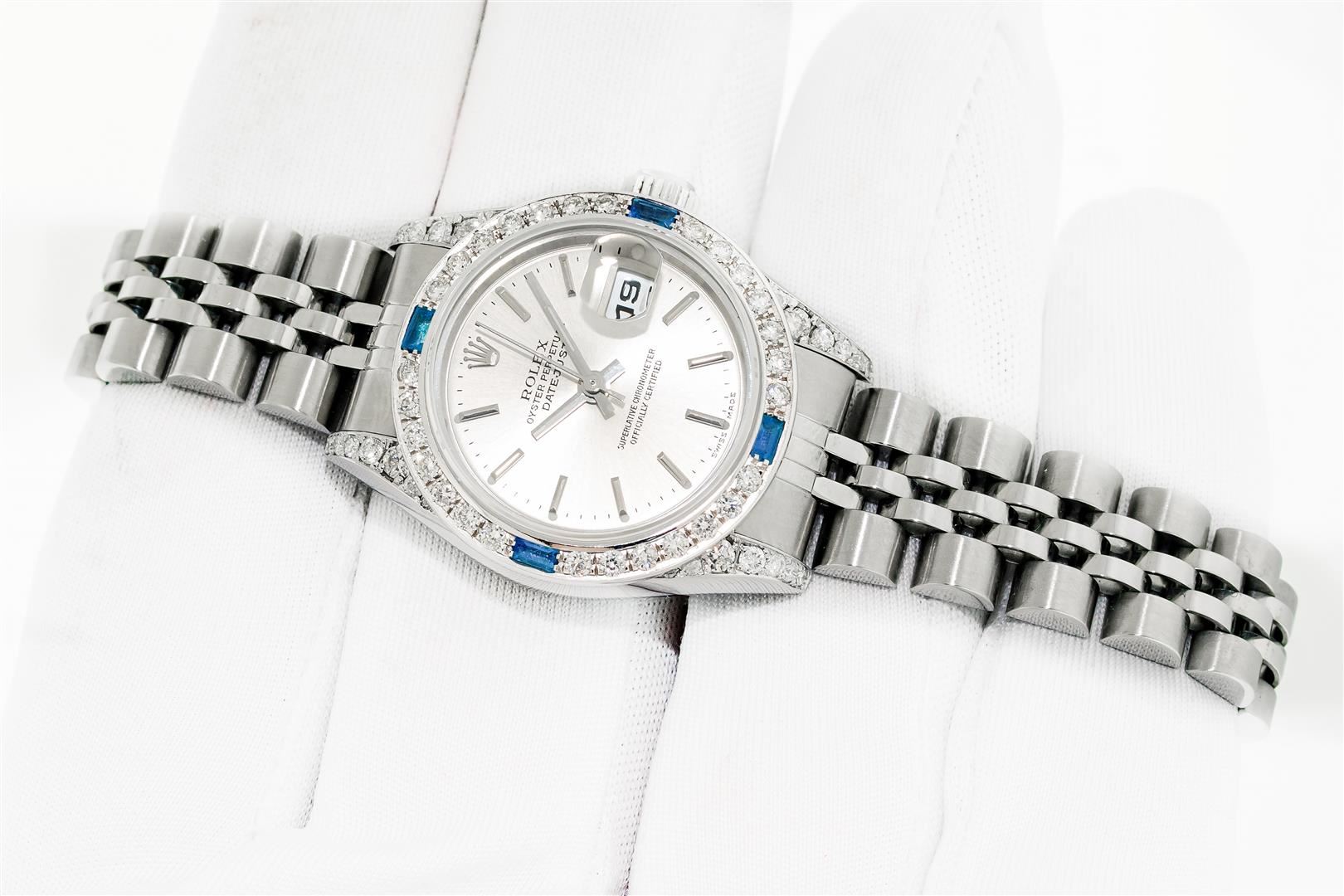 One Ladies Pre Owned Quickset Stainless Steel Rolex Datejust Polished Bright with Satin Finish, Serviced & Electronically Tested, Stainless Steel Case: 26mm, Custom Diamond Lugs: Added Diamonds On Lugs, Diamond Count: 24 Diamonds On Bezel, Color: G To H, Clartity: SI-VS. Rolex Stainless Steel Crown, Custom Bezel: New 18K White Gold Sapphire Bead Set Diamond Bezel, Diamond + Gem Count: 28 Diamonds + 4 Sapphires, Clarity: SI-VS, Color: G to H. Custom Crystal: New Sapphire With Magnified Date Window. Custom Hands: New Luminescent Hands. Rolex Movement: Automatic Winding Movement 2235. Rolex Dial: Silver With Index Hour Markers With Dash Track & Lumi Dot. Date Window: 3 O'Clock Position Date Display, Model: Quickset Datejust. Condition: G-6 Extra Fine. Rolex Bracelet: Stainless Steel Jubilee Band. Bright Polish & Satin Finish. 6.0 Inch Length, Adjustable. Standard Clasp, With Rolex Logo. This Watch Has Been Serviced Time Tested And Is In Excellent Condition It Is Free Of All Scratches And Dents.