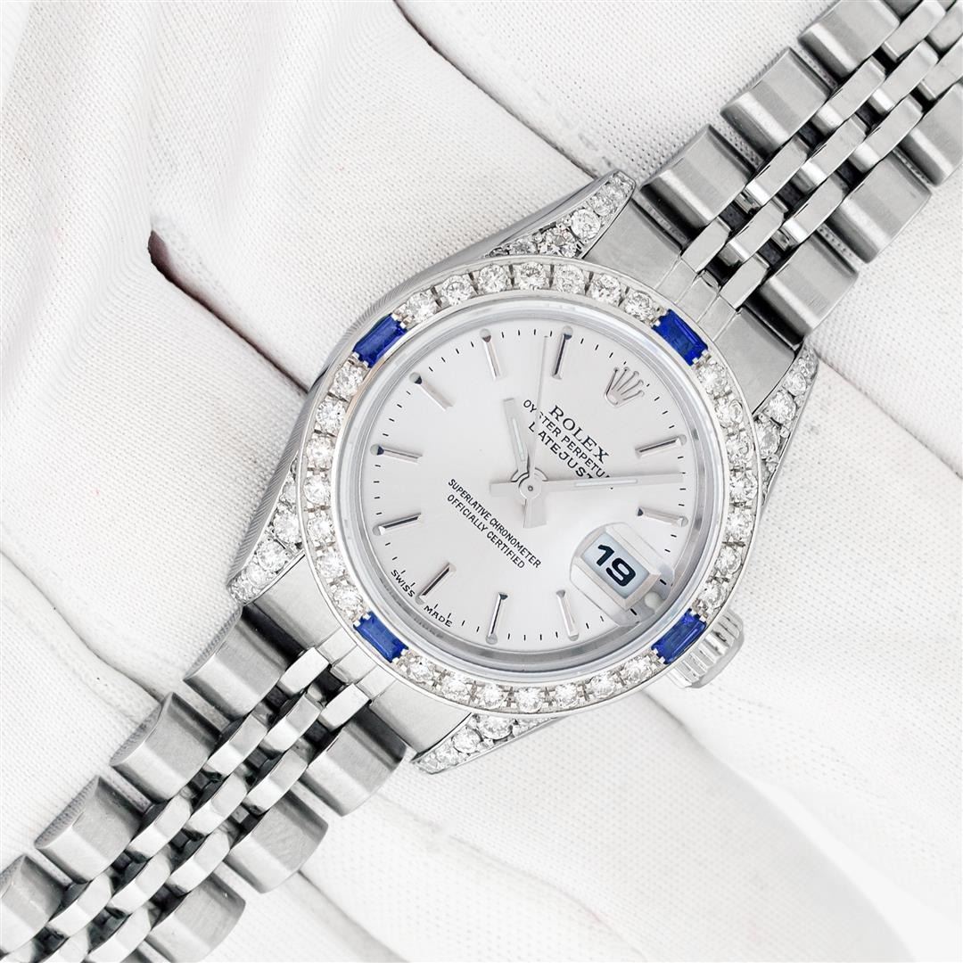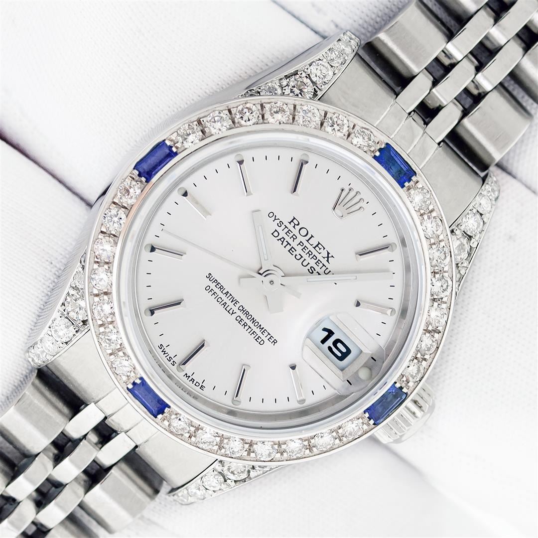 One Ladies Pre Owned Quickset Stainless Steel Rolex Datejust Polished Bright with Satin Finish, Serviced & Electronically Tested, Stainless Steel Case: 26mm, Custom Diamond Lugs: Added Diamonds On Lugs, Diamond Count: 24 Diamonds On Bezel, Color: G To H, Clartity: SI-VS. Rolex Stainless Steel Crown, Custom Bezel: New 18K White Gold Sapphire Bead Set Diamond Bezel, Diamond + Gem Count: 28 Diamonds + 4 Sapphires, Clarity: SI-VS, Color: G to H. Custom Crystal: New Sapphire With Magnified Date Window. Custom Hands: New Luminescent Hands. Rolex Movement: Automatic Winding Movement 2235. Rolex Dial: Silver With Index Hour Markers With Dash Track & Lumi Dot. Date Window: 3 O'Clock Position Date Display, Model: Quickset Datejust. Condition: G-6 Extra Fine. Rolex Bracelet: Stainless Steel Jubilee Band. Bright Polish & Satin Finish. 6.0 Inch Length, Adjustable. Standard Clasp, With Rolex Logo. This Watch Has Been Serviced Time Tested And Is In Excellent Condition It Is Free Of All Scratches And Dents.