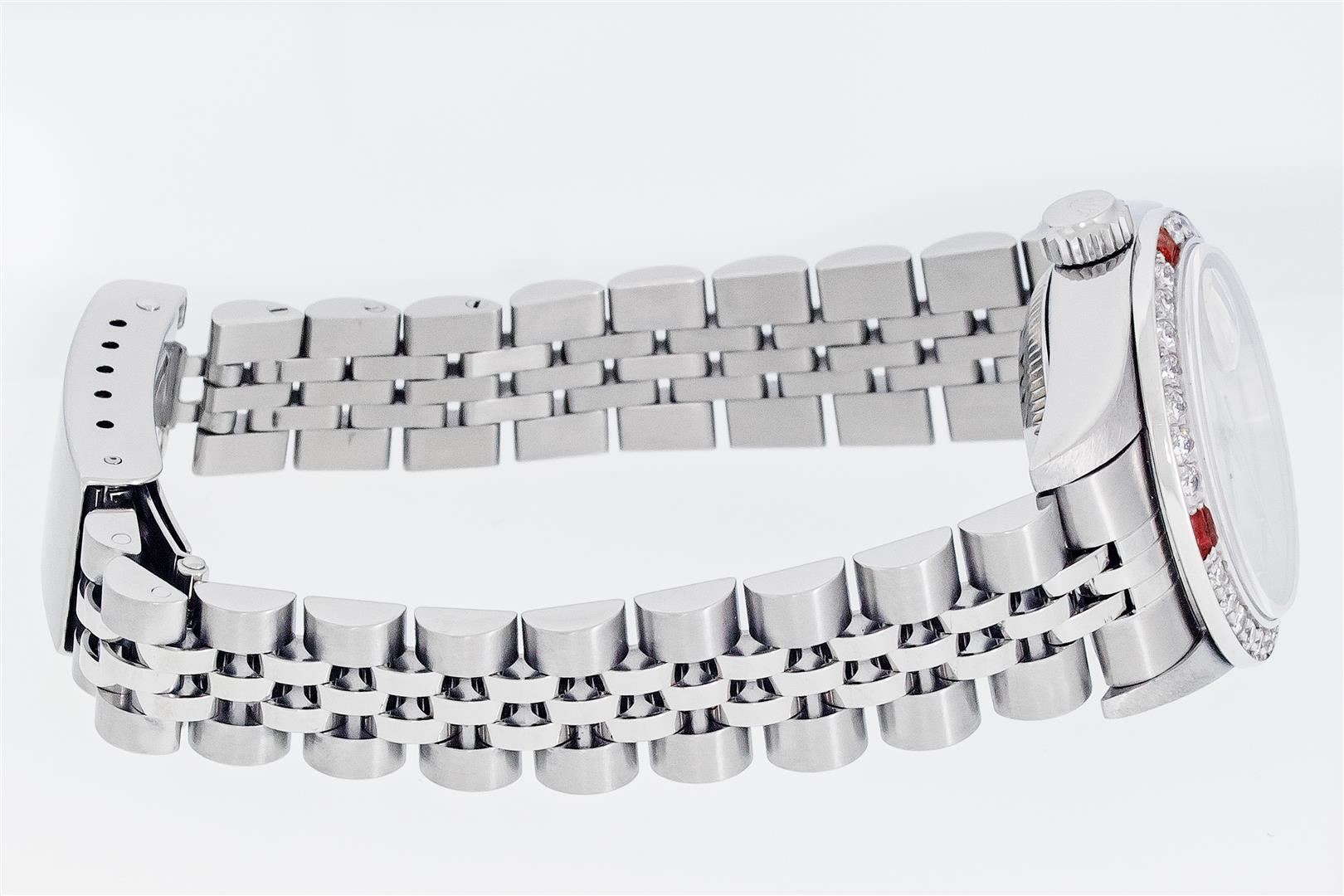 One Ladies Pre Owned Quickset Stainless Steel Rolex Datejust Polished Bright with Satin Finish, Serviced & Electronically Tested, Stainless Steel Case: 26mm, Rolex Stainless Steel Crown, Custom Bezel: New 18K White Gold Ruby Bead Set Diamond Bezel, Diamond + Gem Count: 28 Diamonds + 4 Rubies, Clarity: SI-VS, Color: G to H. Custom Crystal: New Sapphire With Magnified Date Window. Custom Hands: New Luminescent Hands. Rolex Movement: Automatic Winding Movement 2235. Rolex Dial: Silver With Index Hour Markers With Dash Track & Lumi Dot. Date Window: 3 O'Clock Position Date Display, Model: Quickset Datejust. Condition: G-6 Extra Fine. Rolex Bracelet: Stainless Steel Jubilee Band. Bright Polish & Satin Finish. 6.0 Inch Length, Adjustable. Standard Clasp, With Rolex Logo. This Watch Has Been Serviced Time Tested And Is In Excellent Condition It Is Free Of All Scratches And Dents.