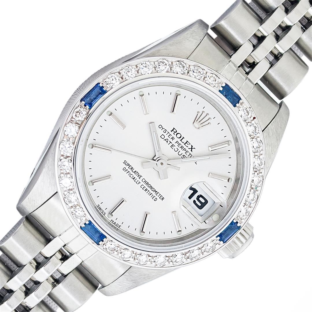 One Ladies Pre Owned Quickset Stainless Steel Rolex Datejust Polished Bright with Satin Finish, Serviced & Electronically Tested, Stainless Steel Case: 26mm, Rolex Stainless Steel Crown, Custom Bezel: New 18K White Gold Sapphire Bead Set Diamond Bezel, Diamond + Gem Count: 28 Diamonds + 4 Sapphires, Clarity: SI-VS, Color: G to H. Custom Crystal: New Sapphire With Magnified Date Window. Custom Hands: New Luminescent Hands. Rolex Movement: Automatic Winding Movement 2235. Rolex Dial: Silver With Index Hour Markers With Dash Track & Lumi Dot. Date Window: 3 O'Clock Position Date Display, Model: Quickset Datejust. Condition: G-6 Extra Fine. Rolex Bracelet: Stainless Steel Jubilee Band. Bright Polish & Satin Finish. 6.0 Inch Length, Adjustable. Standard Clasp, With Rolex Logo. This Watch Has Been Serviced Time Tested And Is In Excellent Condition It Is Free Of All Scratches And Dents.
