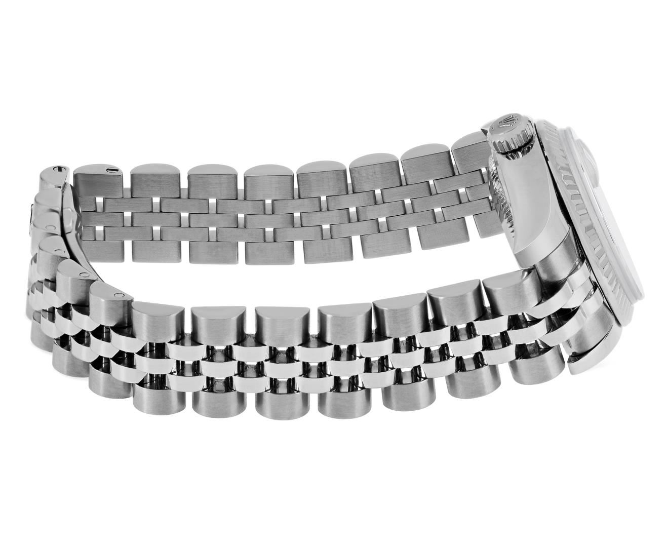 One Ladies Pre Owned Rolex Stainless Steel Datejust Wristwatch Polished Bright with Satin Finish, Serviced & Electronically Tested, Stainless Steel Case: 26mm, Stainless Steel Crown, Rolex Bezel: Rolex 18K White Gold Fluted bezel. Crystal: Sapphire With Magnified Date Window. Hands: Luminescent Hands. Rolex Movement: 2235 Automatic Winding Movement. Rolex Dial: Factory Silver With Roman Hour Markers And Dash Tracks. Date Window: 3 O'Clock Position Date Display, Model: Quickset Datejust. Condition: G-6 Extra Fine. Rolex Bracelet: Stainless Steel Jubilee Band. Bright Polish & Satin Finish. 6.0 Inch Length, Adjustable. Hidden Clasp, With Rolex Logo. This Watch Has Been Serviced And Time Tested. It Is In Excellent Condition, Free Of All Scratches And Dents. This Watch Comes With A Rolex Box.