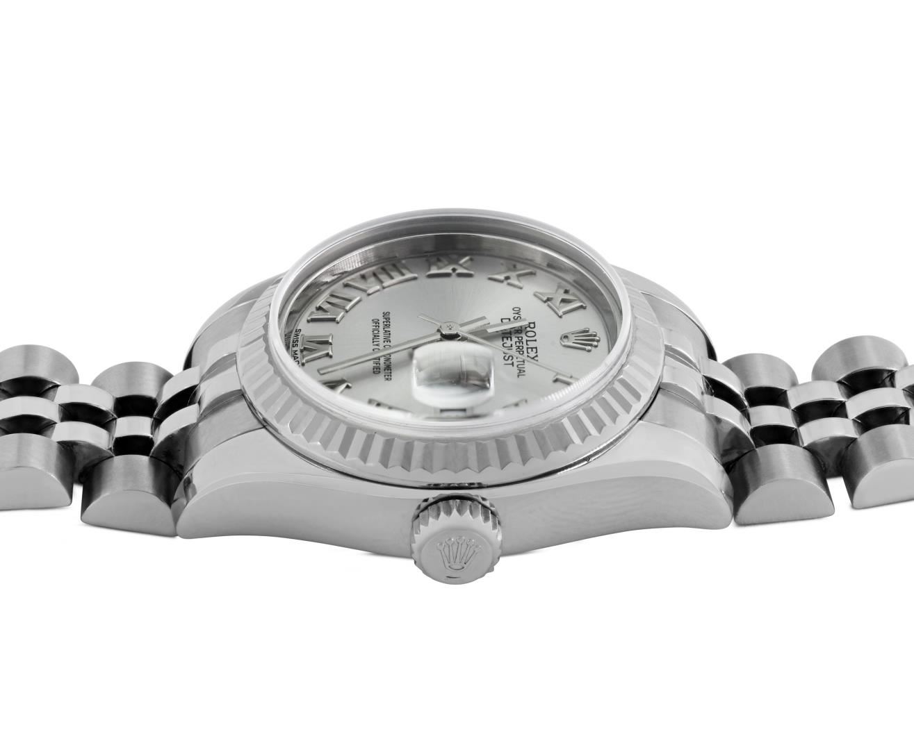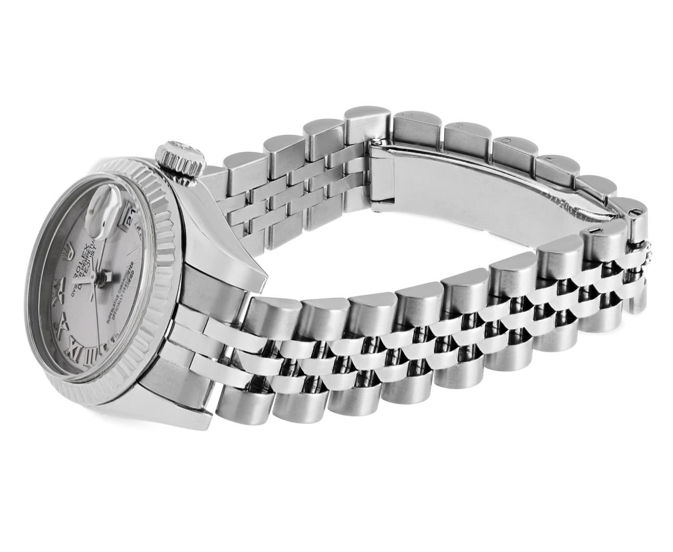 One Ladies Pre Owned Rolex Stainless Steel Datejust Wristwatch Polished Bright with Satin Finish, Serviced & Electronically Tested, Stainless Steel Case: 26mm, Stainless Steel Crown, Rolex Bezel: Rolex 18K White Gold Fluted bezel. Crystal: Sapphire With Magnified Date Window. Hands: Luminescent Hands. Rolex Movement: 2235 Automatic Winding Movement. Rolex Dial: Factory Silver With Roman Hour Markers And Dash Tracks. Date Window: 3 O'Clock Position Date Display, Model: Quickset Datejust. Condition: G-6 Extra Fine. Rolex Bracelet: Stainless Steel Jubilee Band. Bright Polish & Satin Finish. 6.0 Inch Length, Adjustable. Hidden Clasp, With Rolex Logo. This Watch Has Been Serviced And Time Tested. It Is In Excellent Condition, Free Of All Scratches And Dents. This Watch Comes With A Rolex Box.