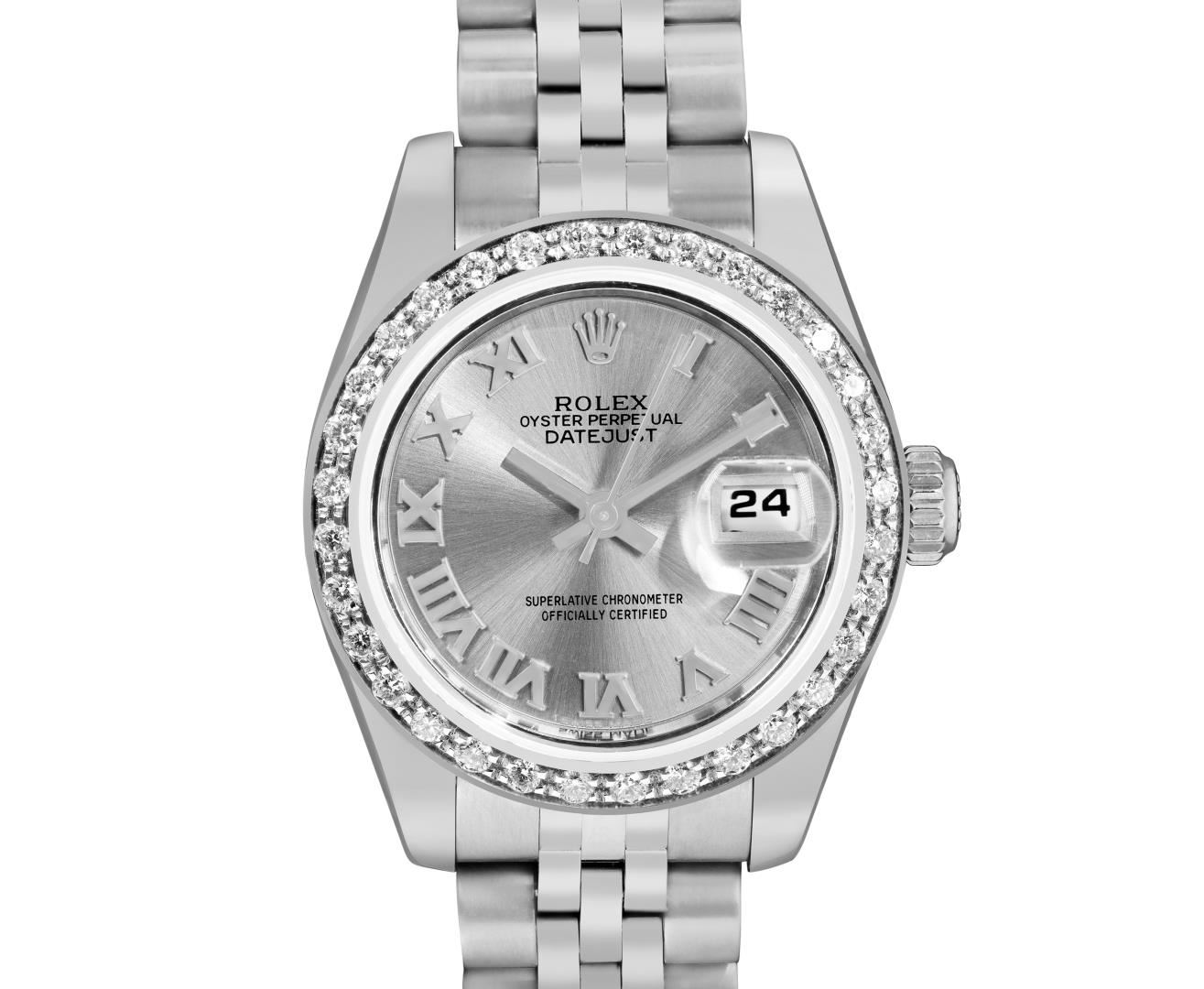 One Rolex Ladies Rolex Quickset Pre Owned Stainless Steel Date Wristwatch Polished Bright with Satin Finish, Serviced & Electronically Tested, Stainless Steel Case: 26mm, Stainless Steel Crown, Custom Bezel: New 18K White Gold Beadset Diamond Bezel, Diamond Count: 32 Diamonds. Crystal: Sapphire With Magnified Date Window. Hands: Non Luminescent Hands. Rolex Movement: 2235 Automatic Winding Movement. Rolex Dial: Factory Silver Roman Hour Markers. Date Window: 3 O'Clock Position Date Display, Model: Quickset Datejust. Condition: G-6 Extra Fine. Rolex Bracelet: Stainless Steel Jubilee Band. Bright Polish & Satin Finish. 6.0 Inch Length, Adjustable. Hidden Clasp, With Rolex Logo. This Watch Has Been Serviced And Time Tested. It Is In Excellent Condition, Free Of All Scratches And Dents. This Watch Comes With A Rolex Box.