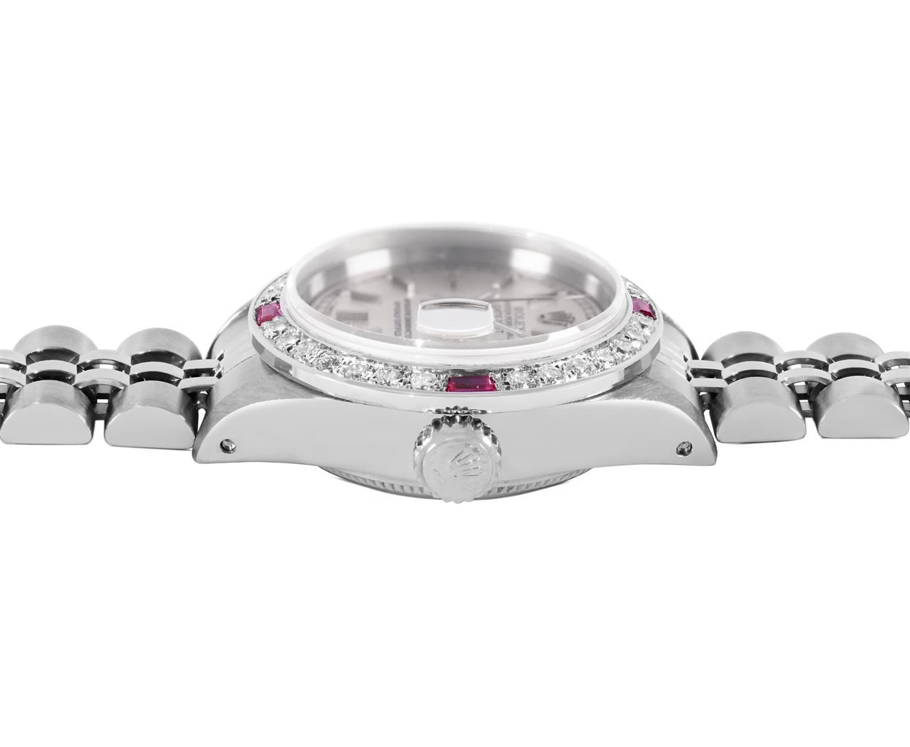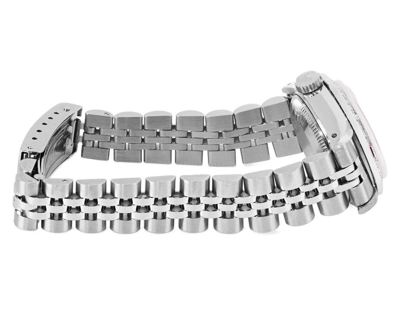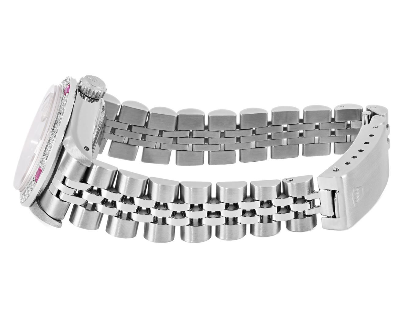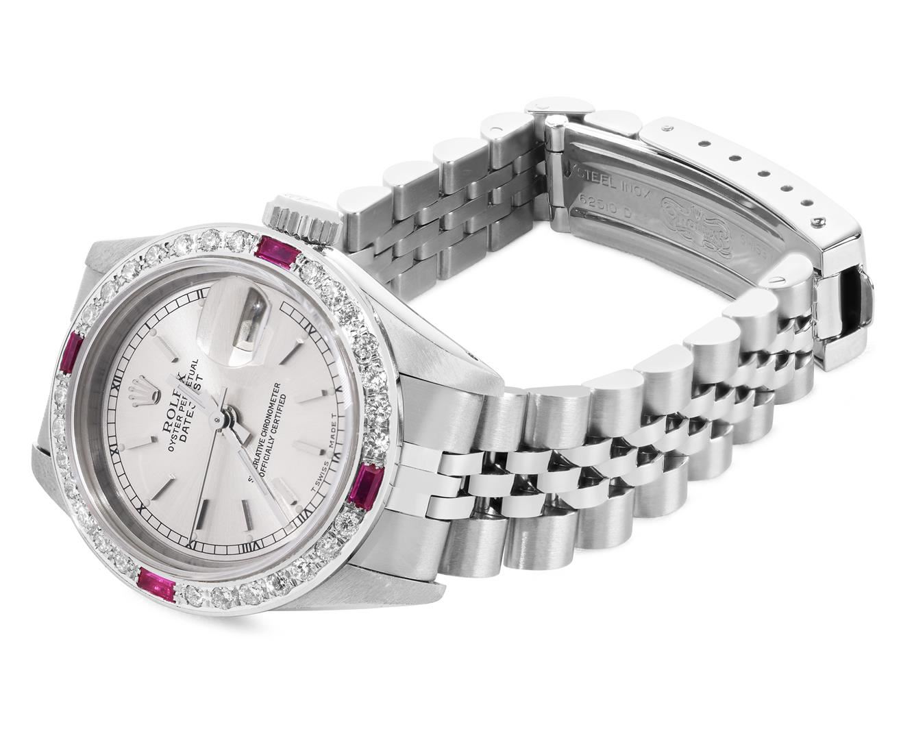 One Rolex Ladies Pre Owned Stainless Steel Datejust Wristwatch Polished Bright with Satin Finish, Serviced & Electronically Tested, Stainless Steel Case: 26mm, Stainless Steel Crown, Custom Bezel: New 18K White Gold Ruby Beadset Diamond Bezel, Diamond + Gem Count: 36 Diamonds + 4 Rubies, Clarity: SI-VS, Color: G to H. Custom Crystal: New Sapphire With Magnified Date Window. Custom Hands: New Luminescent Hands. Rolex Movement: 2135 Automatic Winding Movement. Rolex Dial: Factory Silver Dial With Index Hour Markers, Square Roman Track, and Lumi Dots. Date Window: 3 O'Clock Position Date Display, Model: Quickset Datejust. Condition: G-6 Extra Fine. Rolex Bracelet: Stainless Steel Jubilee Band. Bright Polish & Satin Finish. 6.0 Inch Length, Adjustable. Standard Clasp, With Rolex Logo. This Watch Has Been Serviced Time Tested And Is In Excellent Condition. It Is Free Of All Scratches And Dents.