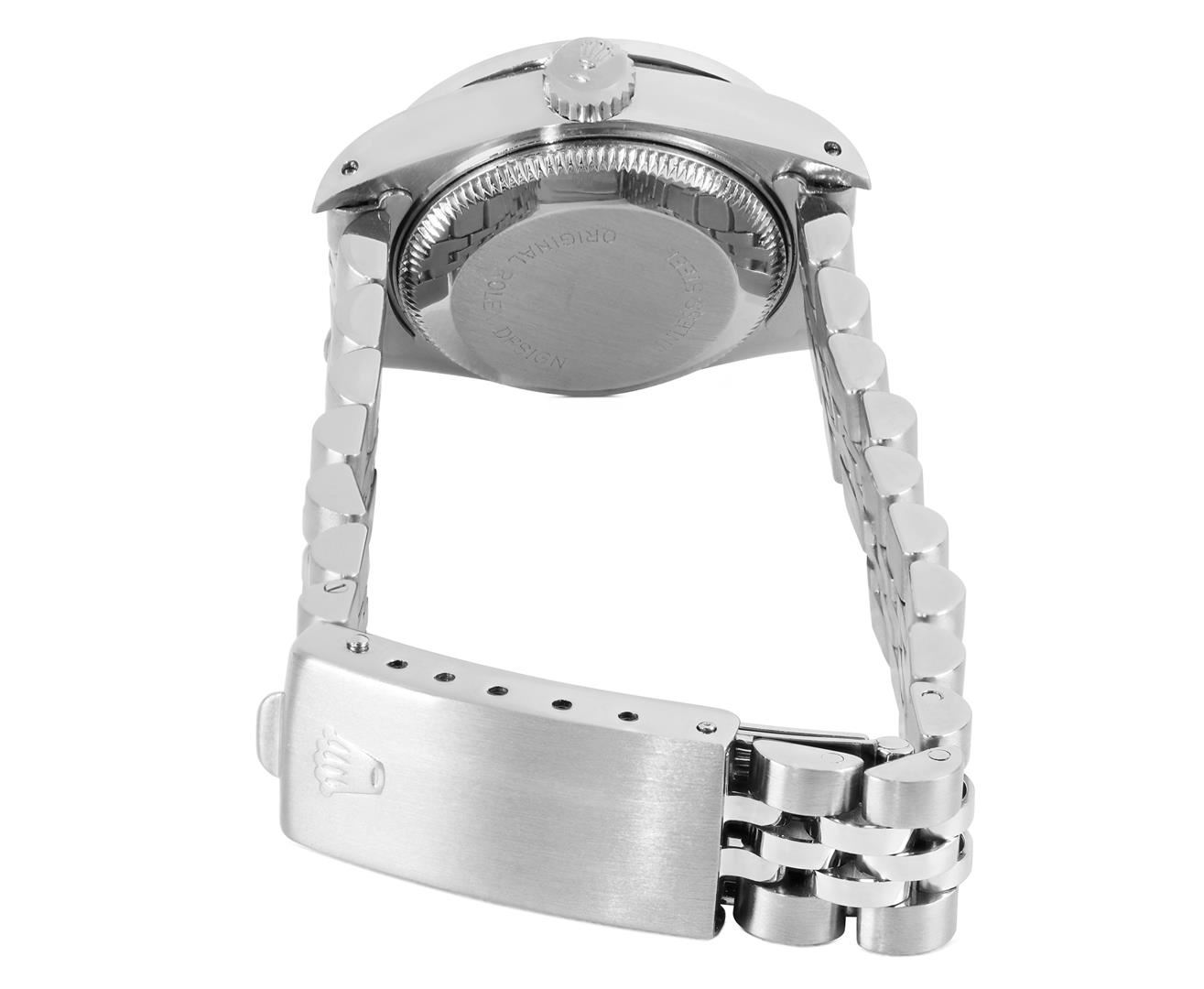 One Rolex Ladies Pre Owned Stainless Steel Datejust Wristwatch Polished Bright with Satin Finish, Serviced & Electronically Tested, Stainless Steel Case: 26mm, Stainless Steel Crown, Custom Bezel: New 18K White Gold Ruby Beadset Diamond Bezel, Diamond + Gem Count: 36 Diamonds + 4 Rubies, Clarity: SI-VS, Color: G to H. Custom Crystal: New Sapphire With Magnified Date Window. Custom Hands: New Luminescent Hands. Rolex Movement: 2135 Automatic Winding Movement. Rolex Dial: Factory Silver Dial With Index Hour Markers, Square Roman Track, and Lumi Dots. Date Window: 3 O'Clock Position Date Display, Model: Quickset Datejust. Condition: G-6 Extra Fine. Rolex Bracelet: Stainless Steel Jubilee Band. Bright Polish & Satin Finish. 6.0 Inch Length, Adjustable. Standard Clasp, With Rolex Logo. This Watch Has Been Serviced Time Tested And Is In Excellent Condition. It Is Free Of All Scratches And Dents.