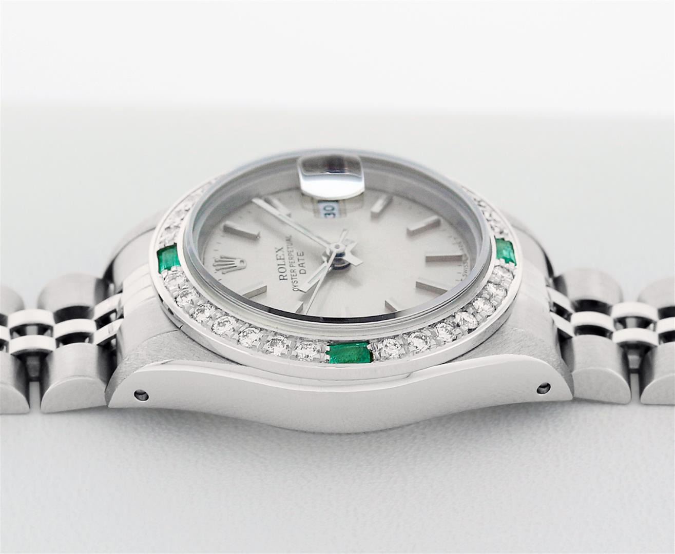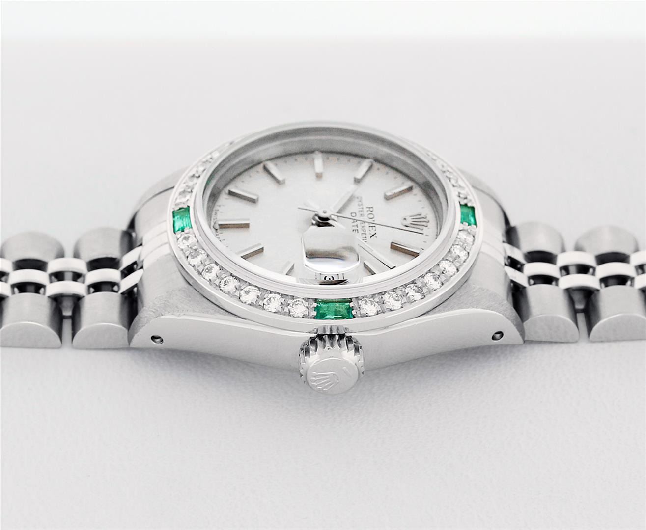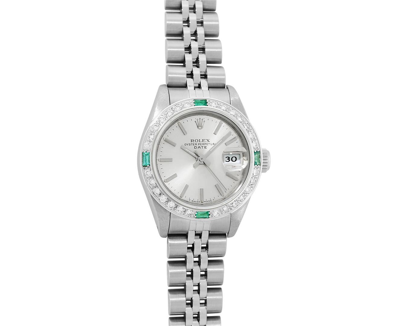 One Ladies Pre Owned Quickset Stainless Steel Rolex Datejust Polished Bright with Satin Finish, Serviced & Electronically Tested, Rolex Stainless Steel Case: 26mm, Rolex Stainless Steel Crown, Custom Bezel: 18K White Gold Beadset Emerald Bezel, Stone Count: 28 Diamonds + 4 Emeralds, Diamond Color: G To H, Clarity: SI-VS. Custom Crystal: New Sapphire With Magnified Date Window. Custom Hands: New Luminescent Hands. Rolex Movement: Quickset Automatic Winding Movement 2130. Rolex Dial: Silver Index Dial With Luminescent Dots & Dash Track. Date Window: 3 O'Clock Position Date Display, Model: Sapphire Quickset Datejust. Condition: G-6 Extra Fine. Rolex Bracelet: Stainless Steel Jubilee Band. Bright Polish & Satin Finish. 6.0 Inch Length, Adjustable. Standard Clasp, With Rolex Logo. This Watch Has Been Serviced Time Tested And Is In Excellent Condition It Is Free Of All Scratches And Dents.
