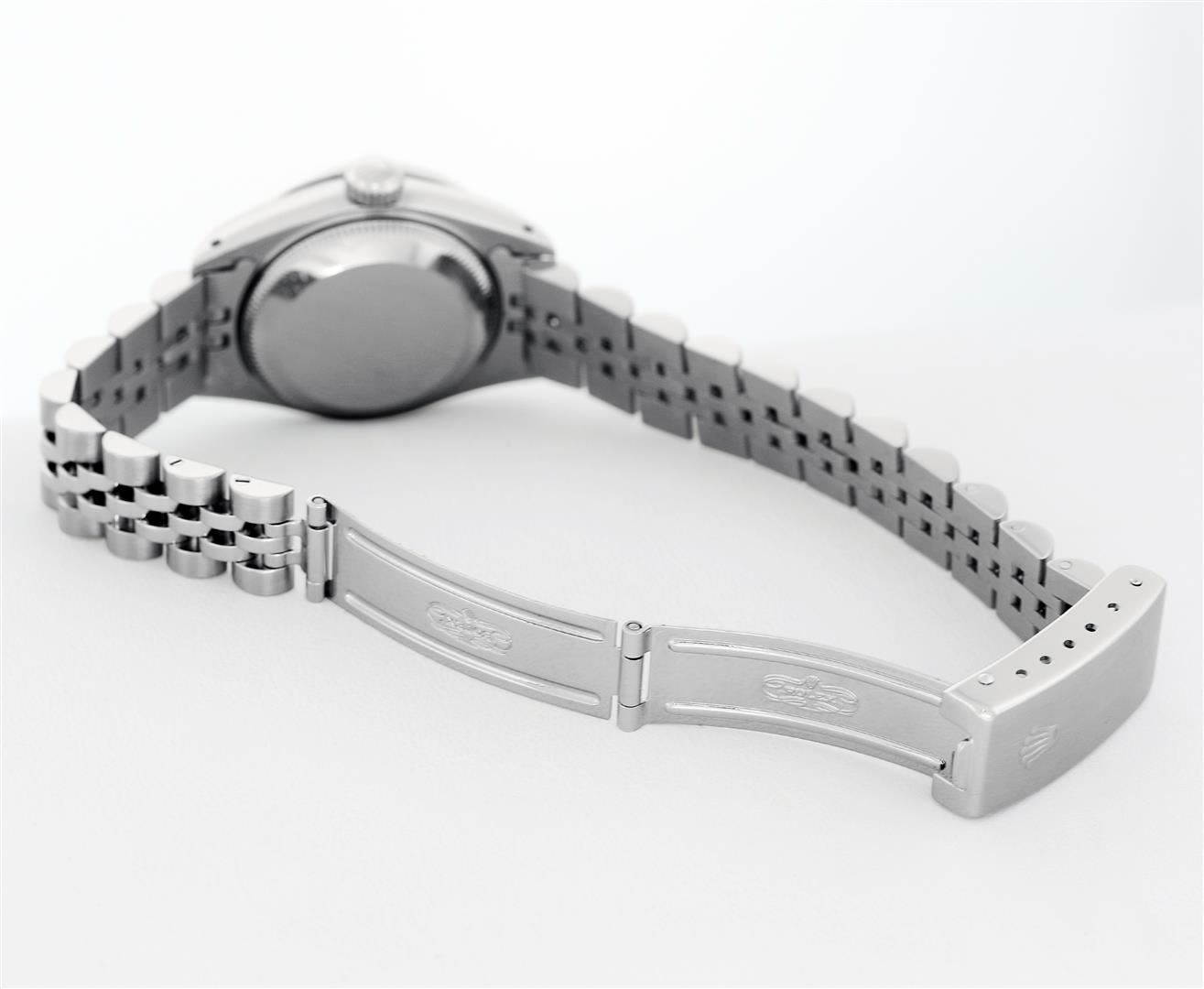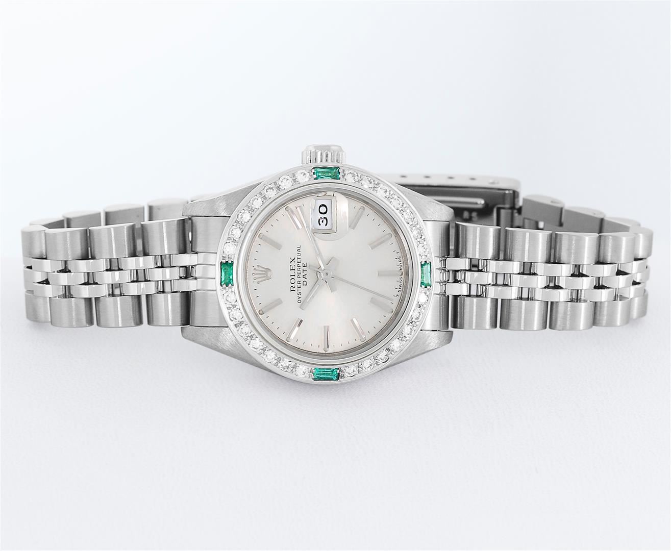 One Ladies Pre Owned Quickset Stainless Steel Rolex Datejust Polished Bright with Satin Finish, Serviced & Electronically Tested, Rolex Stainless Steel Case: 26mm, Rolex Stainless Steel Crown, Custom Bezel: 18K White Gold Beadset Emerald Bezel, Stone Count: 28 Diamonds + 4 Emeralds, Diamond Color: G To H, Clarity: SI-VS. Custom Crystal: New Sapphire With Magnified Date Window. Custom Hands: New Luminescent Hands. Rolex Movement: Quickset Automatic Winding Movement 2130. Rolex Dial: Silver Index Dial With Luminescent Dots & Dash Track. Date Window: 3 O'Clock Position Date Display, Model: Sapphire Quickset Datejust. Condition: G-6 Extra Fine. Rolex Bracelet: Stainless Steel Jubilee Band. Bright Polish & Satin Finish. 6.0 Inch Length, Adjustable. Standard Clasp, With Rolex Logo. This Watch Has Been Serviced Time Tested And Is In Excellent Condition It Is Free Of All Scratches And Dents.